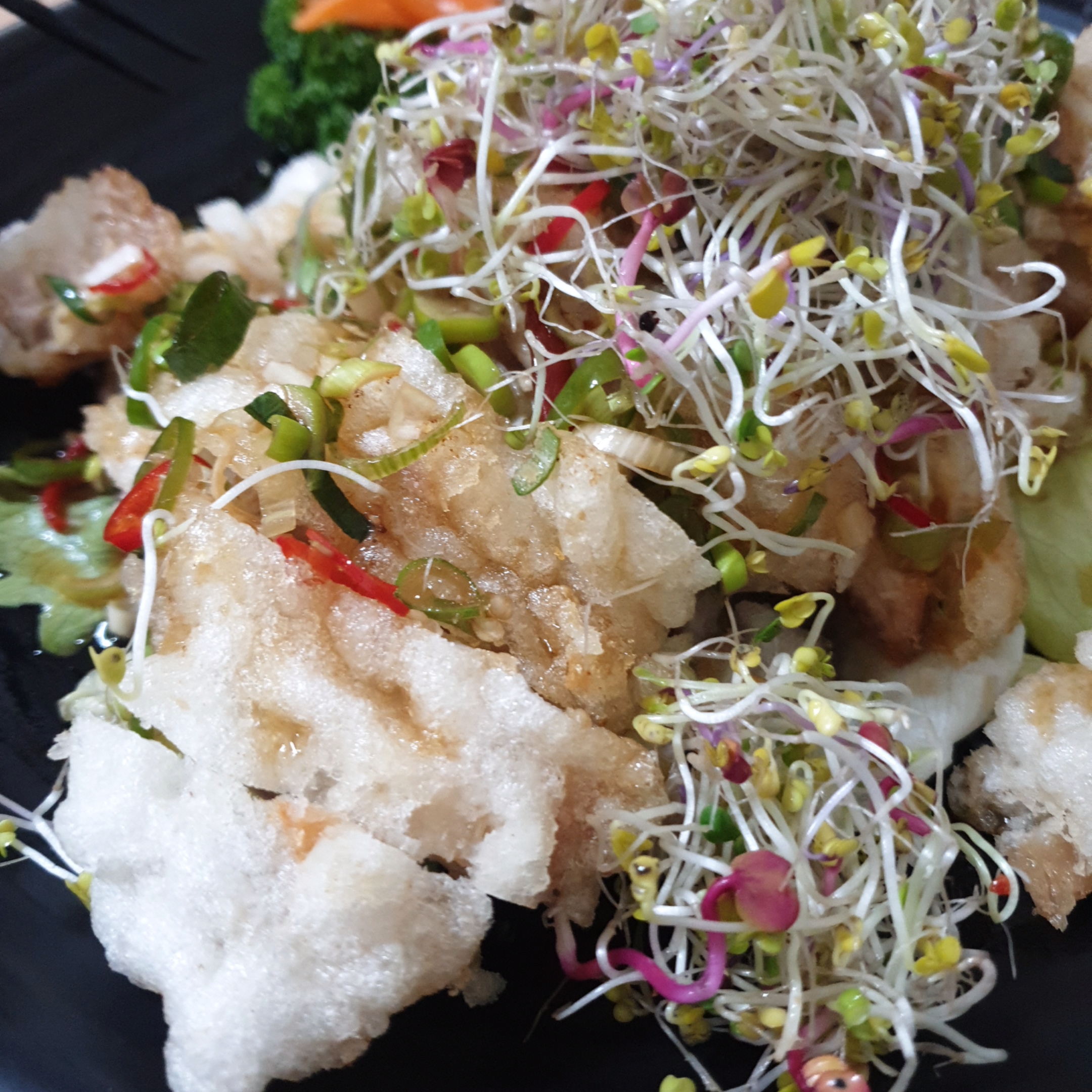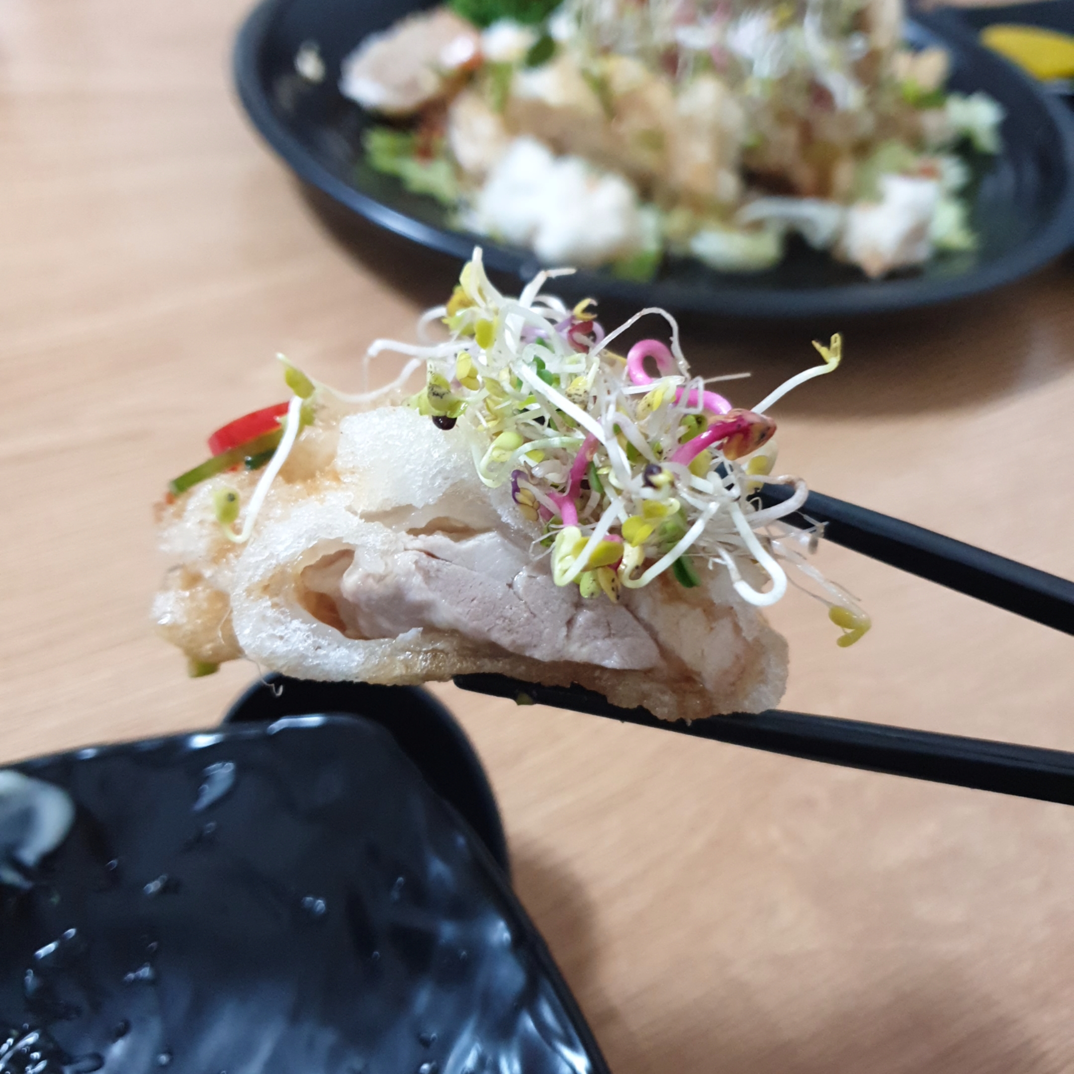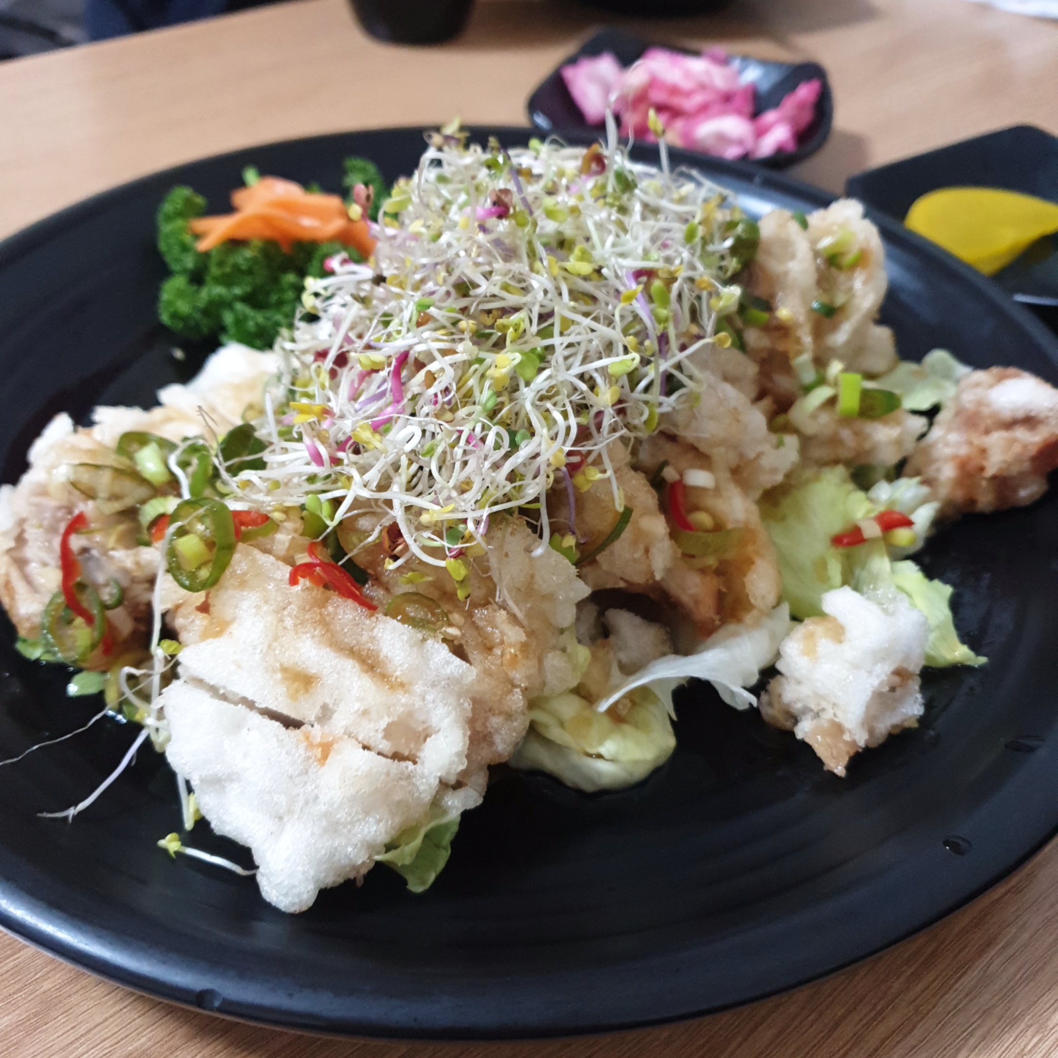 새콤달콤 소스와 바삭쫀득 튀김옷에 육향 진하게 나는 고기와 쌉싸래한 새싹까지.