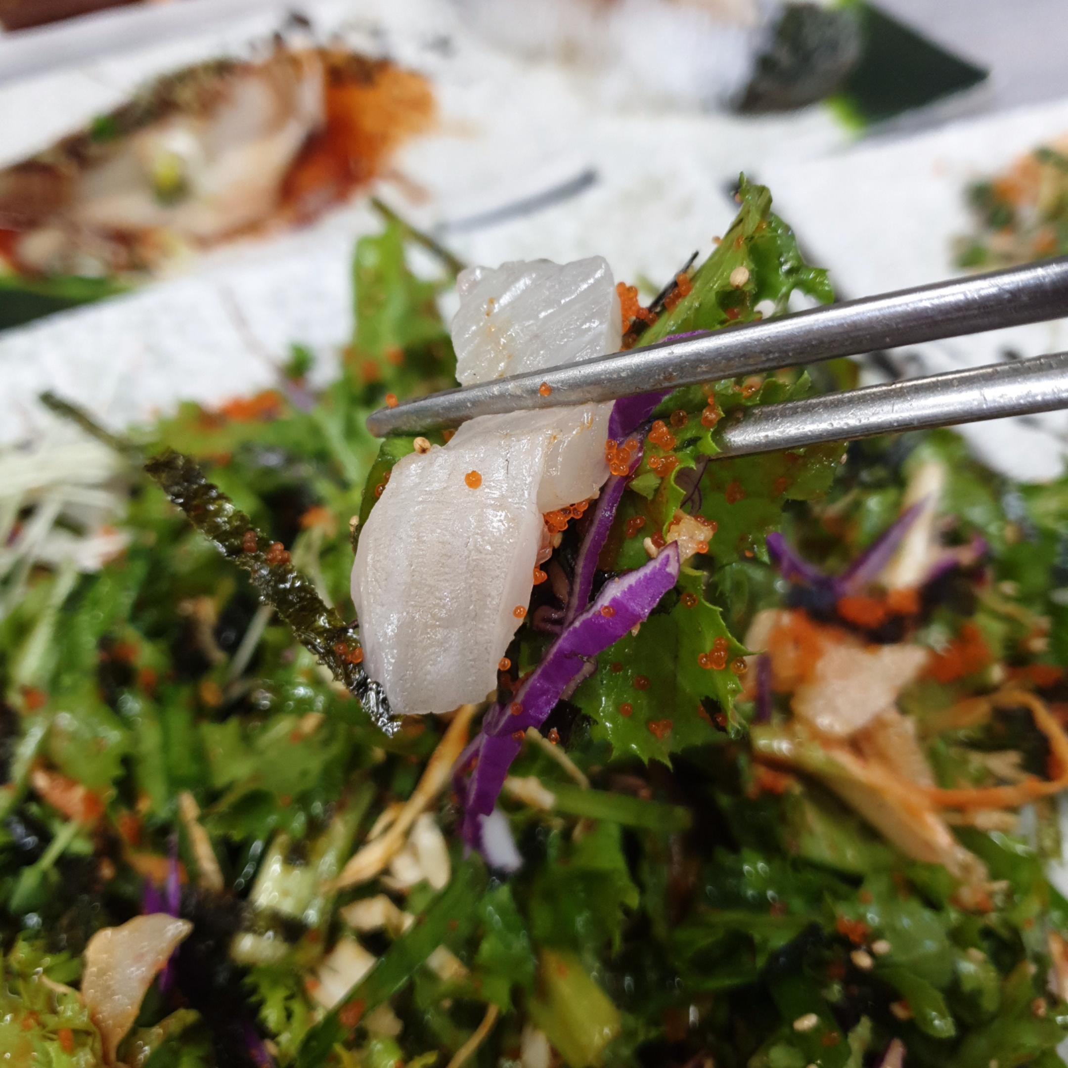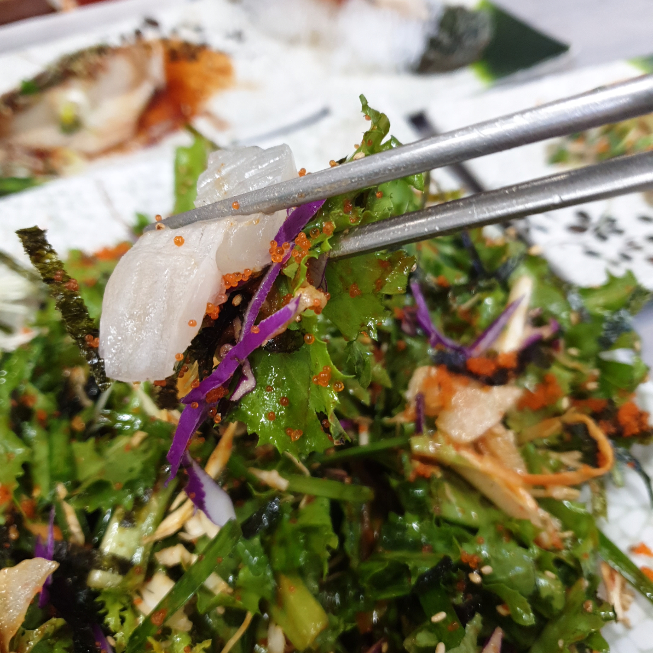 야채무침이 안에 뭔진 모르겠지만 쌉싸름한 맛이 나는 야채가 중간중간 섞여있어서, 회가 살짝 기름질 것 같은 맛을 중간중간 야채가 잡아줘서 좋았고, 김가루와 참기름 등의 꼬소름한 맛이 은은하게 올라오는게 회와 아주 잘 어울렸습니다.