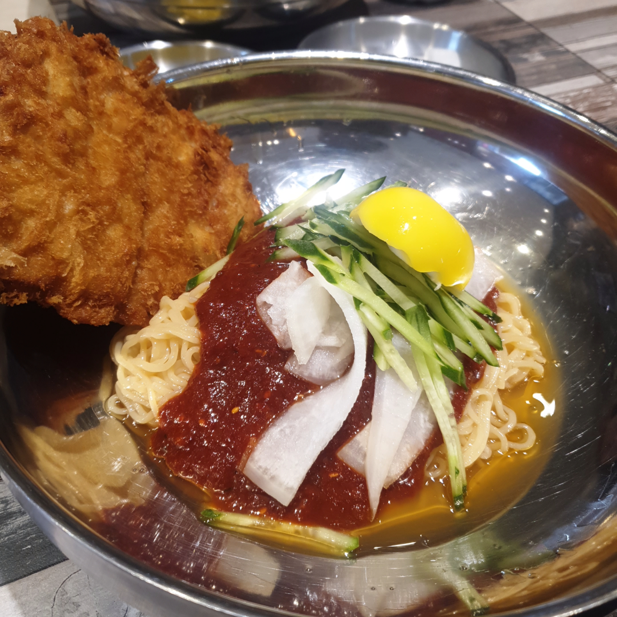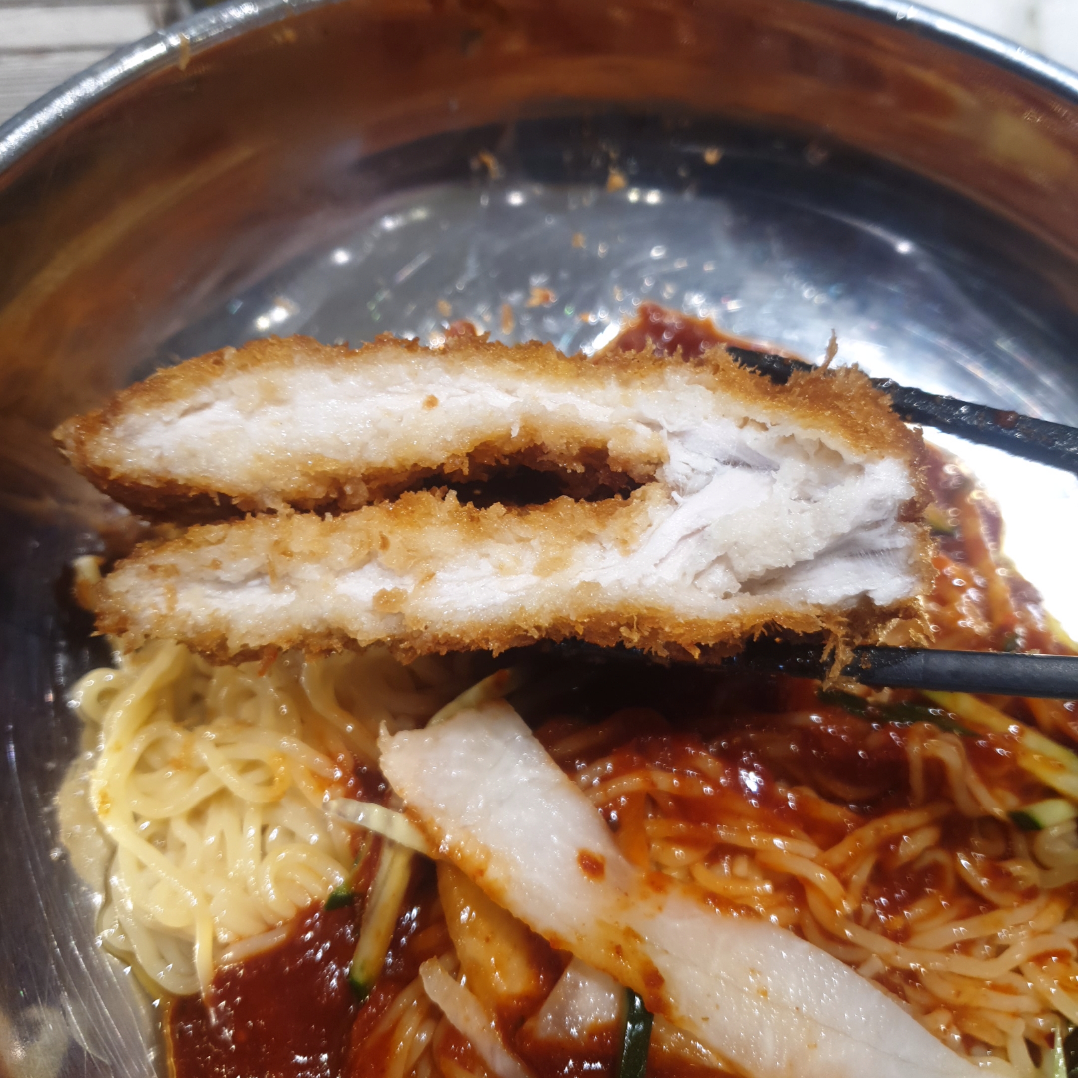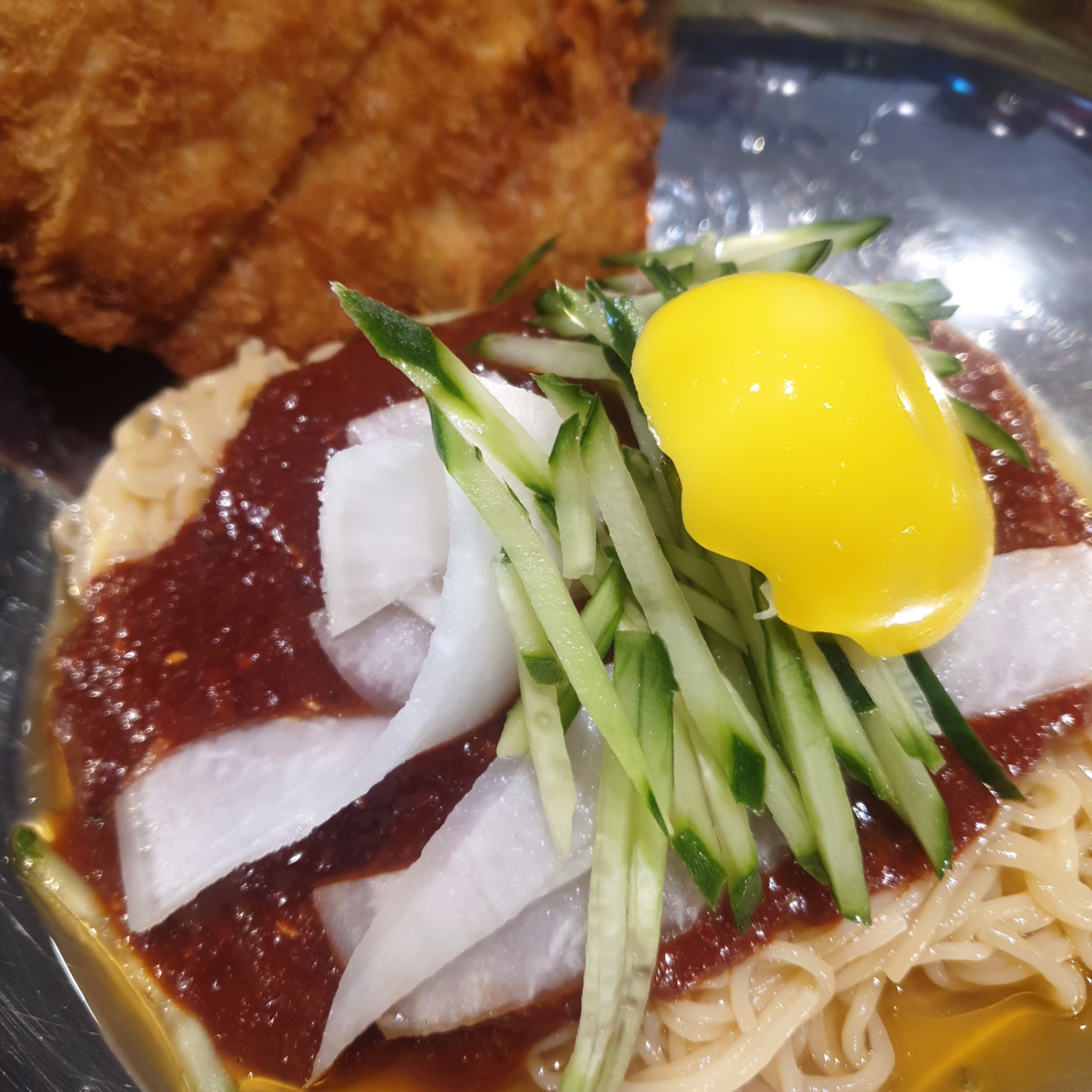 이 영롱한 그릇과 밀면 색과 돈까스의 때깔을 한번 보세요 ㅎ.ㅎ