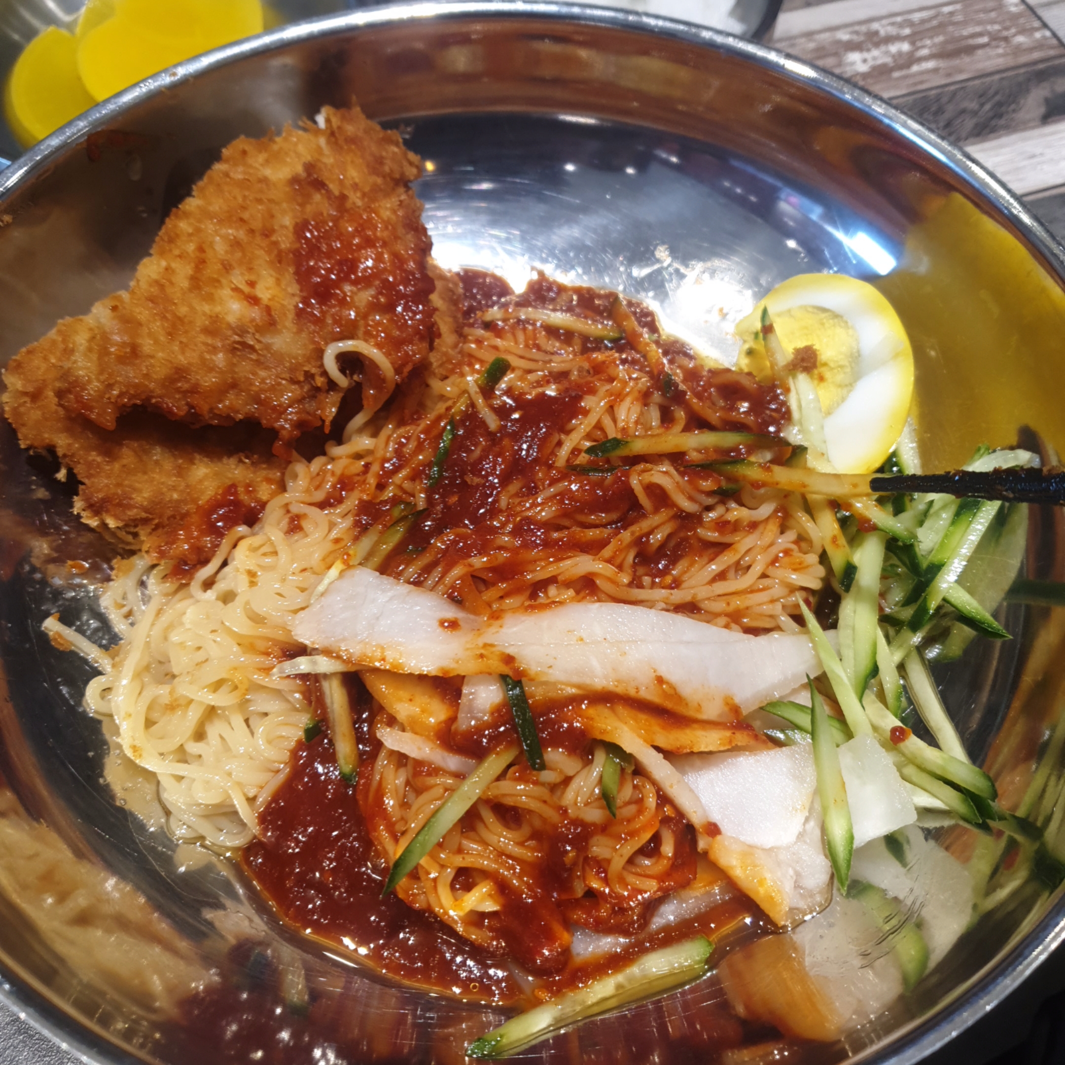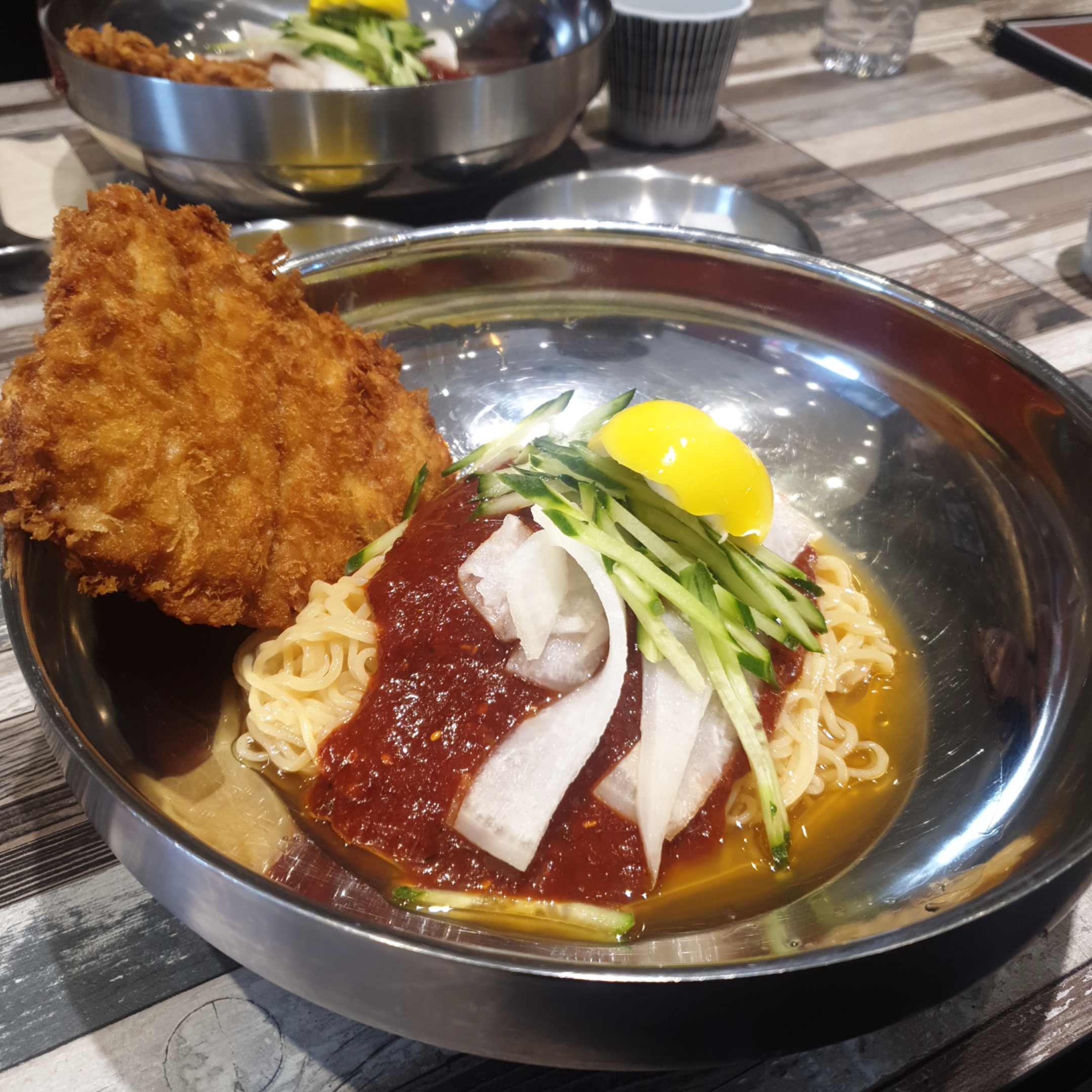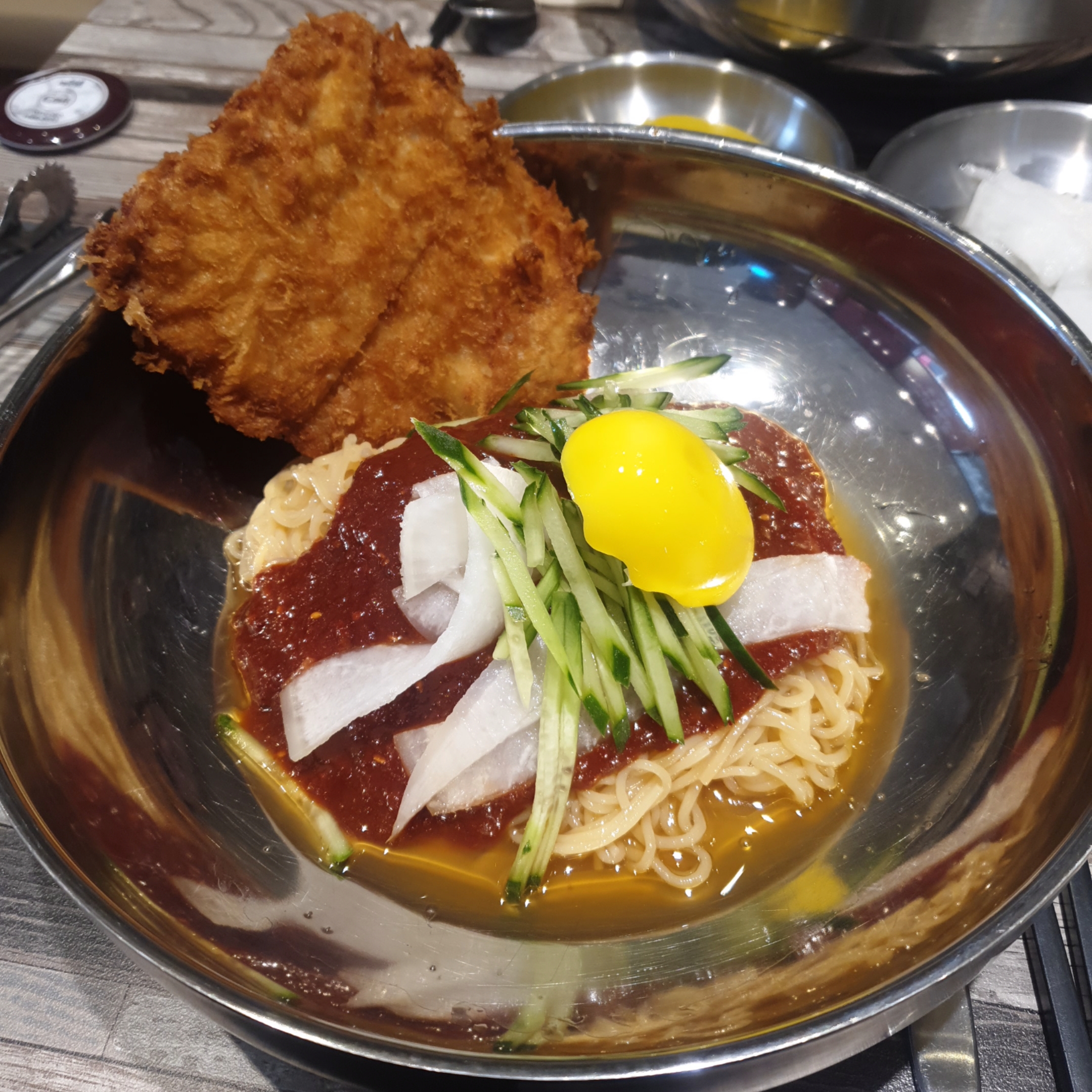 이 영롱한 그릇과 밀면 색과 돈까스의 때깔을 한번 보세요 ㅎ.ㅎ