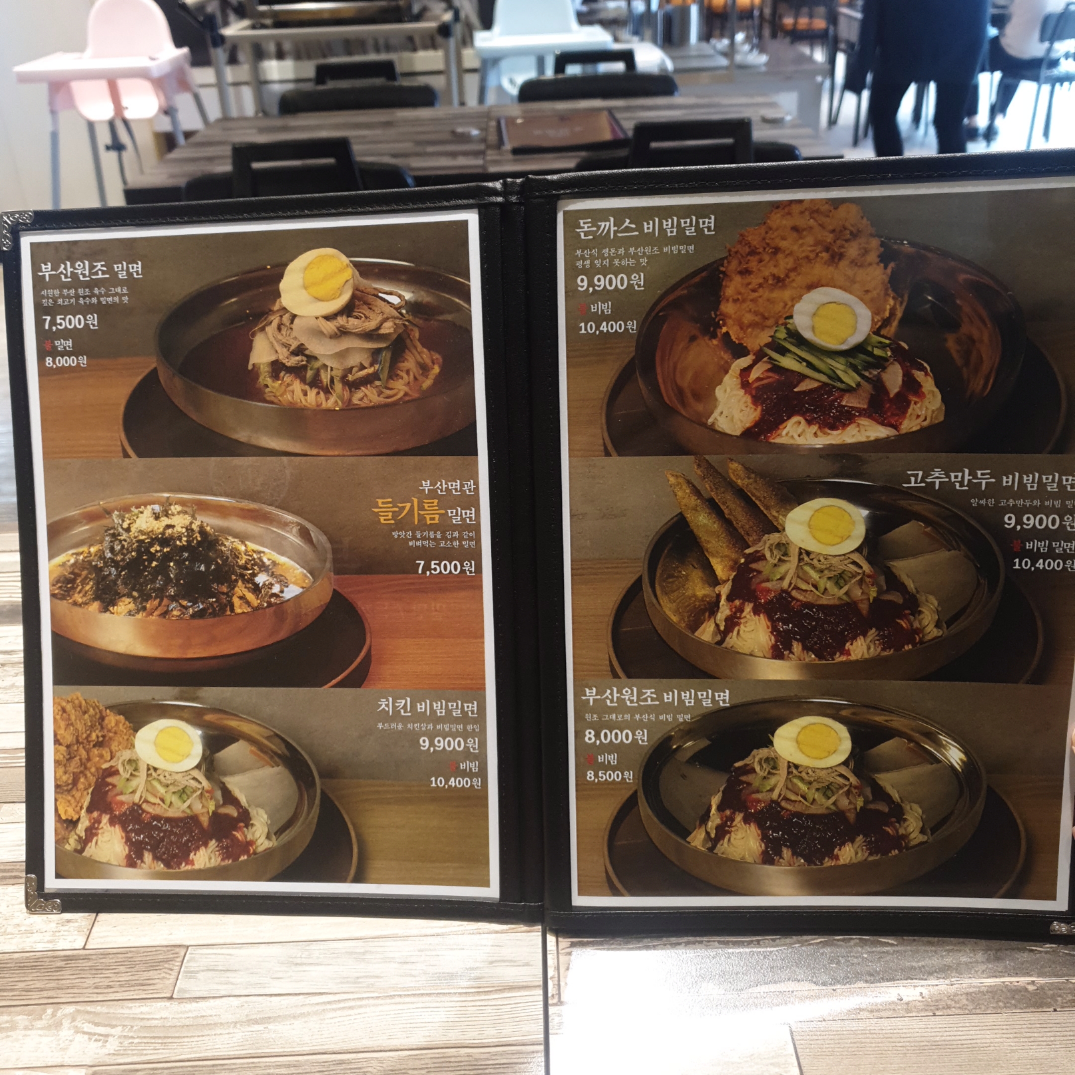 부산원조밀면, 들기름밀면, 치킨비빔밀면, 돈까스비빔밀면, 고추만두비빔밀면에 부산원조비빔밀면까지!