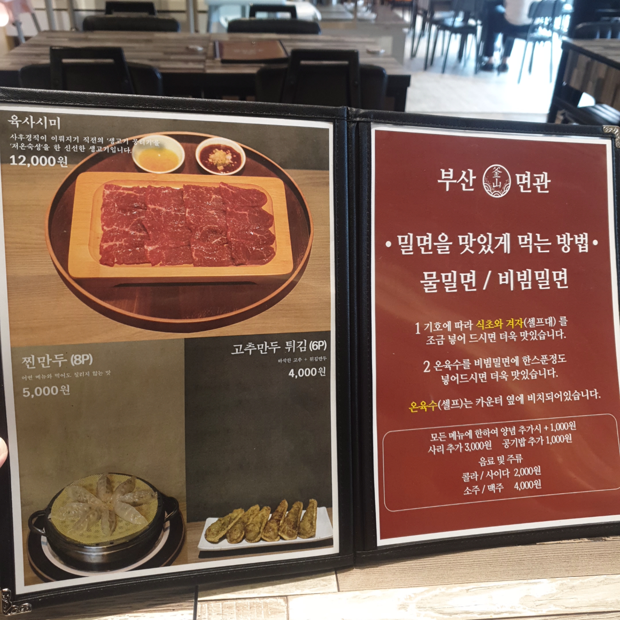 인터넷에서 검색해보고선, 저 '생파돈까스'가 정말정말 궁금했는데, 처음 가는 날이니 밀면을 먹어보기로 하고, 아쉬움을 뒤로하고 메뉴판을 넘겼습니다.
