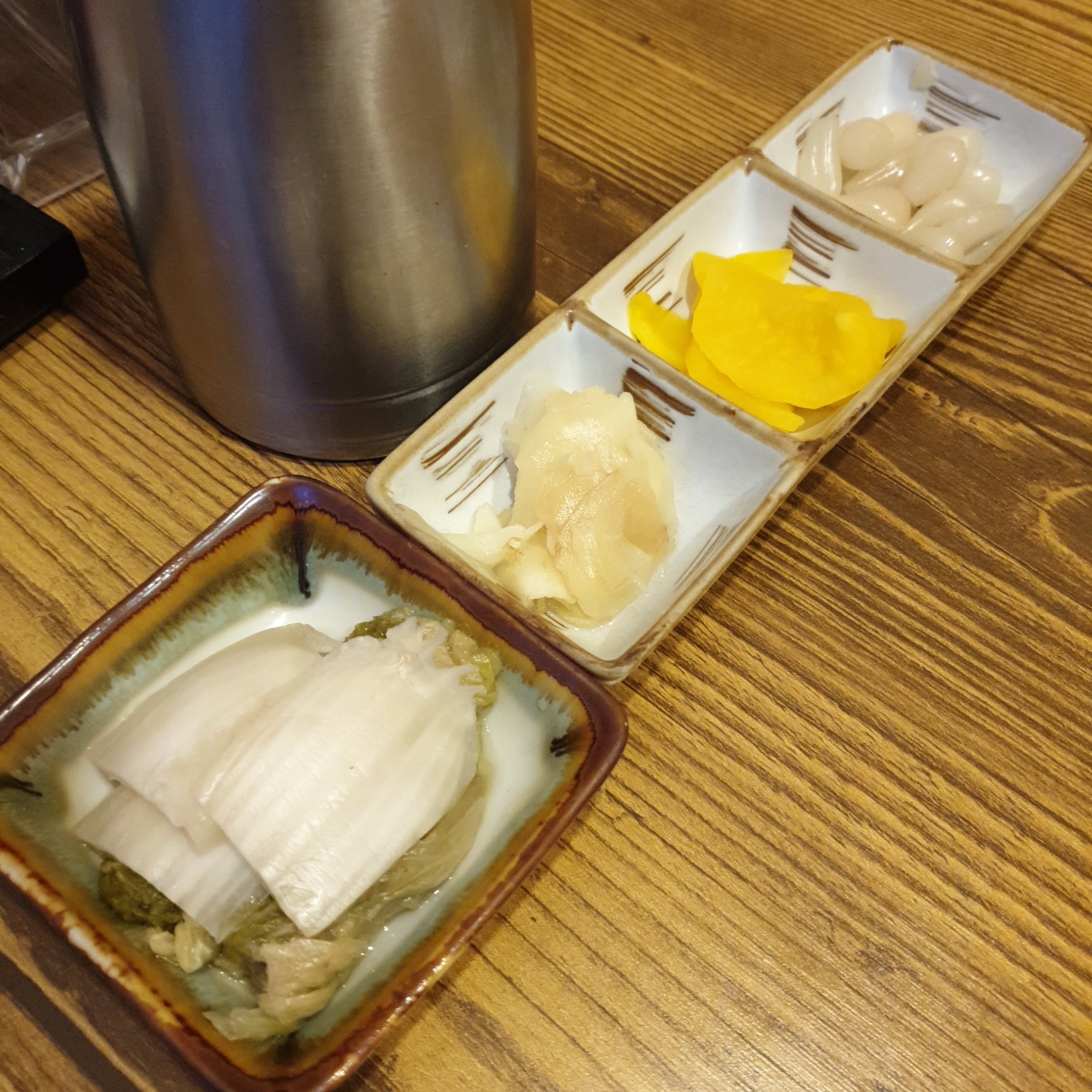 기본적으로 참치의 느낀한 맛을 잡을 수 있는 물김치, 초생강, 단무지 등과