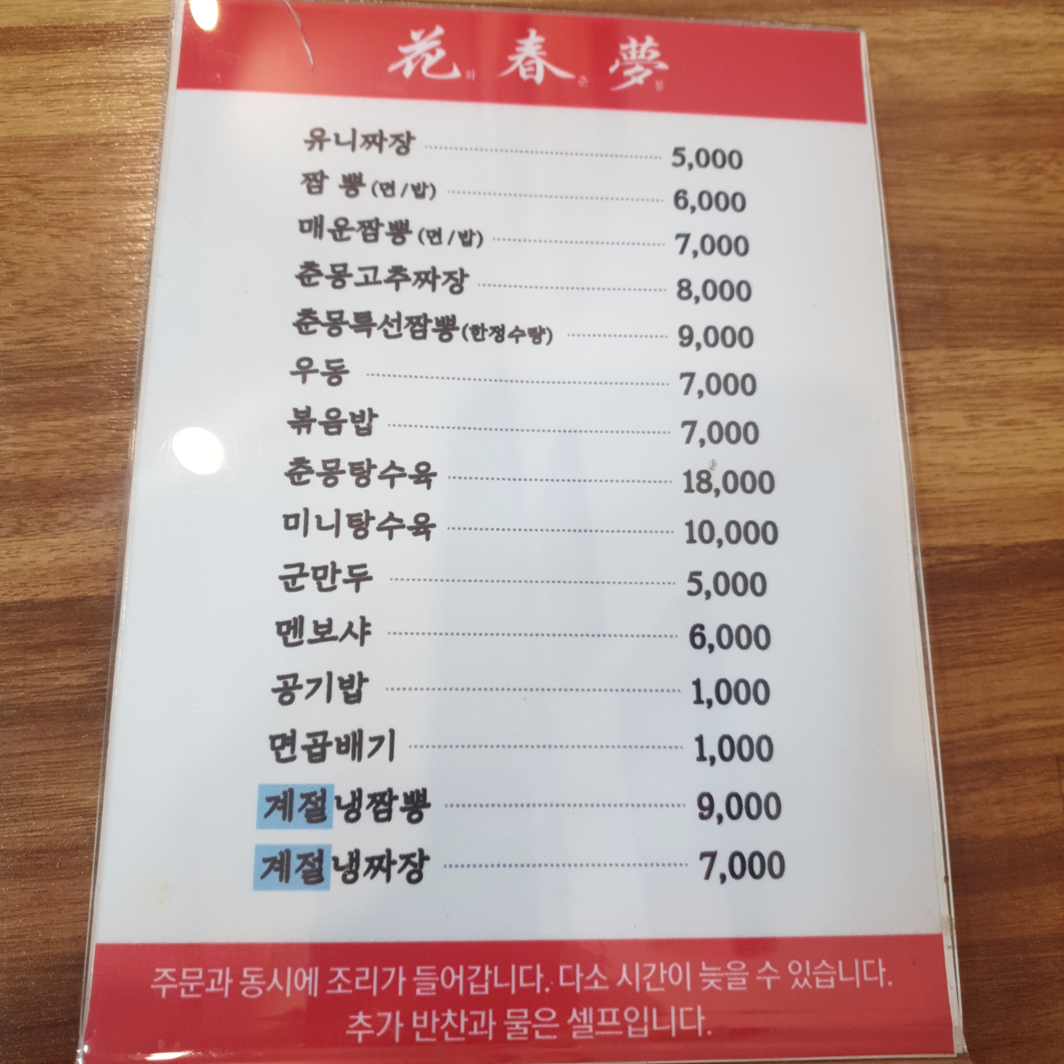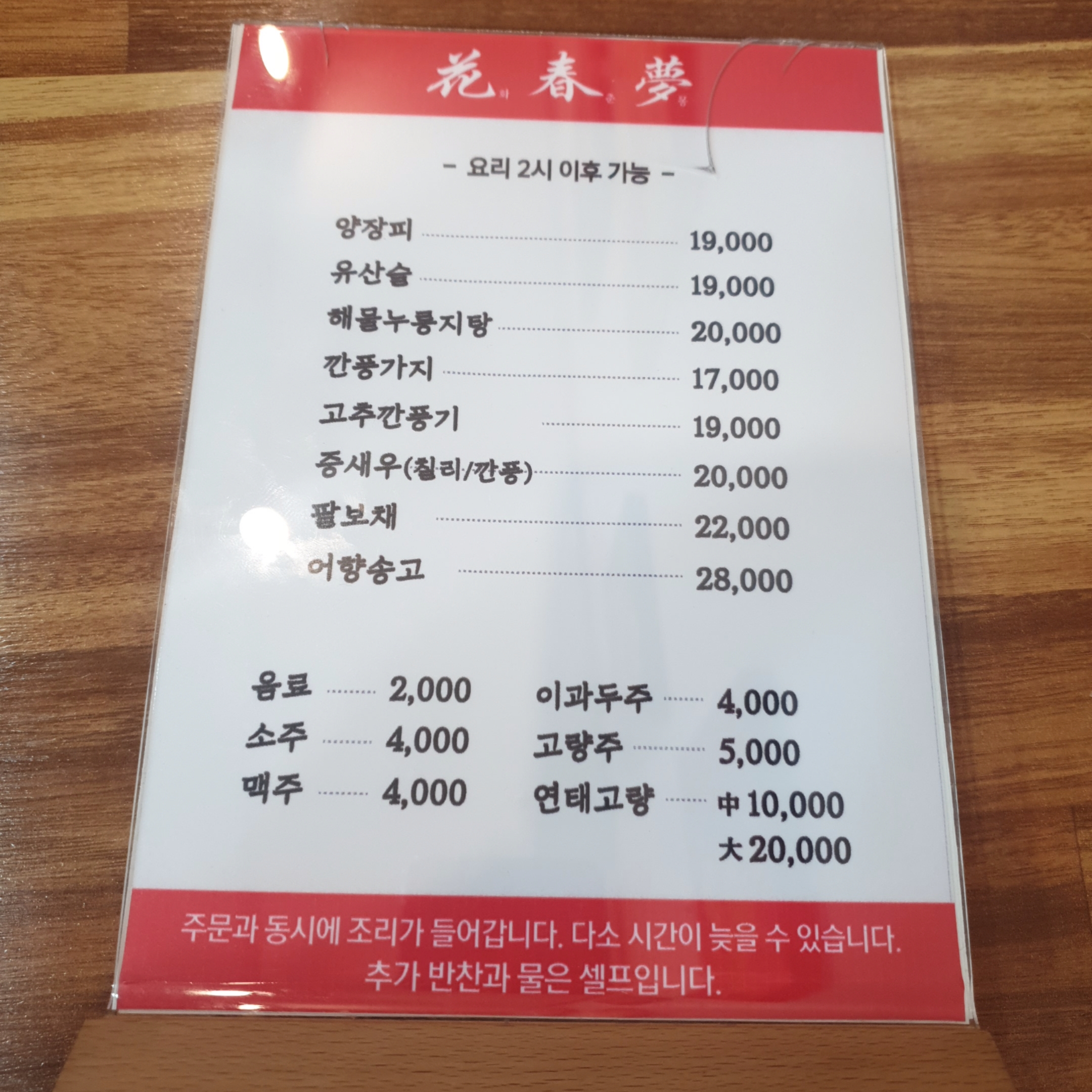 화춘몽 메뉴입니다.