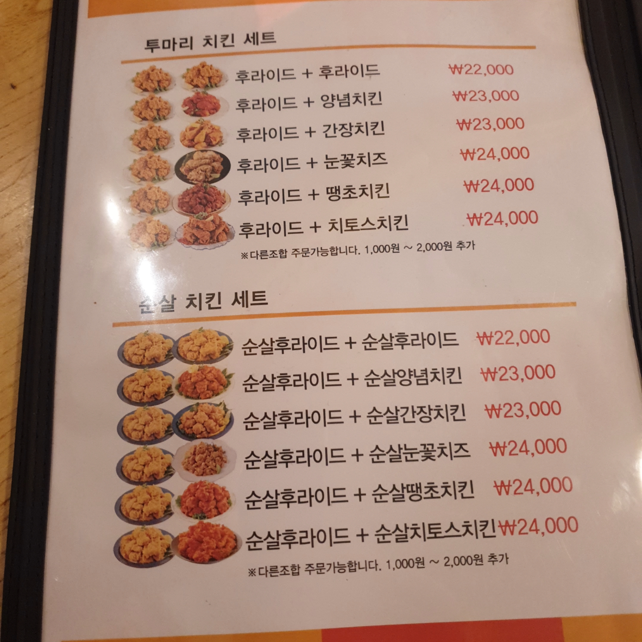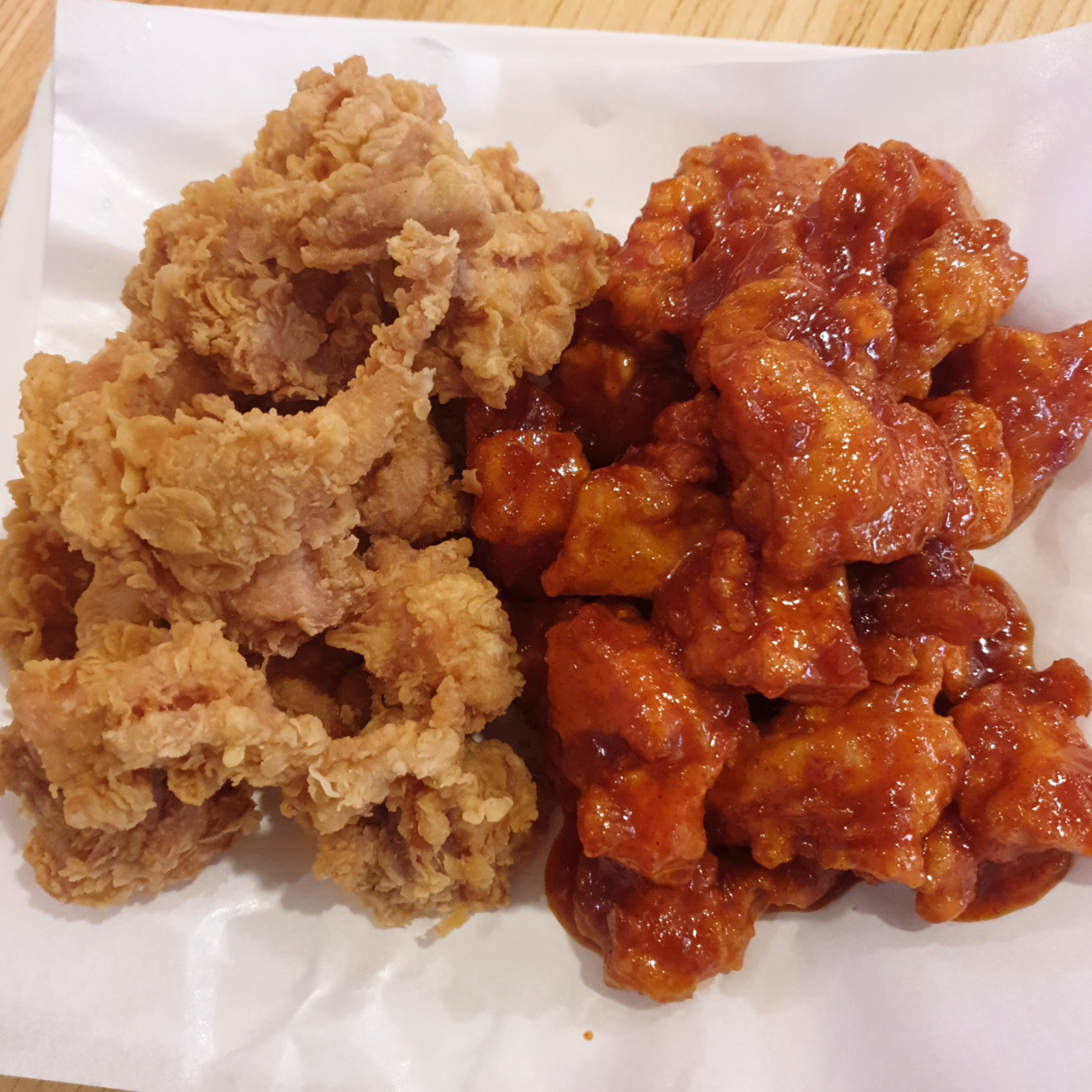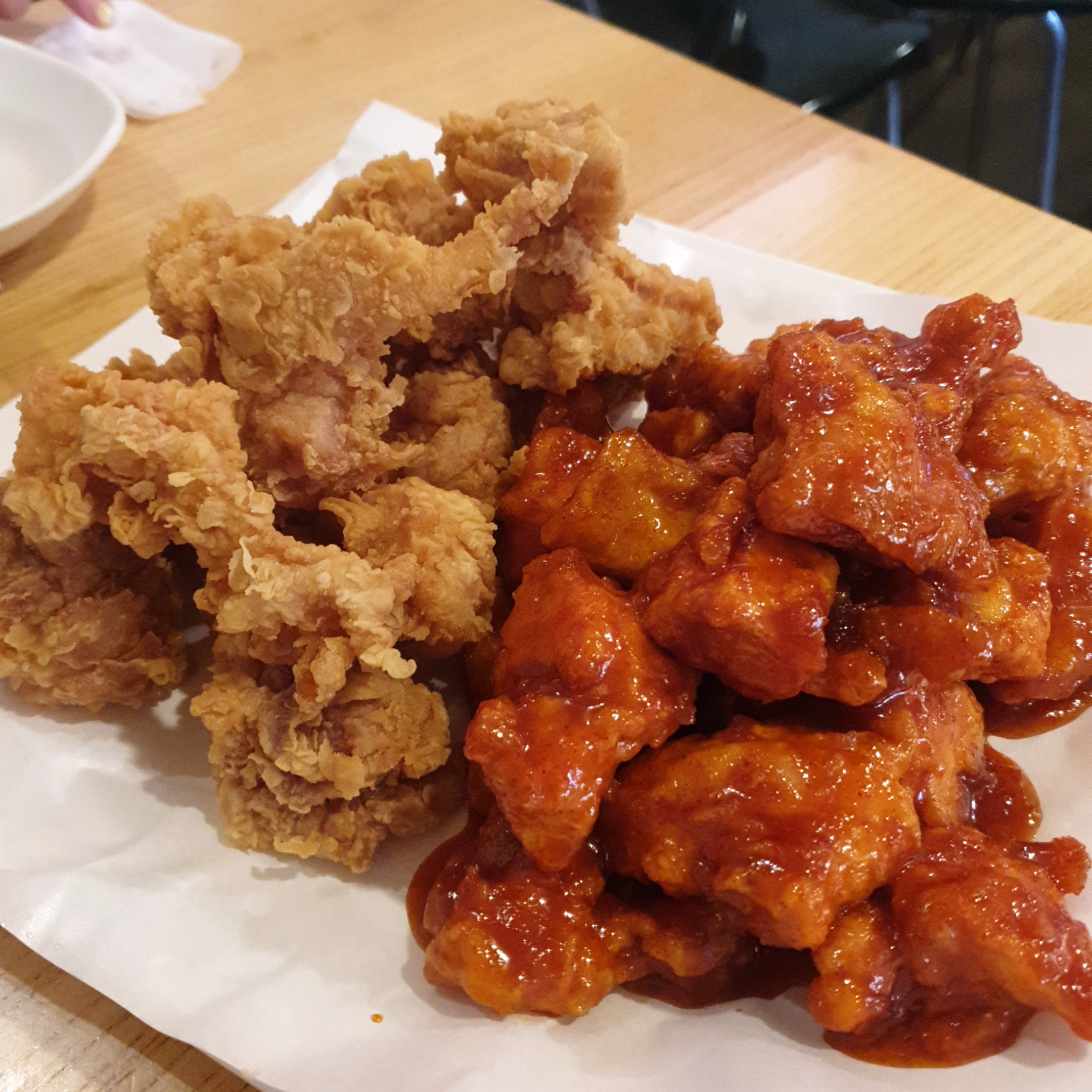 눈꽃치즈, 땡초 등 궁금한 맛이 많았지만 오랫만에 갔으니 순살후라이드+순살양념치킨 으로 클래식하게 시켰습니다~ㅎ