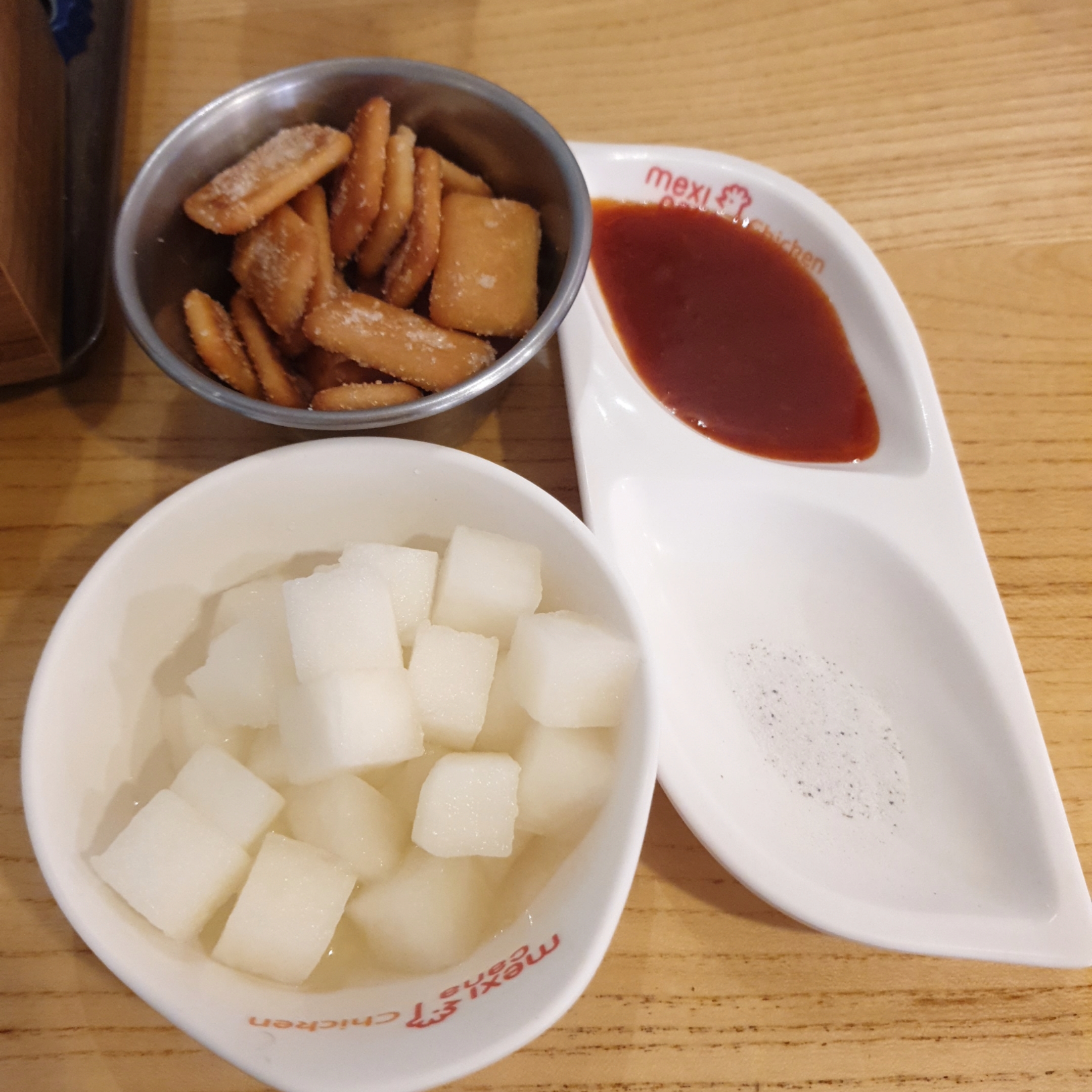기본적으로 소금, 양념치킨 소스, 치킨무, 그리고 건빵튀김이 나옵니다.