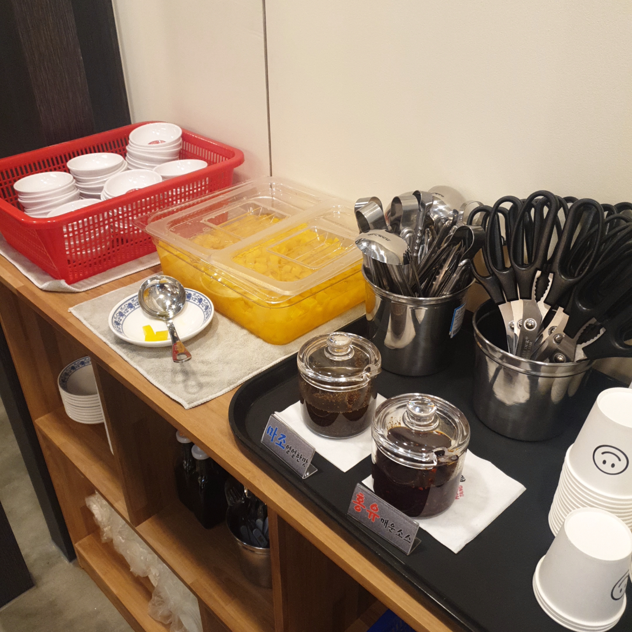 셀프바엔 단무지와 소스가 준비되어 있습니다.