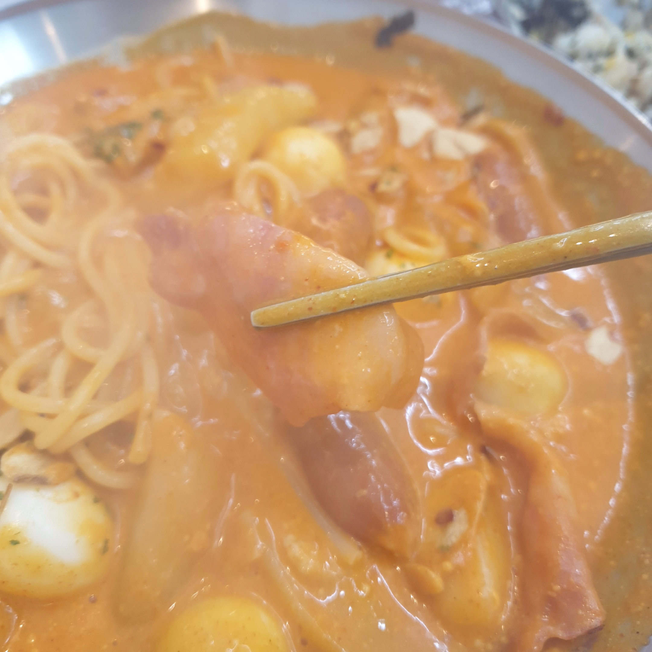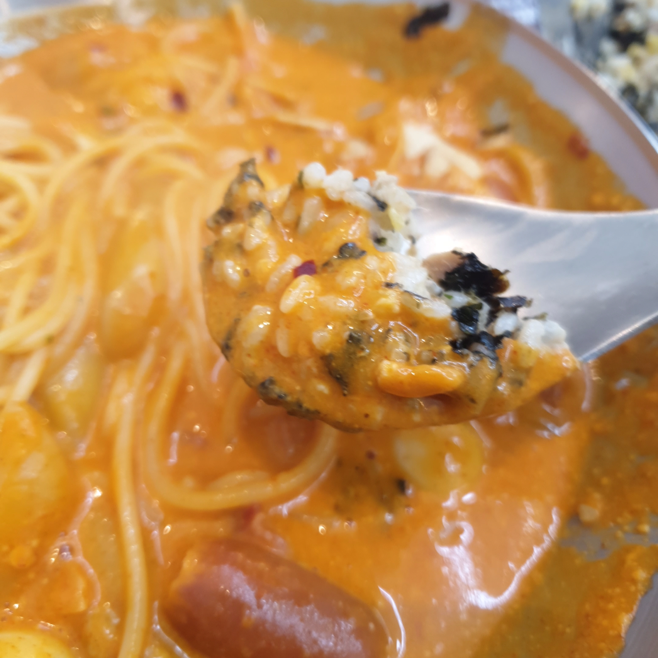 저 꾸덕꾸덕함이 느껴지는 투움바소스와 푸지게 들어있는 재료들, 그리고 다진(?)단무지와 양껏 뿌려져있는 마요네즈까지.
