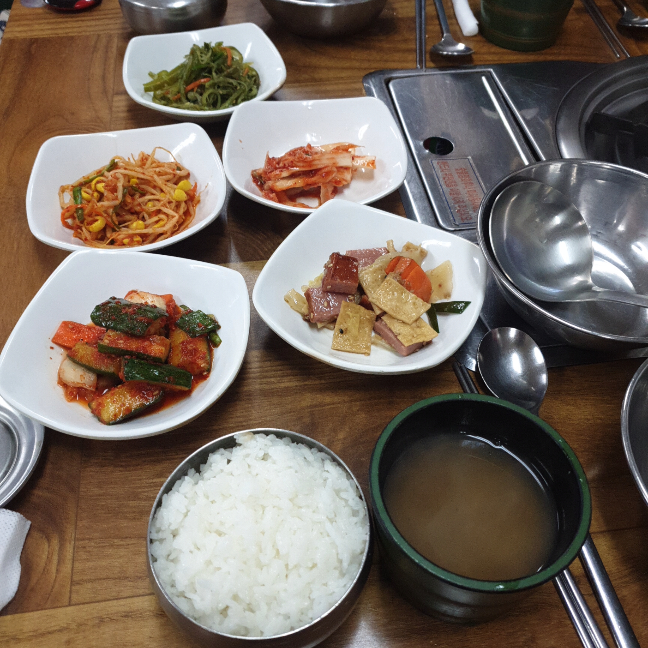 오이소박이, 어묵볶음, 콩나물무침, 김치, 미역줄기가 보이네요.