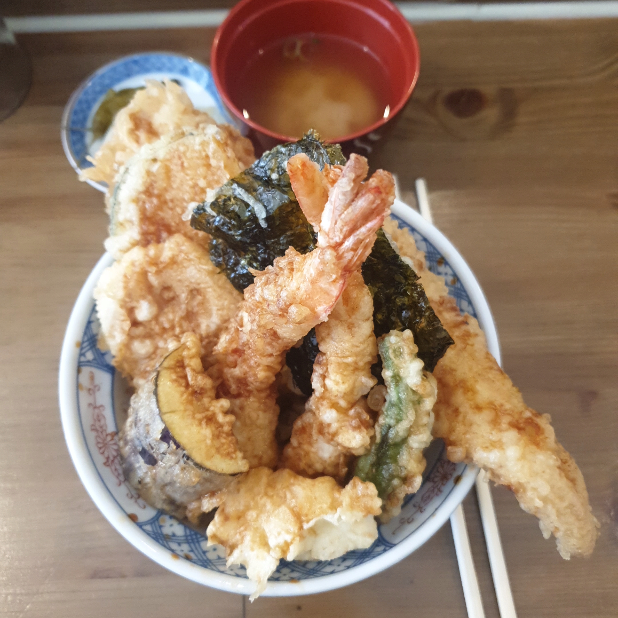 다양한 종류의 텐동과, 사이드로 토마토절임이 준비되어 있습니다.