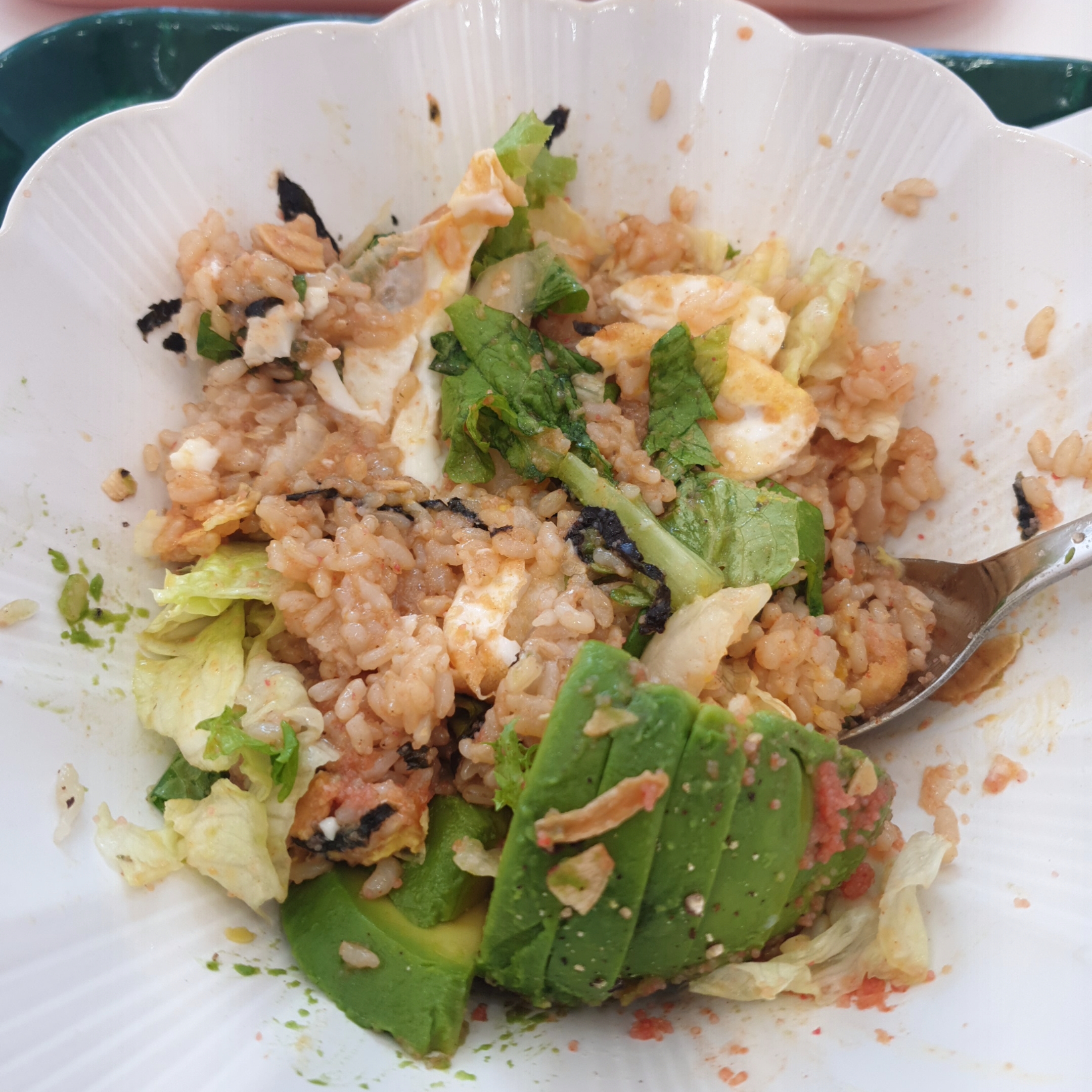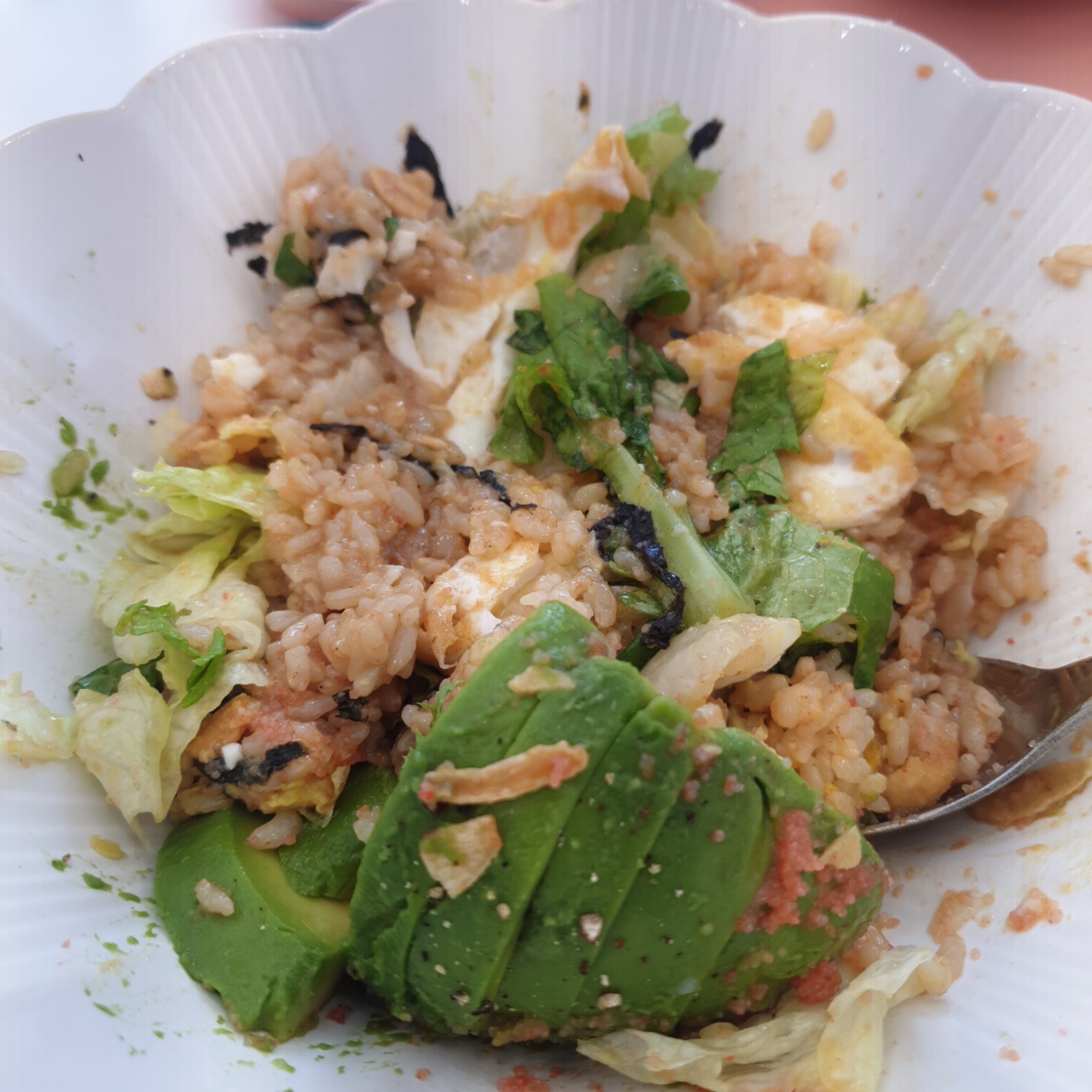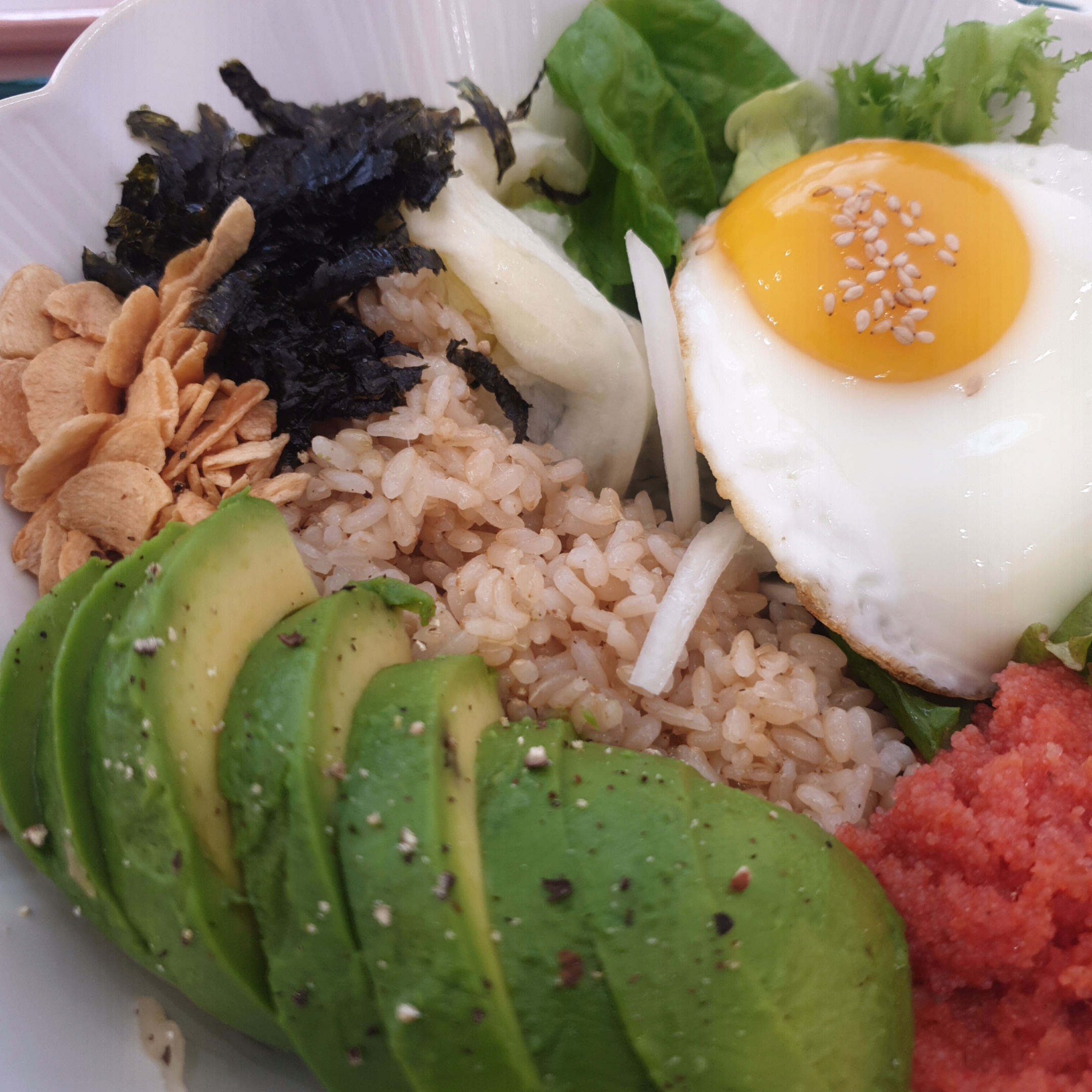 밑에는 현미밥이 깔려있고, 마늘후레이크, 아보카도, 명란, 각종야채, 김가루 그리고 계란후라이까지 제공됩니다.
