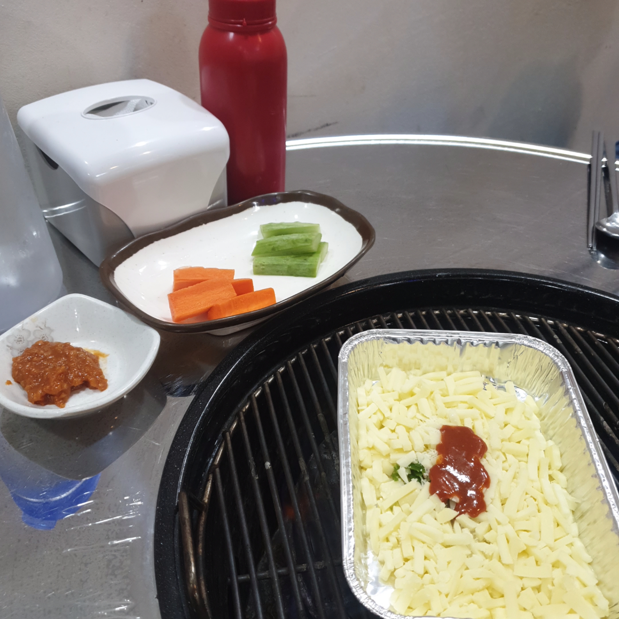 치즈구이? 할 은박접시가 먼저 올라왔습니다.