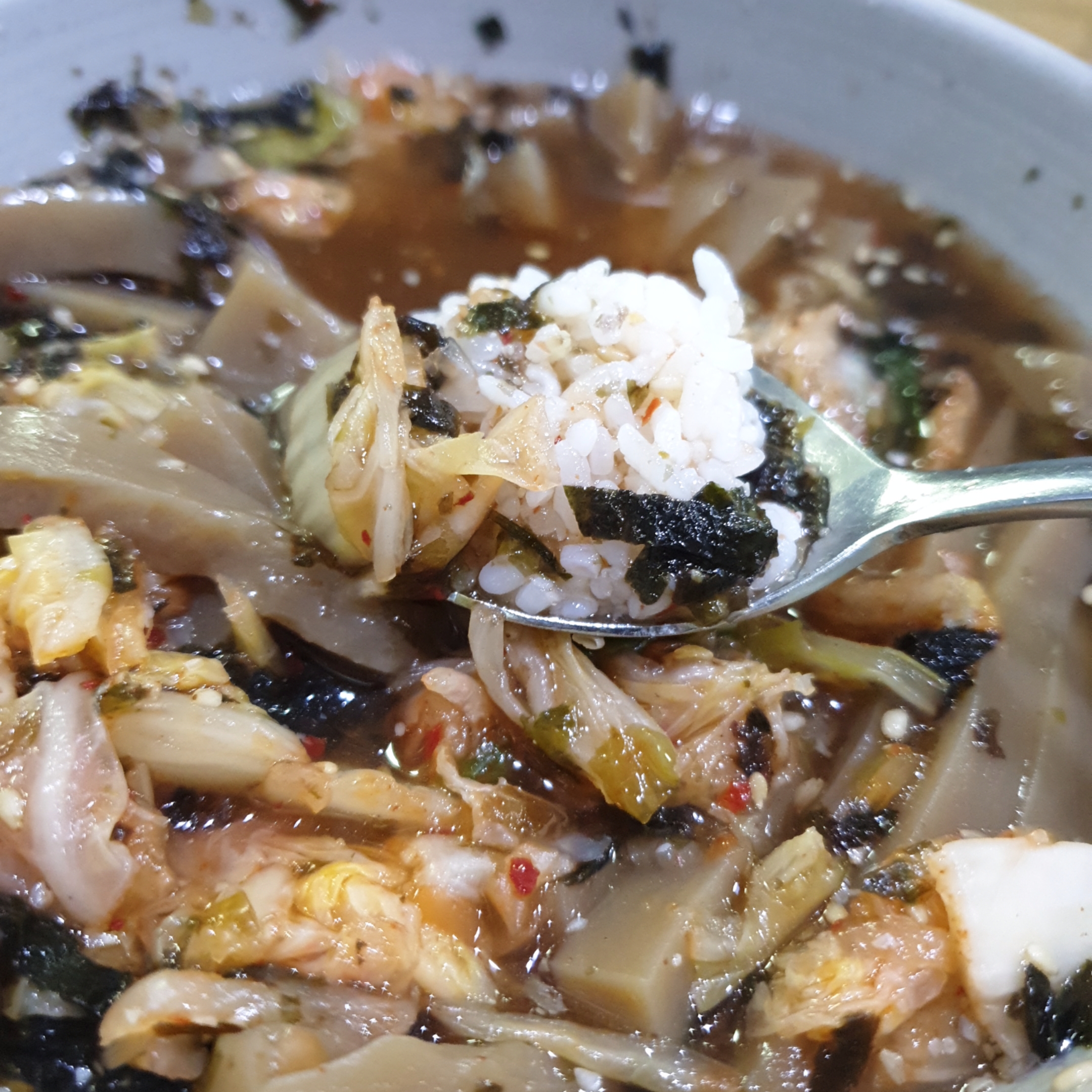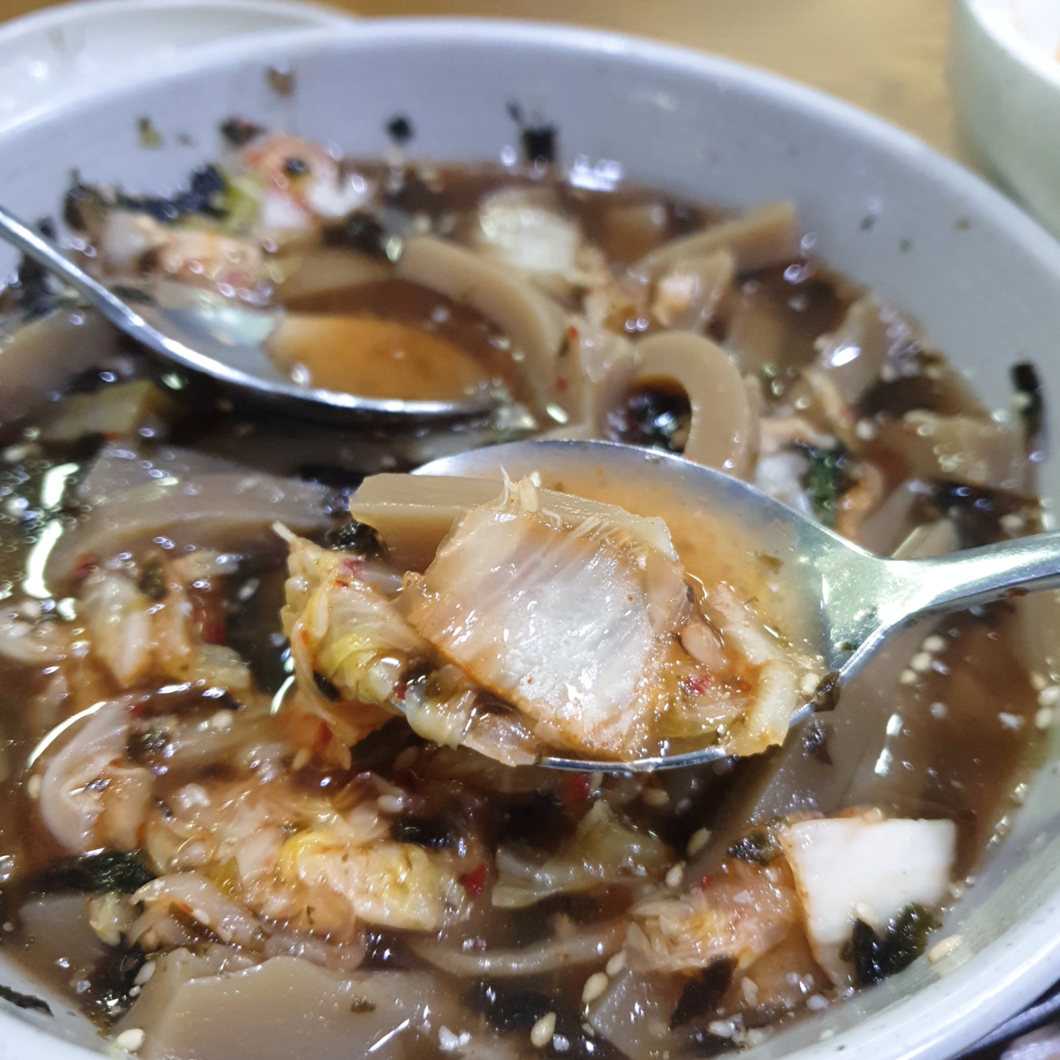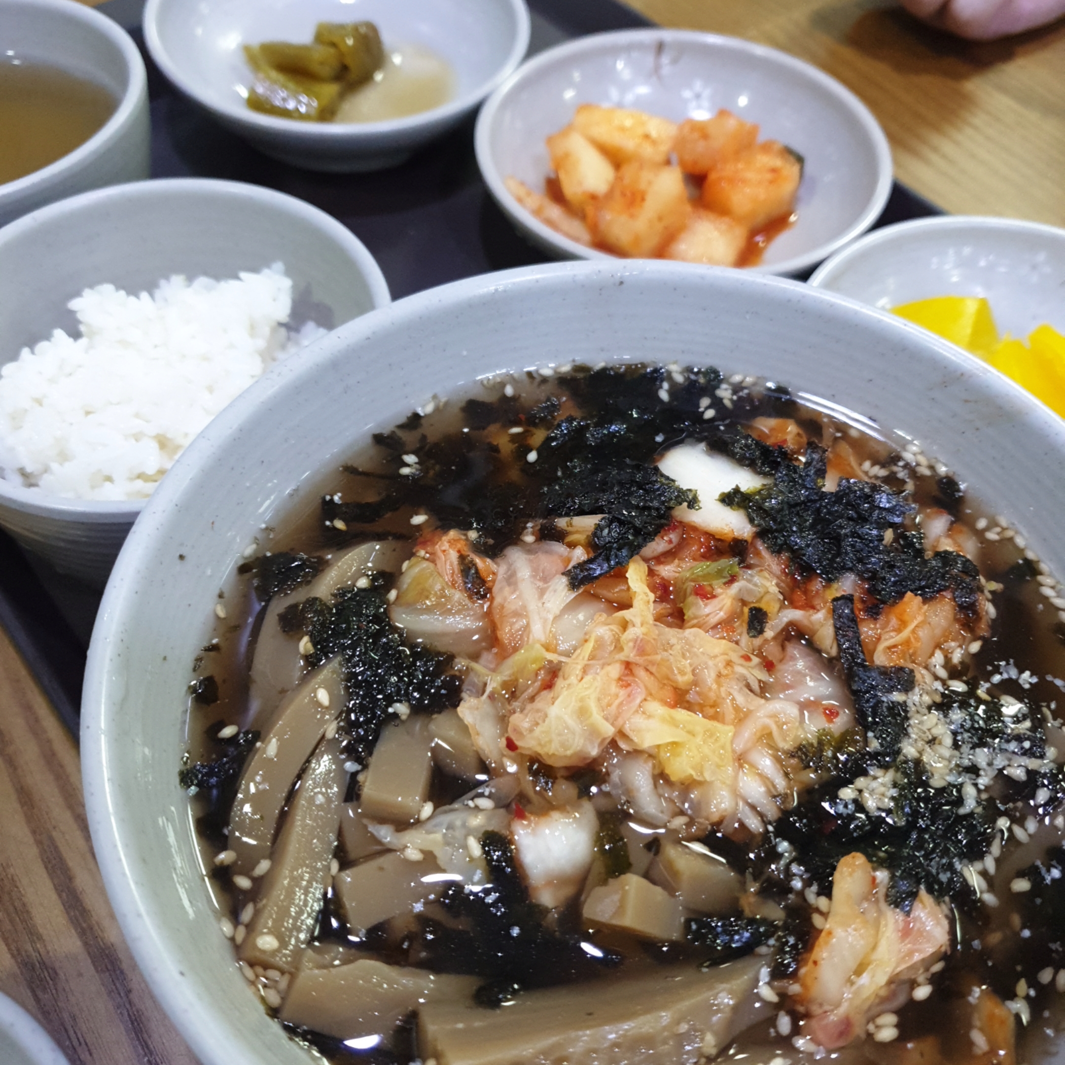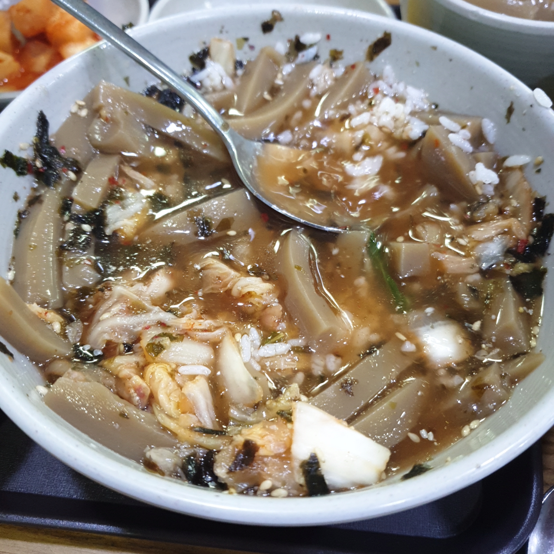아시는분은 아시겠지만, 멸치육수 같은 육수에 도토리묵이 국수같은 모양으로 잘라져 들어가있고, 고소한 김가루와 깨 그리고 김치까지 살짝 얹어져 있는 메뉴입니다.