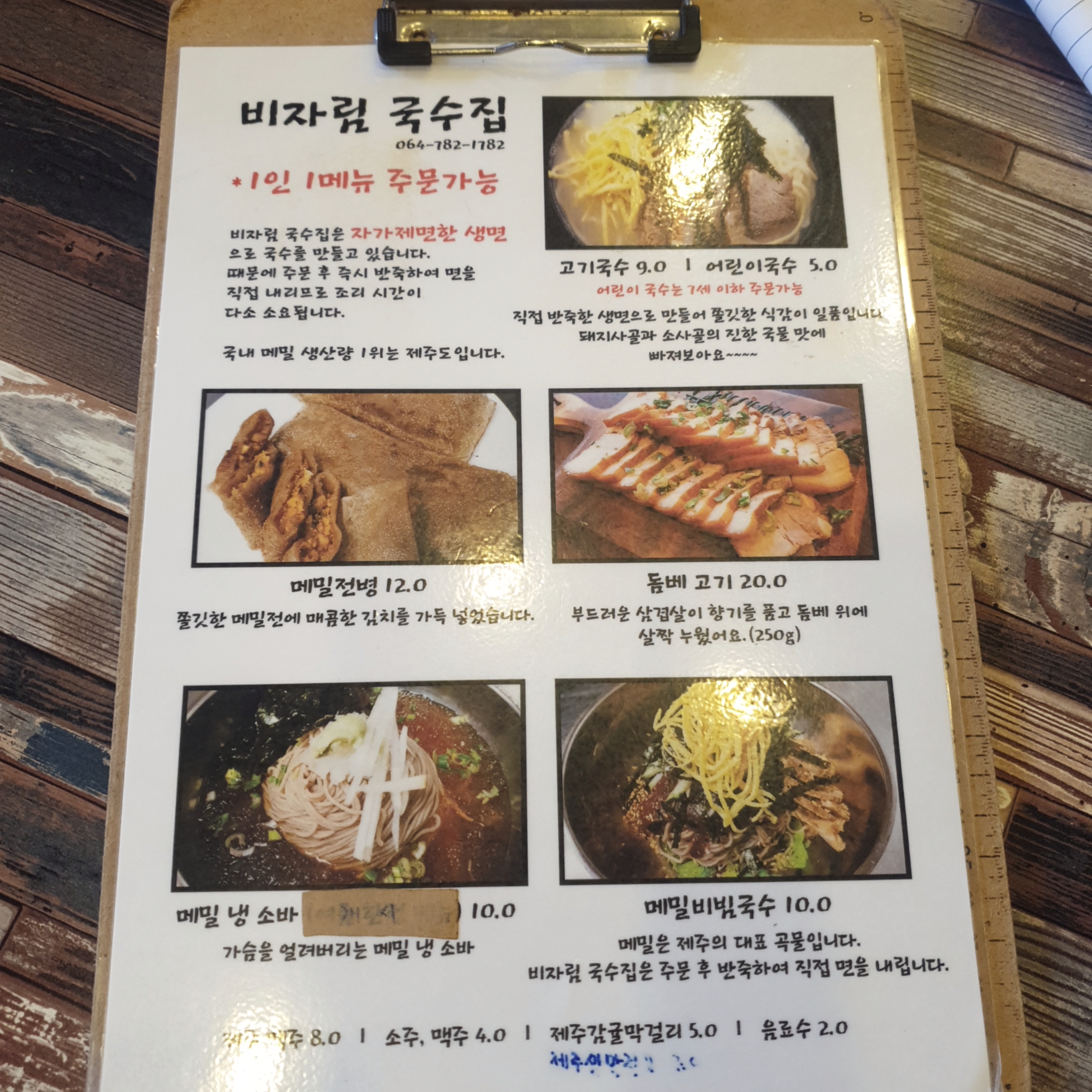 메뉴는 고기국수, 메밀비빔국수 메밀냉소바 그리고 메밀전병ㅇ과 돔베고기가 있습니다.
