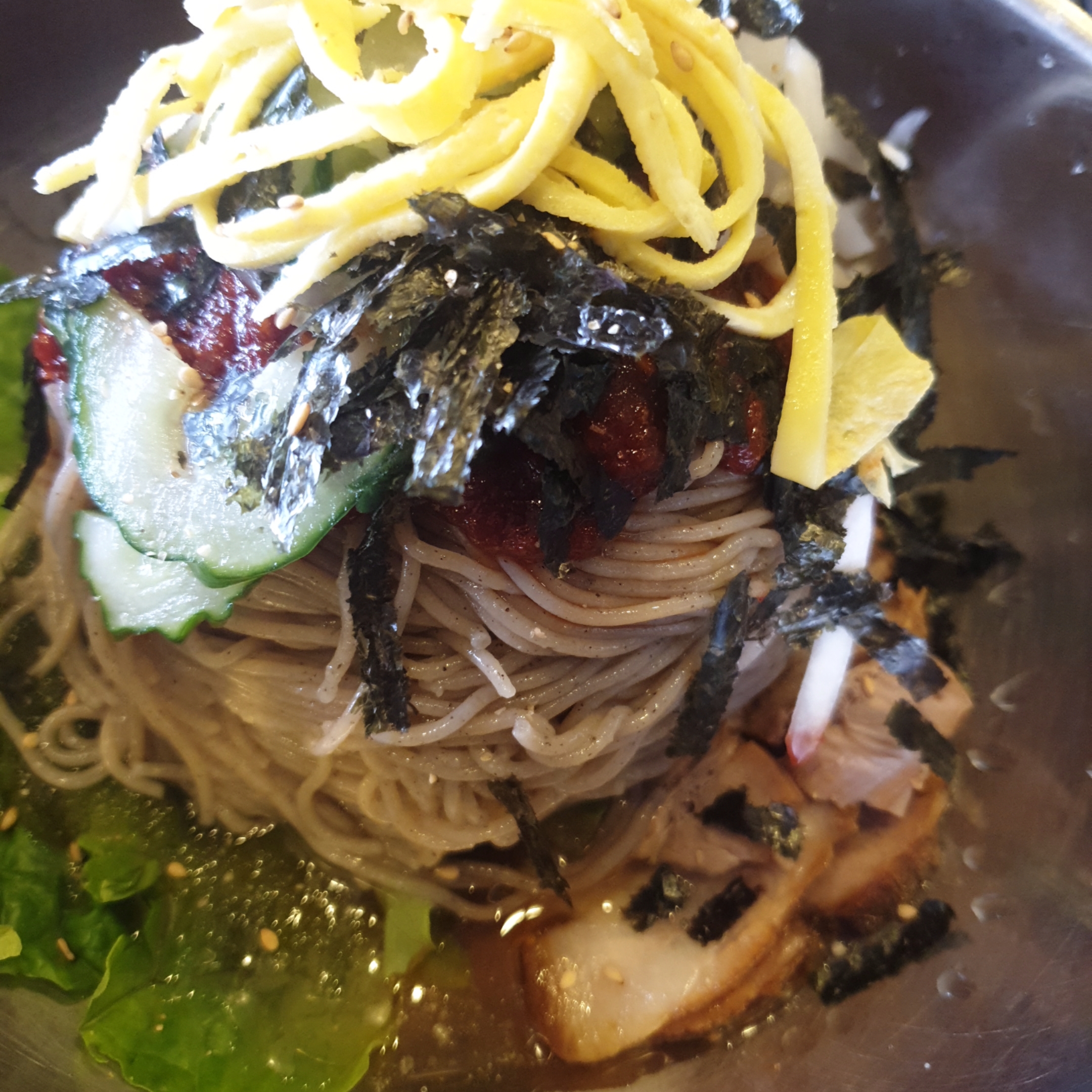 메밀면, 냉면육수 조금, 비빔장, 김, 오이, 계란지단, 김치 등이 있었습니다.