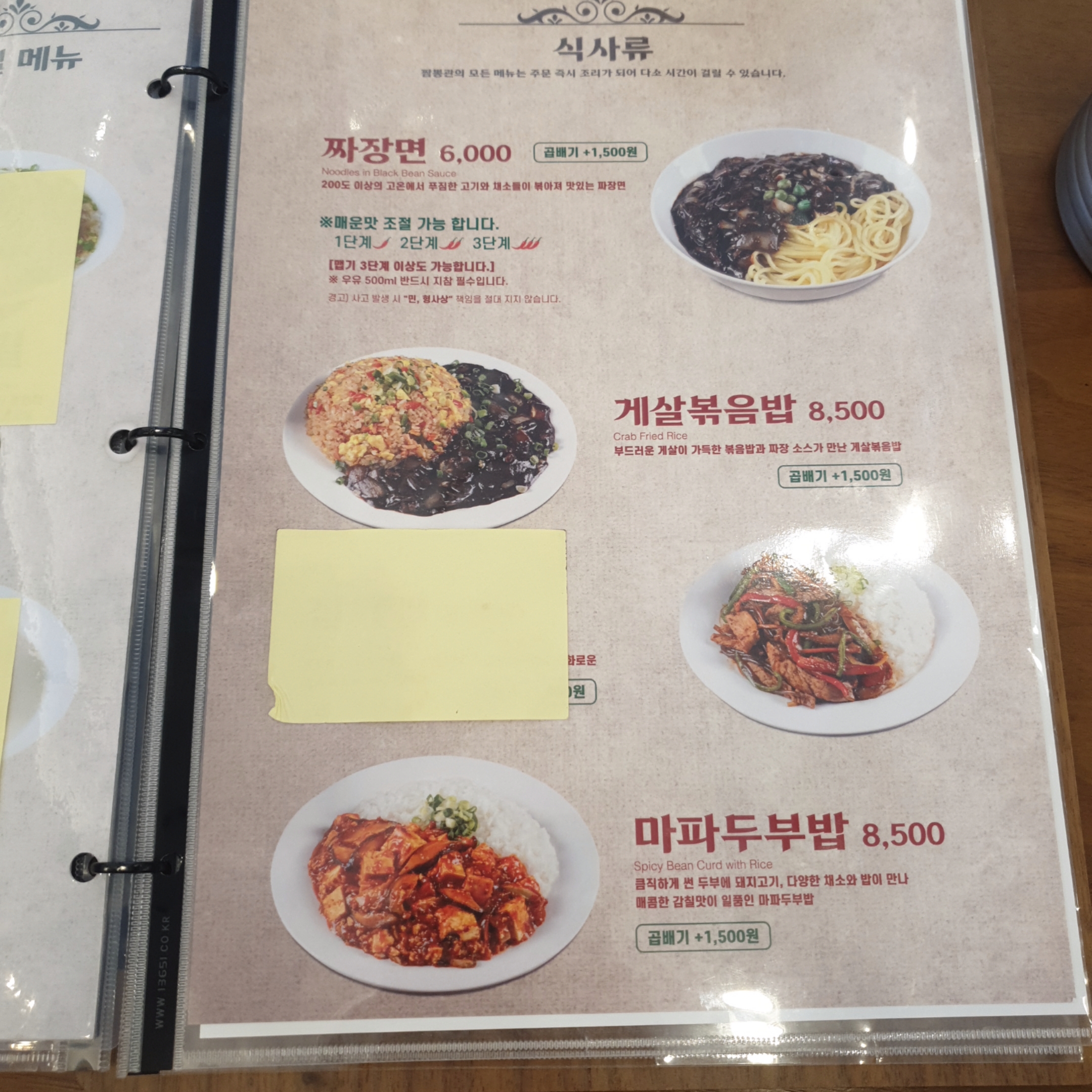 짜장면, 게살볶음밥, 마파두부밥으로 다른 식사류도 준비되어 있습니다.