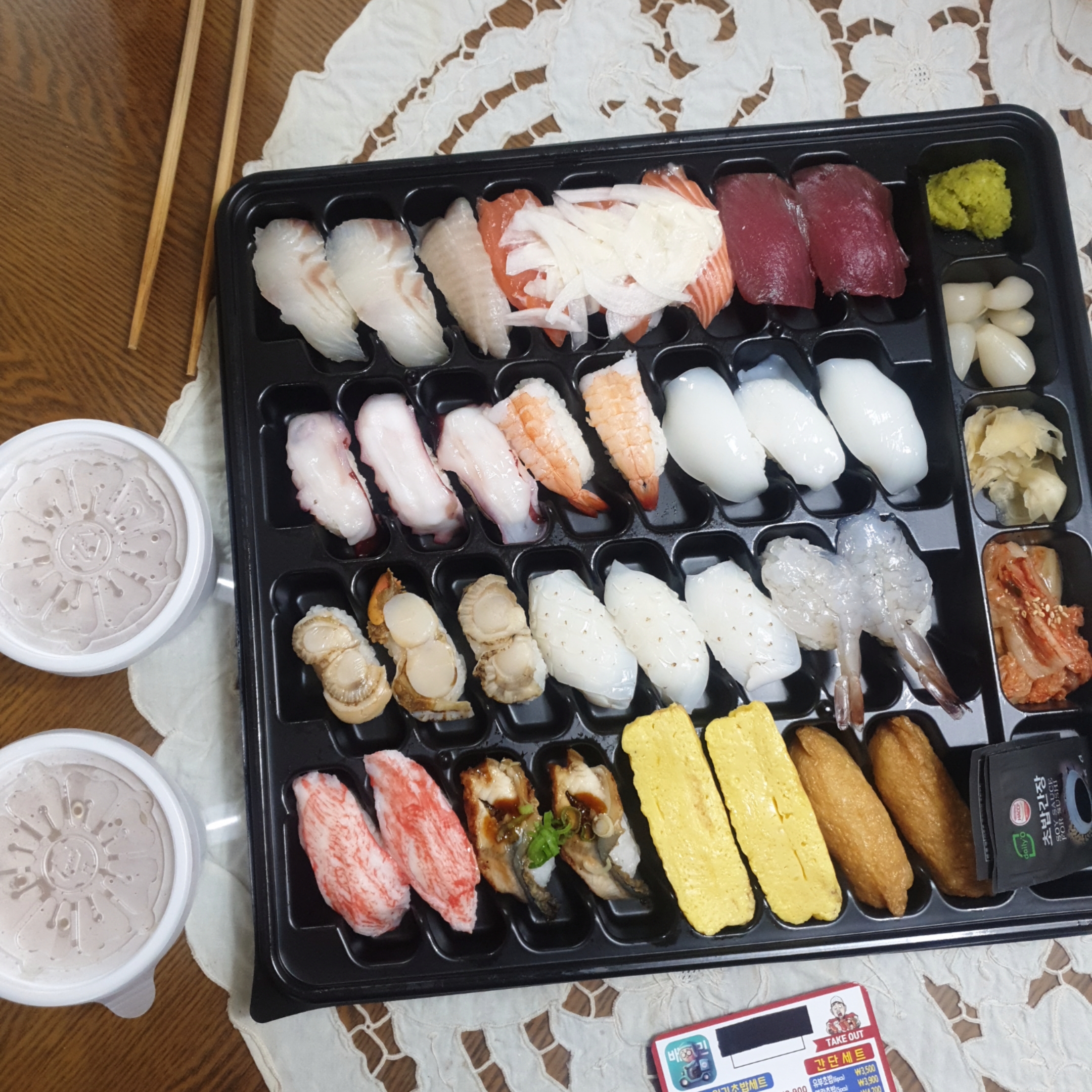 깔끔하게 포장용기에 초밥 가득 들어있었고, 장국 두개와 함께 주십니다.