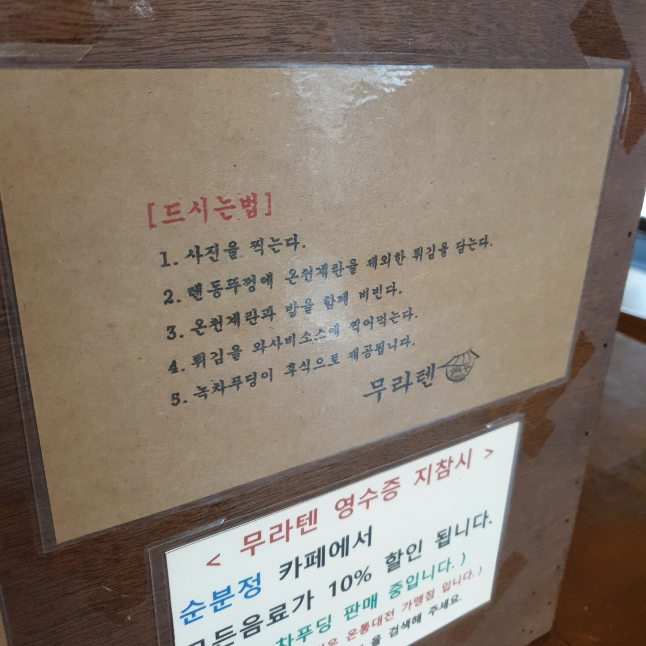 텐동뚜껑에 튀김을 전부 옮긴 후, 온천계란과 밥을 비비고, 튀김을 와사비소스에 찍어먹으라고 합니답.