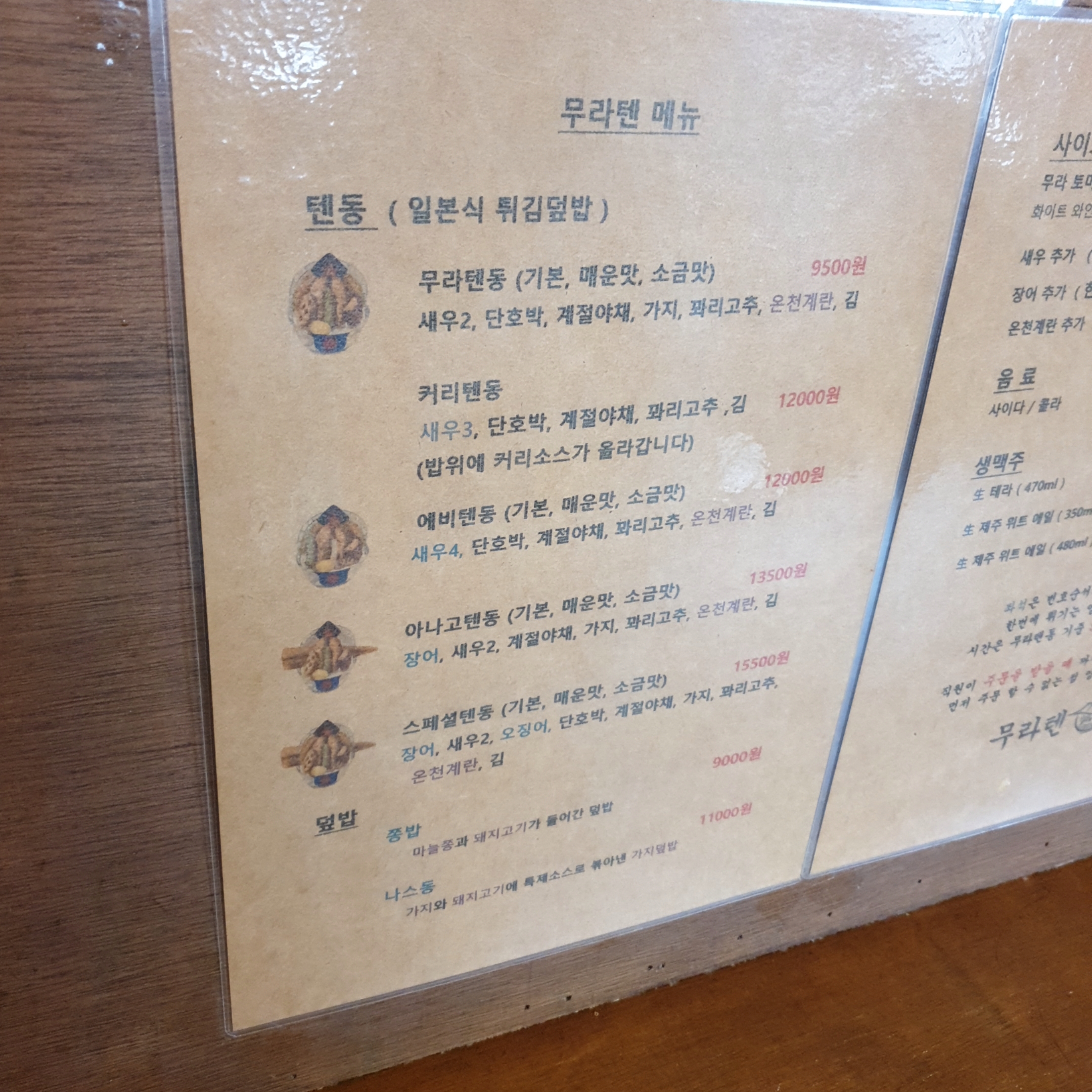 무라텐동, 커리텐동, 에비텐동, 아나고텐동, 스페셜텐동이 있고 '덮밥'메뉴도 있는게 특이점이었습니다.