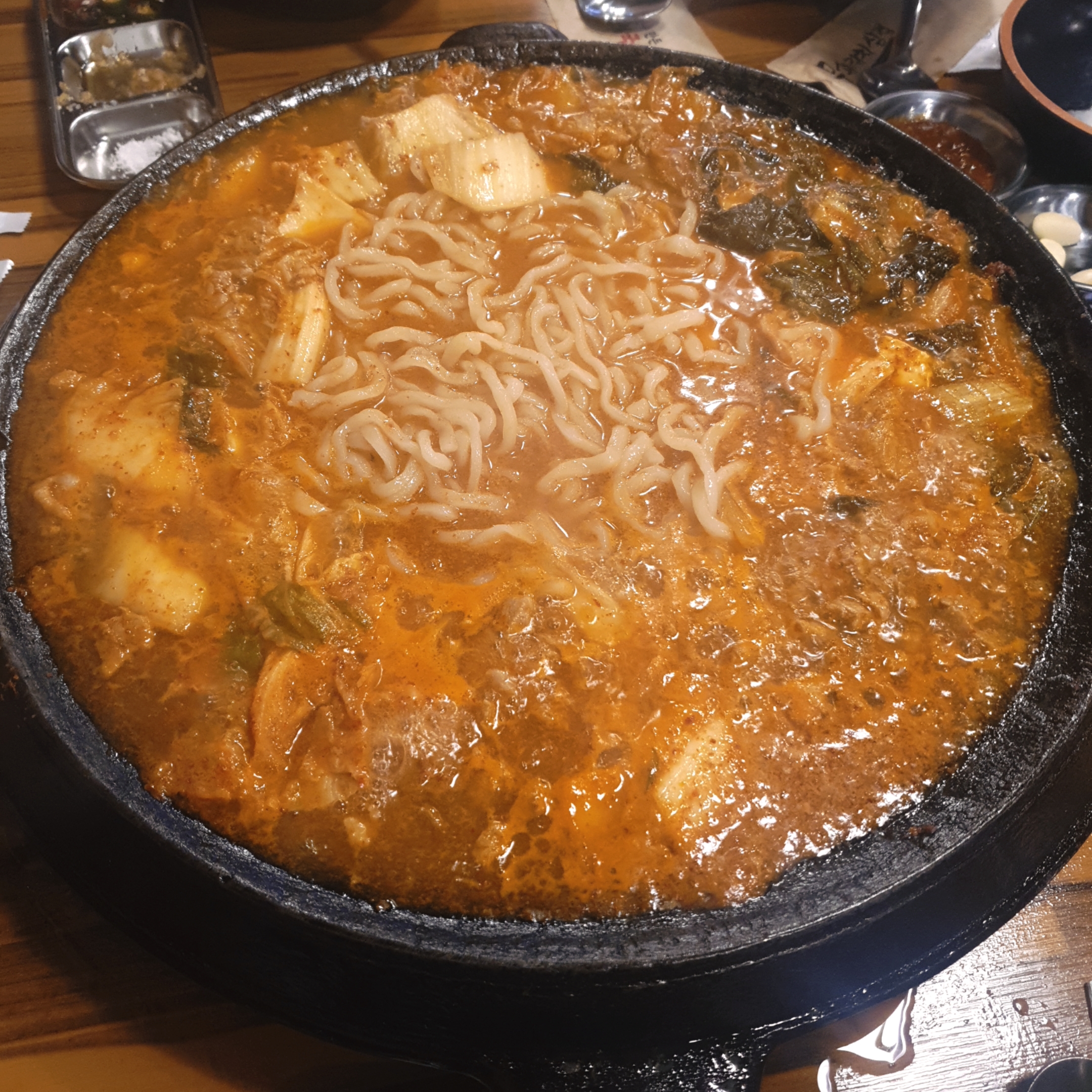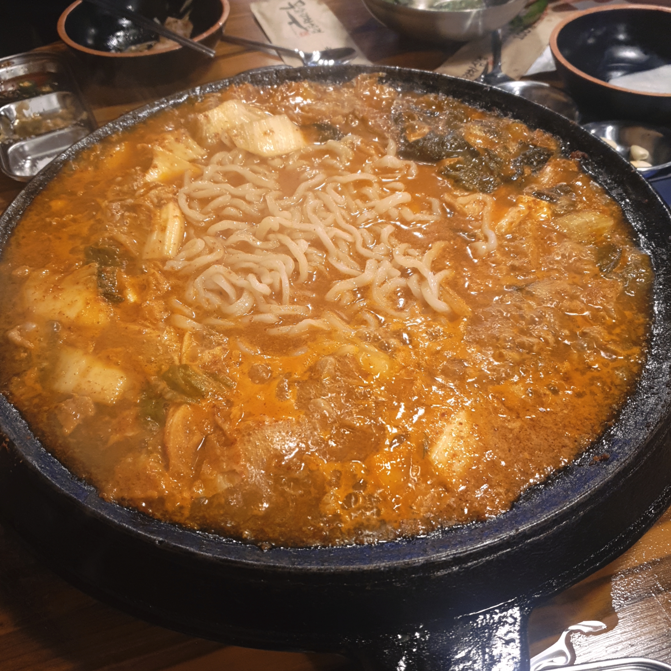 김치전골은 2인분 이렇게 주문하는게 아니라 한판 시키면 위 양을 주시고, 거기에 다양한 재료를 추가해서 먹는 형식이라고 했습니다.