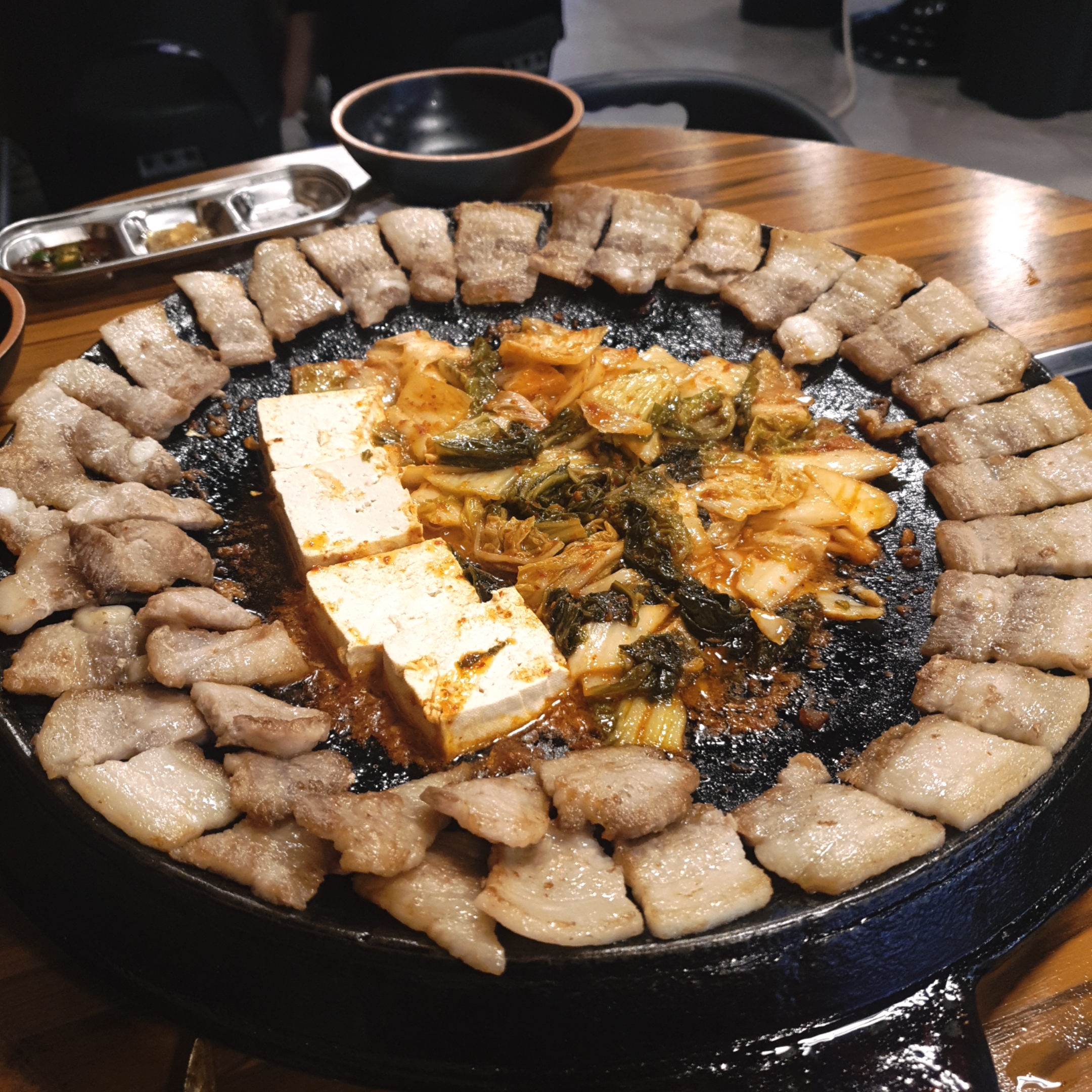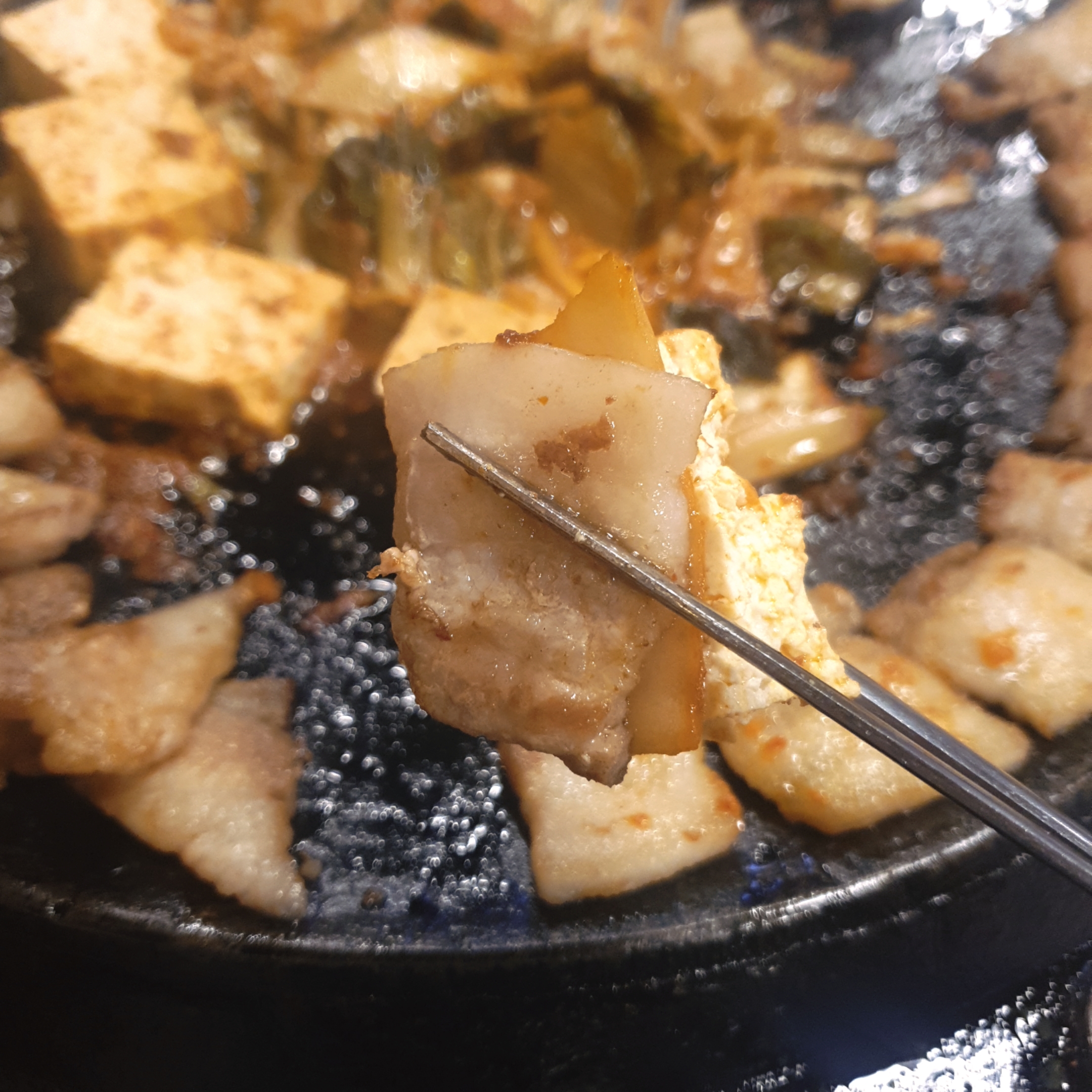 기름도 쫙 빠지고, 가운데에 모임 기름으로 김치와 두부를 구워먹는 그 맛이란!