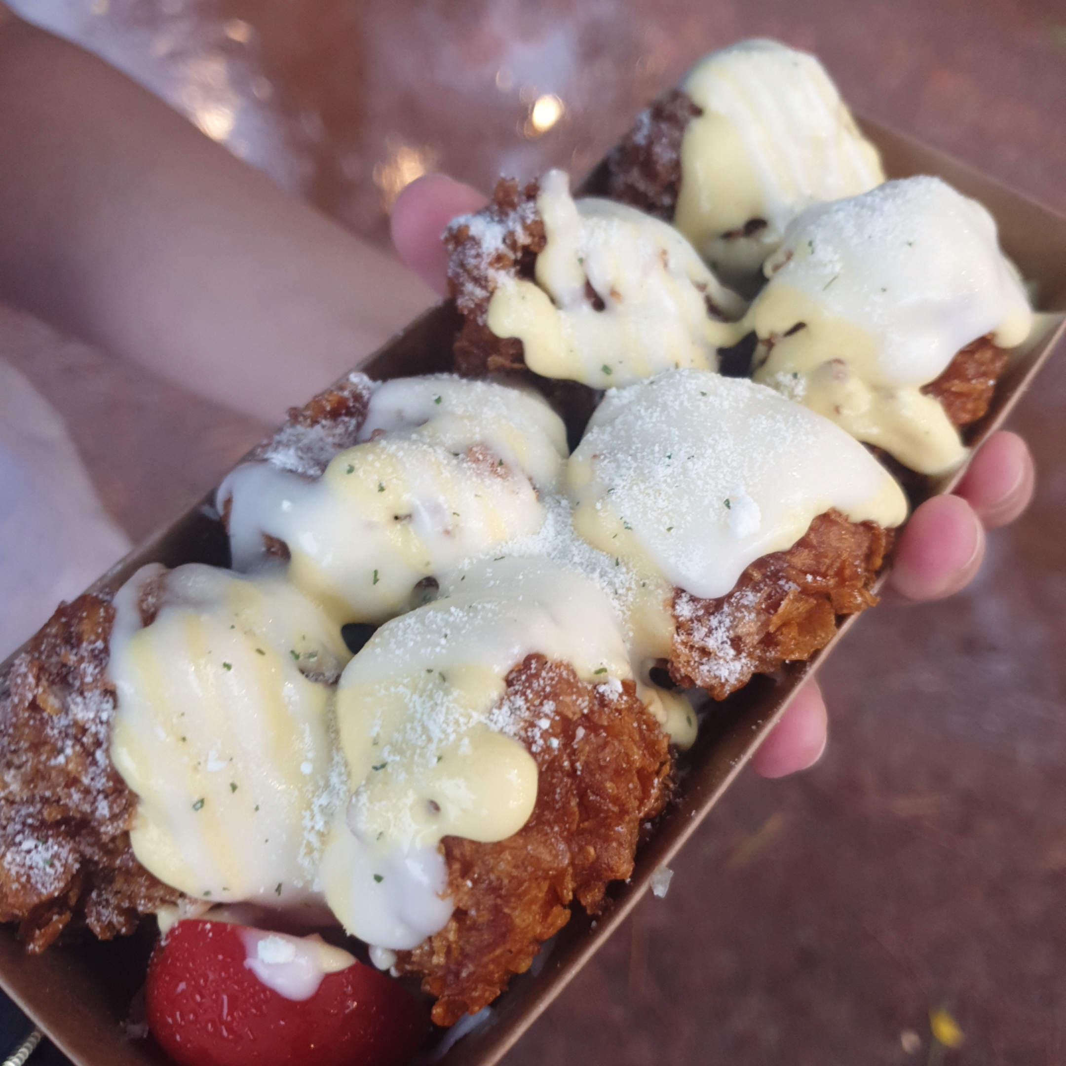 7개가 종이박스에 담겨서 깔끔하게 나옵니다. 위에 갈릭소스?와 마요네즈소스같은 소스가뿌려져 있고, 하얀 가루가.. 갈릭시즈닝이었는지 설탕같은거였는지 잘은 기억이 안나지만 위처럼 나옵니다.
