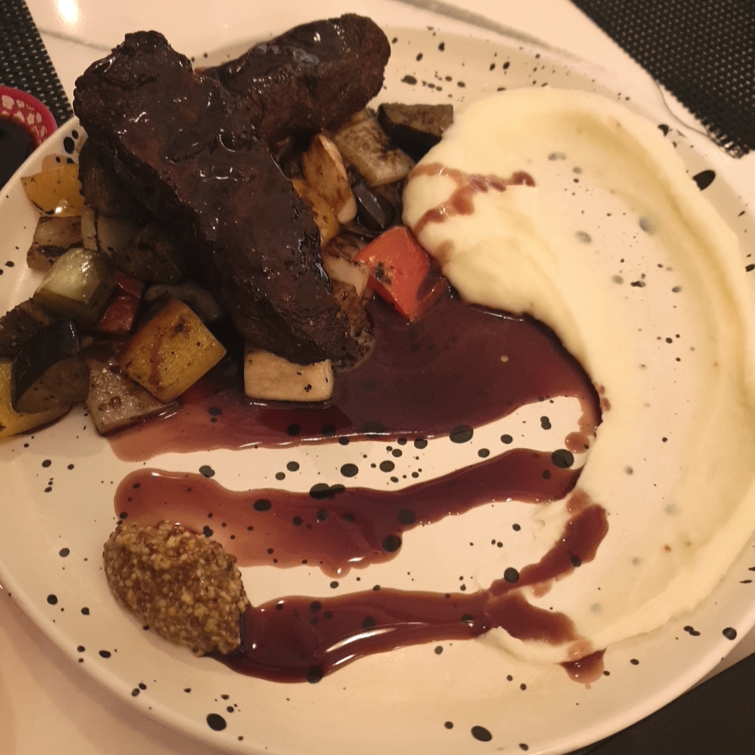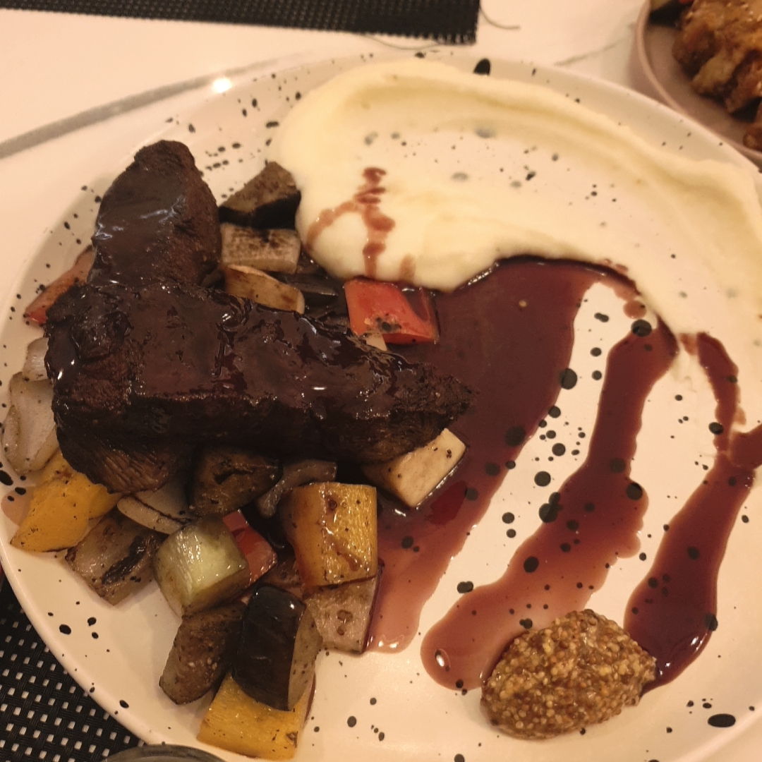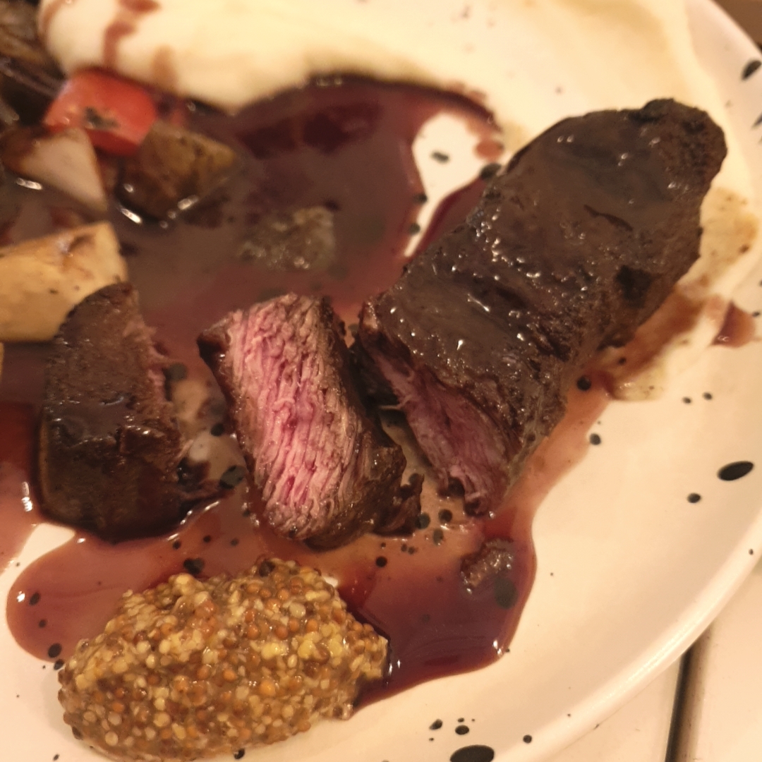 메쉬드포테이토와 함께 주문한대로 잘 익은 스테이크, 그리고 홀그레인머스타드까지.