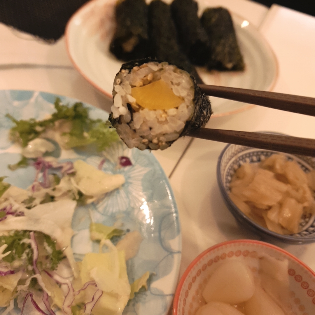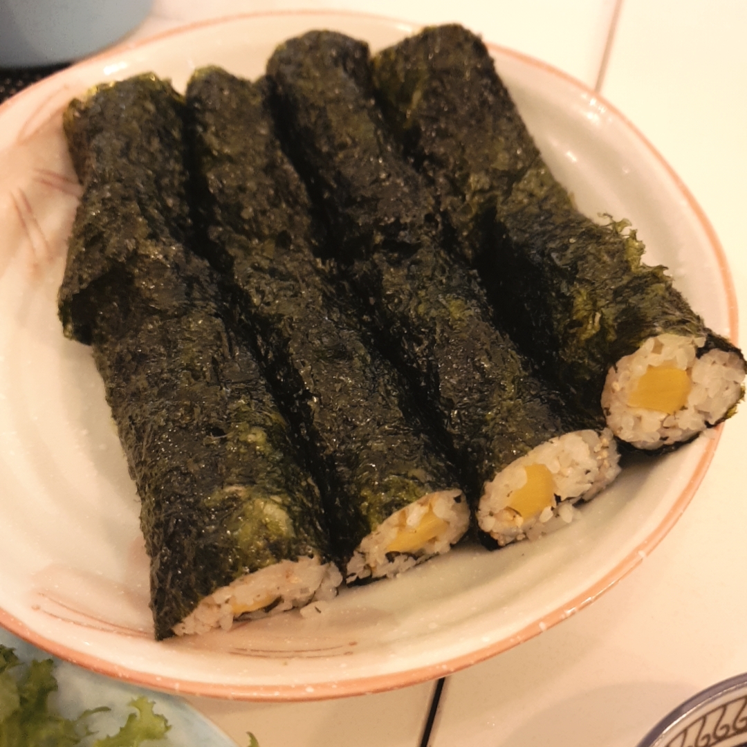 살짝 간이 되어있는 밥과 김의 고소함이 단무지의 새콤달달함과 잘 어우러져서 메인메뉴 먹기 전에 가볍게 먹기 딱 좋았습니다.