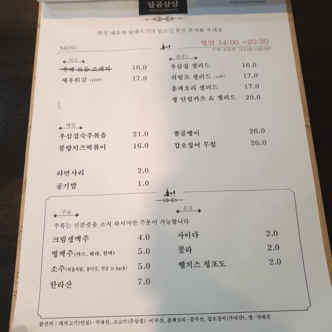 달곰삼삼 메뉴입니다.