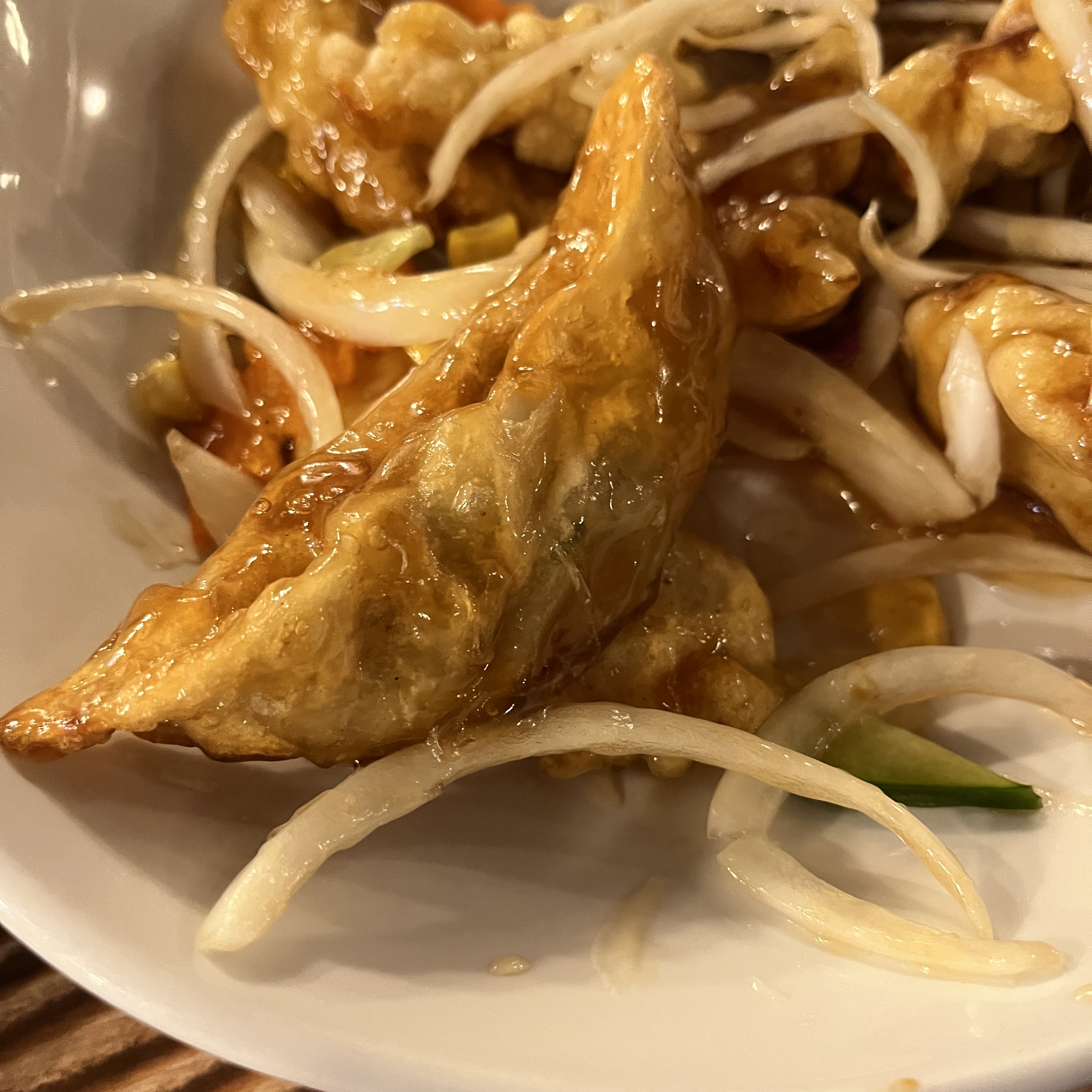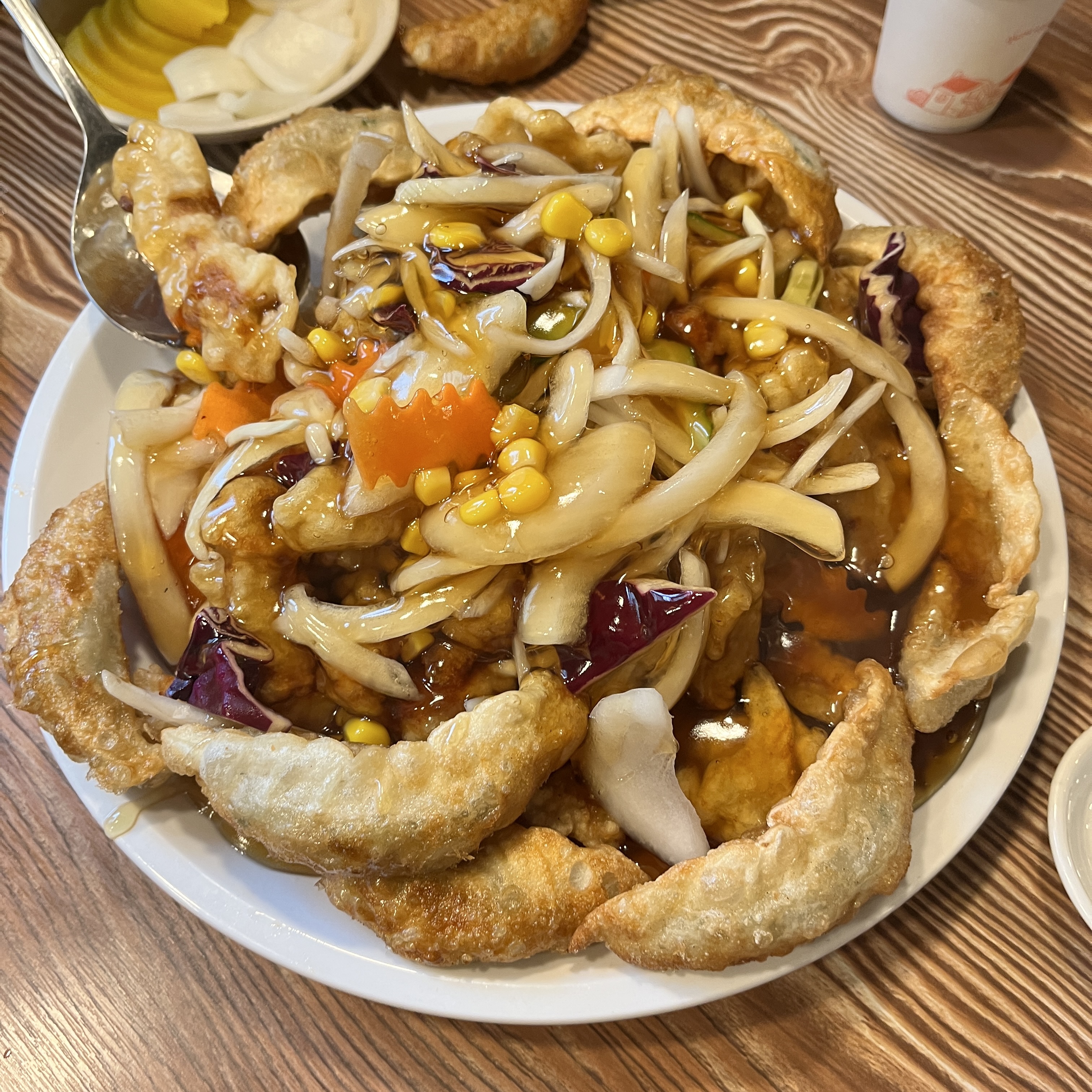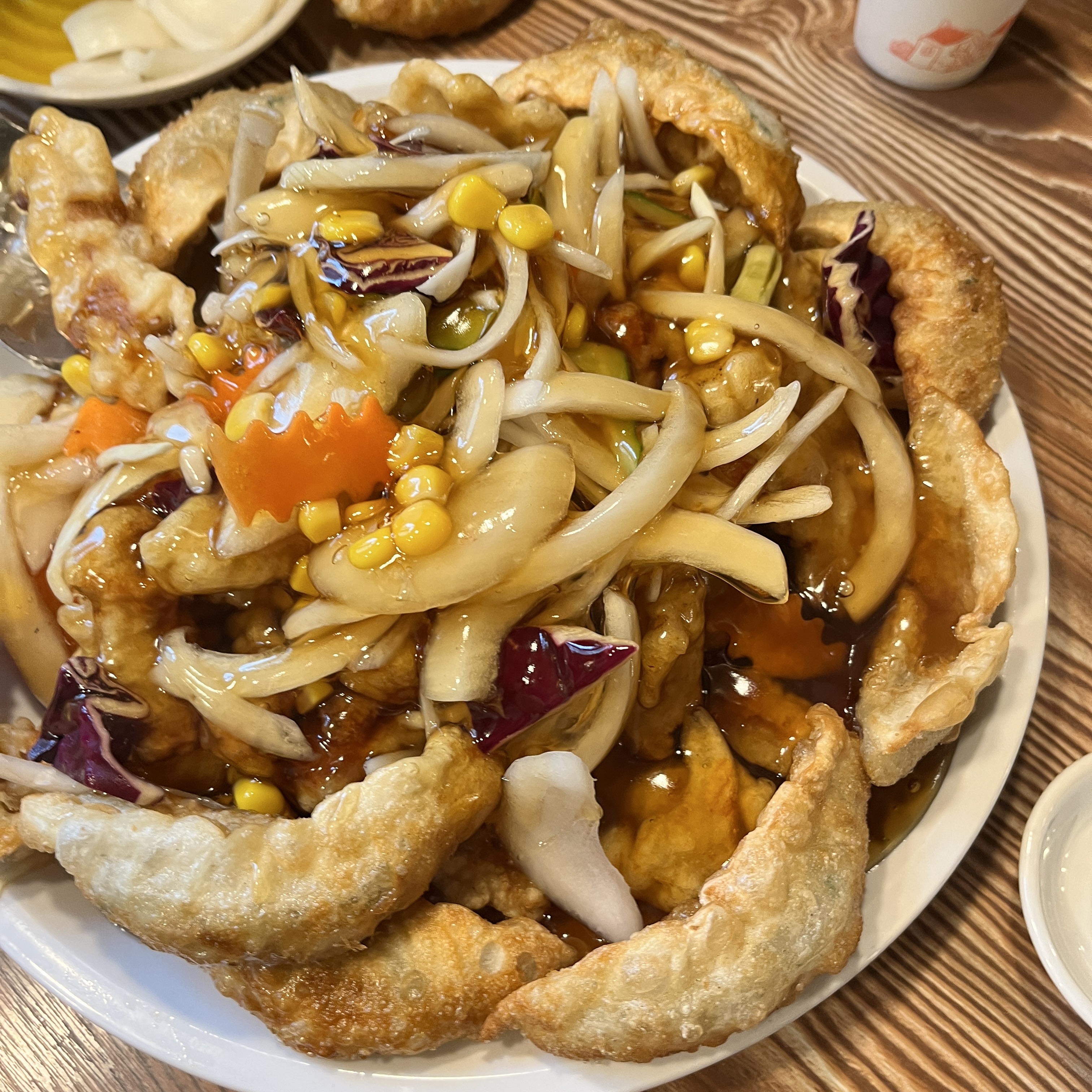 주변에 꽃처럼 둘러쌓여 있는 군만두가 인상적이었고, 탕수육 소스에 있는 옥수수도 인상적이었습니다.