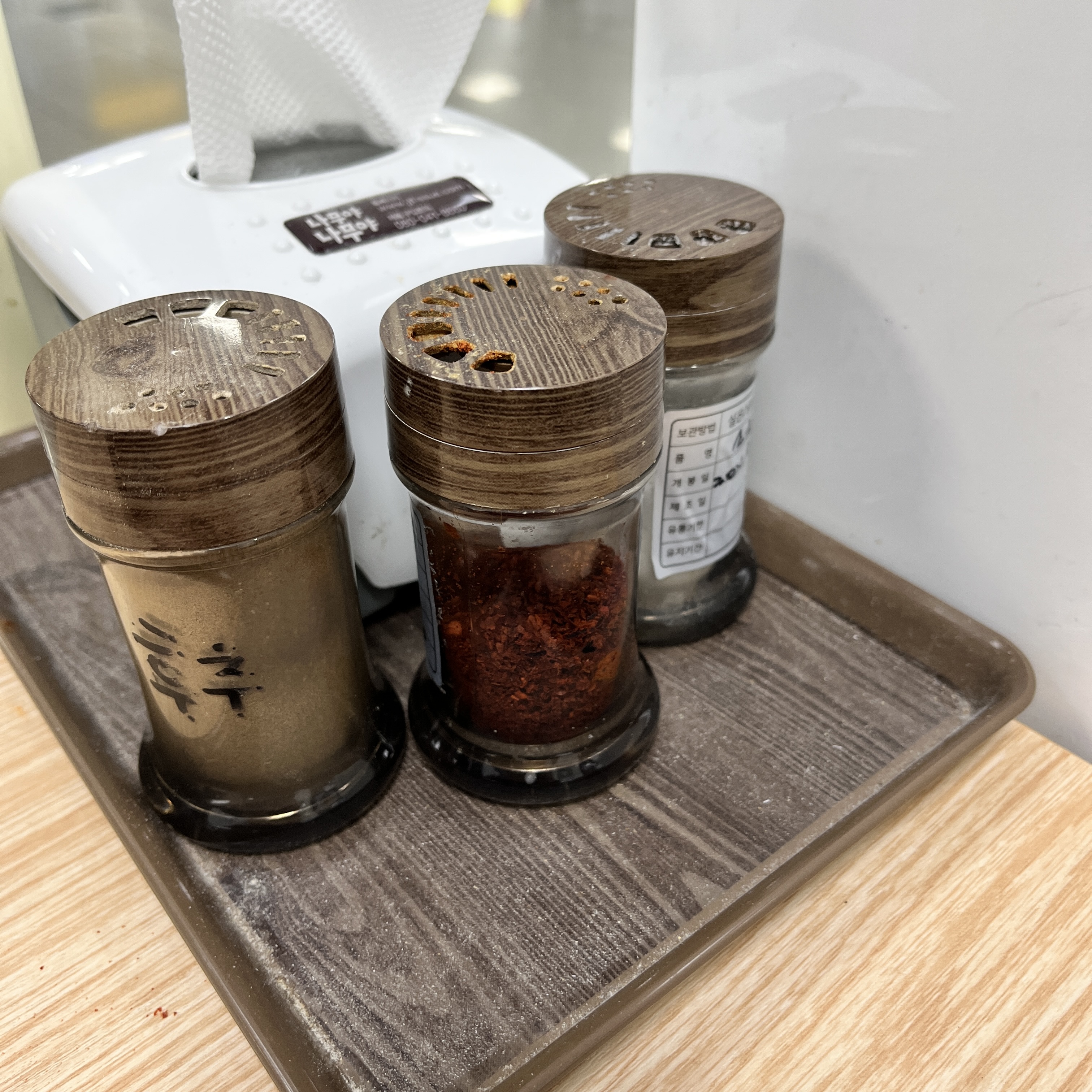 국수 먹을 때 곁들여 먹으라고 한켠에 후추, 고춧가루, 그리고 소금이 준비되어 있었습니다.