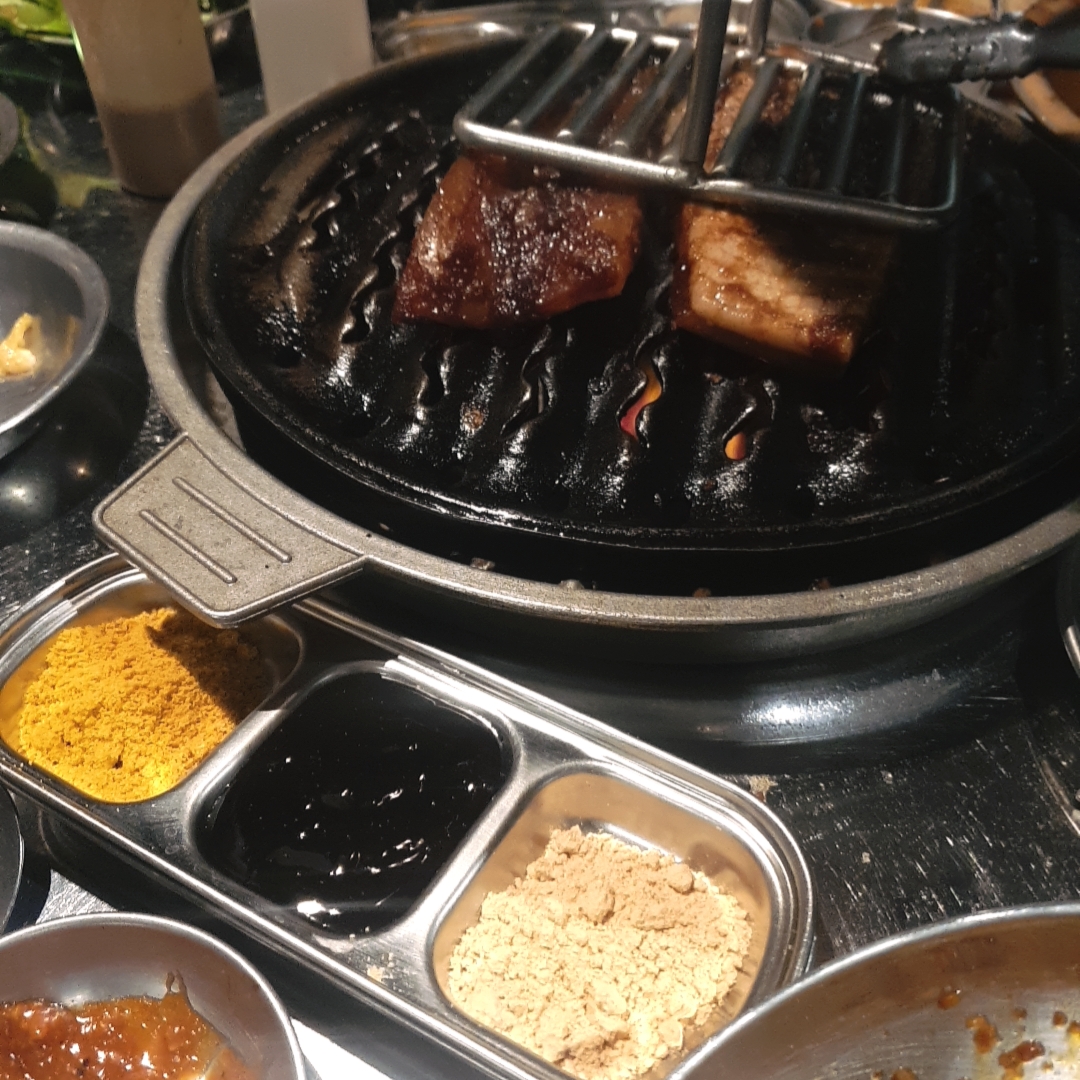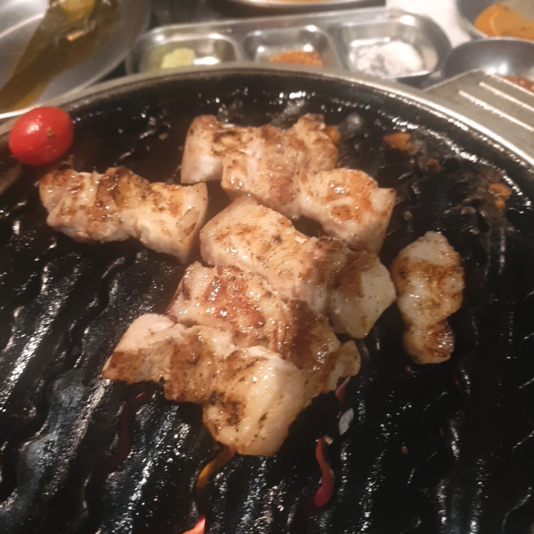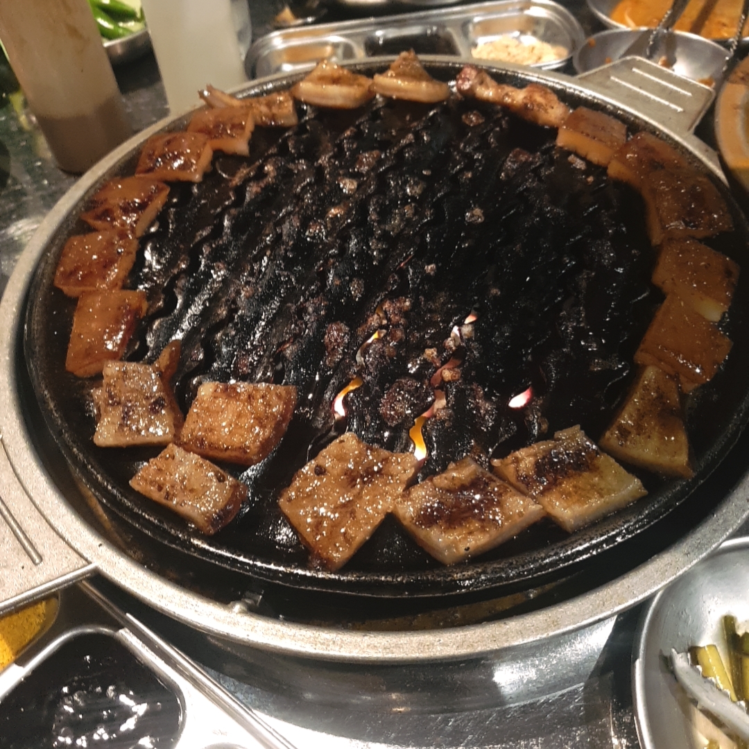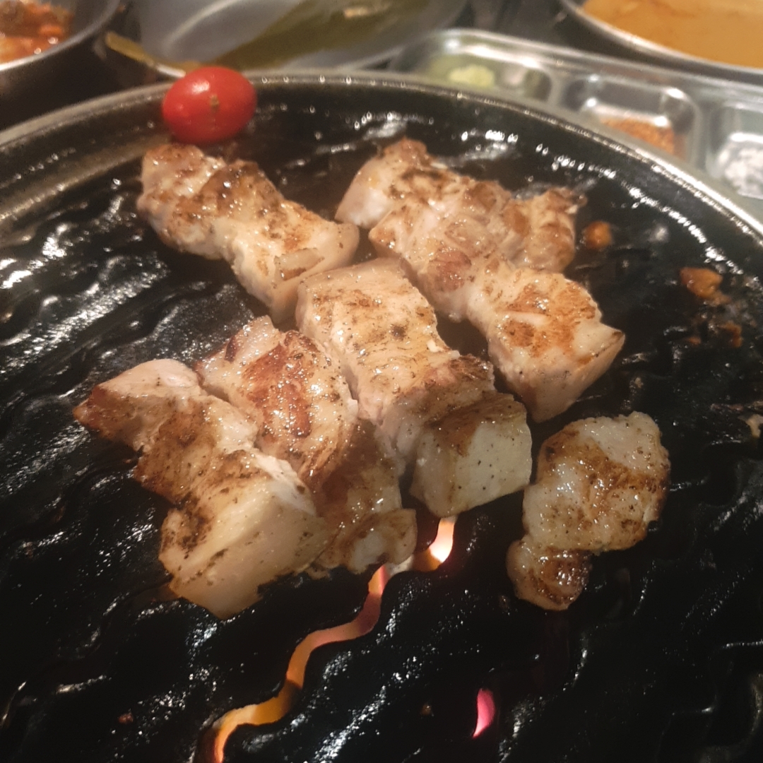 꽤나 센 화력에 무쇠판에서 익히는 두터운 고기는 육즙을 가두기 딱 적합했고, 겉바속촉의 식감도 느끼기 아주 좋았습니다.