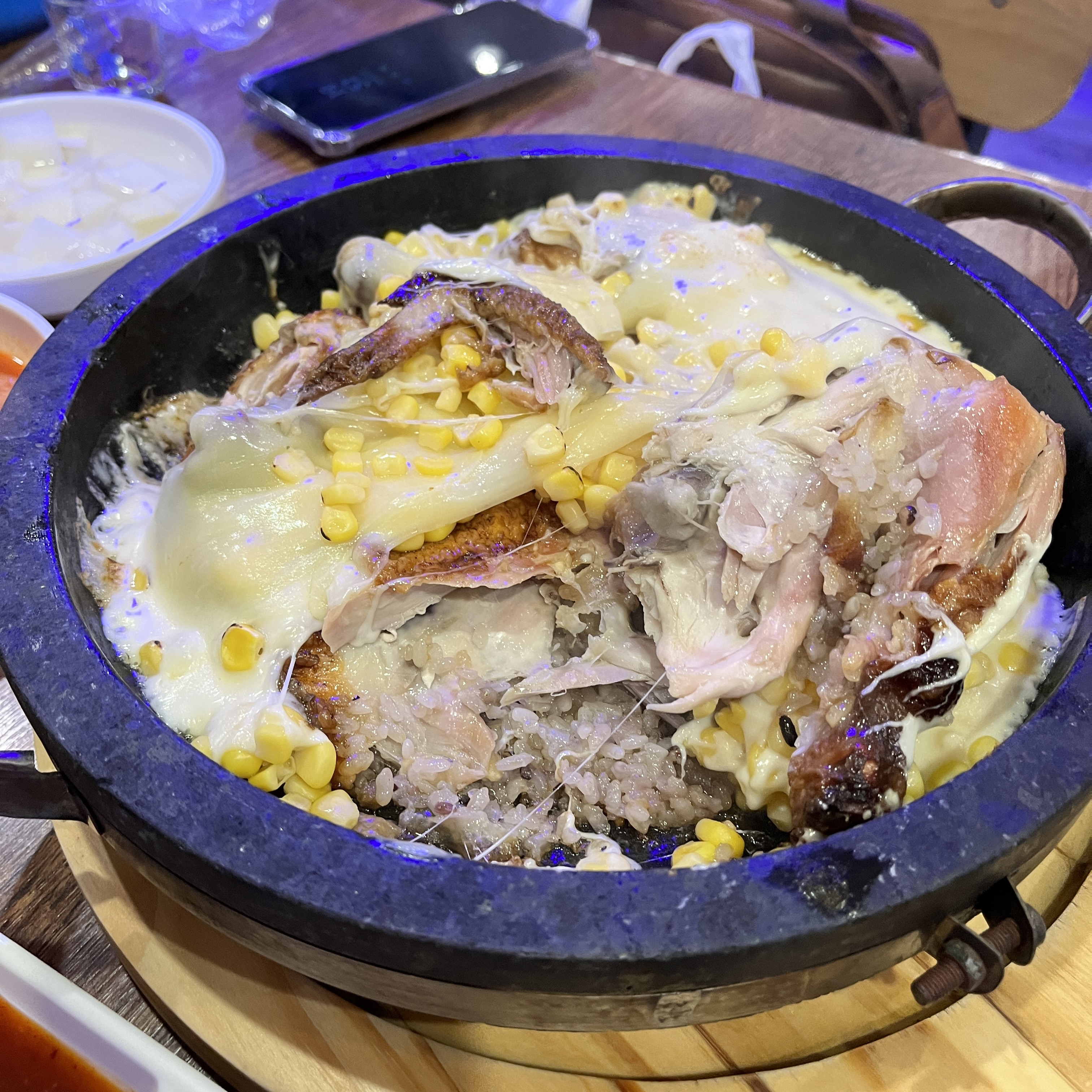 장작에 오랜시간 익혔다는 생각이 드는, 부들부들하고 기름기 쪽 빠진 맛좋은 닭과, 고소한 치즈의 조합은..