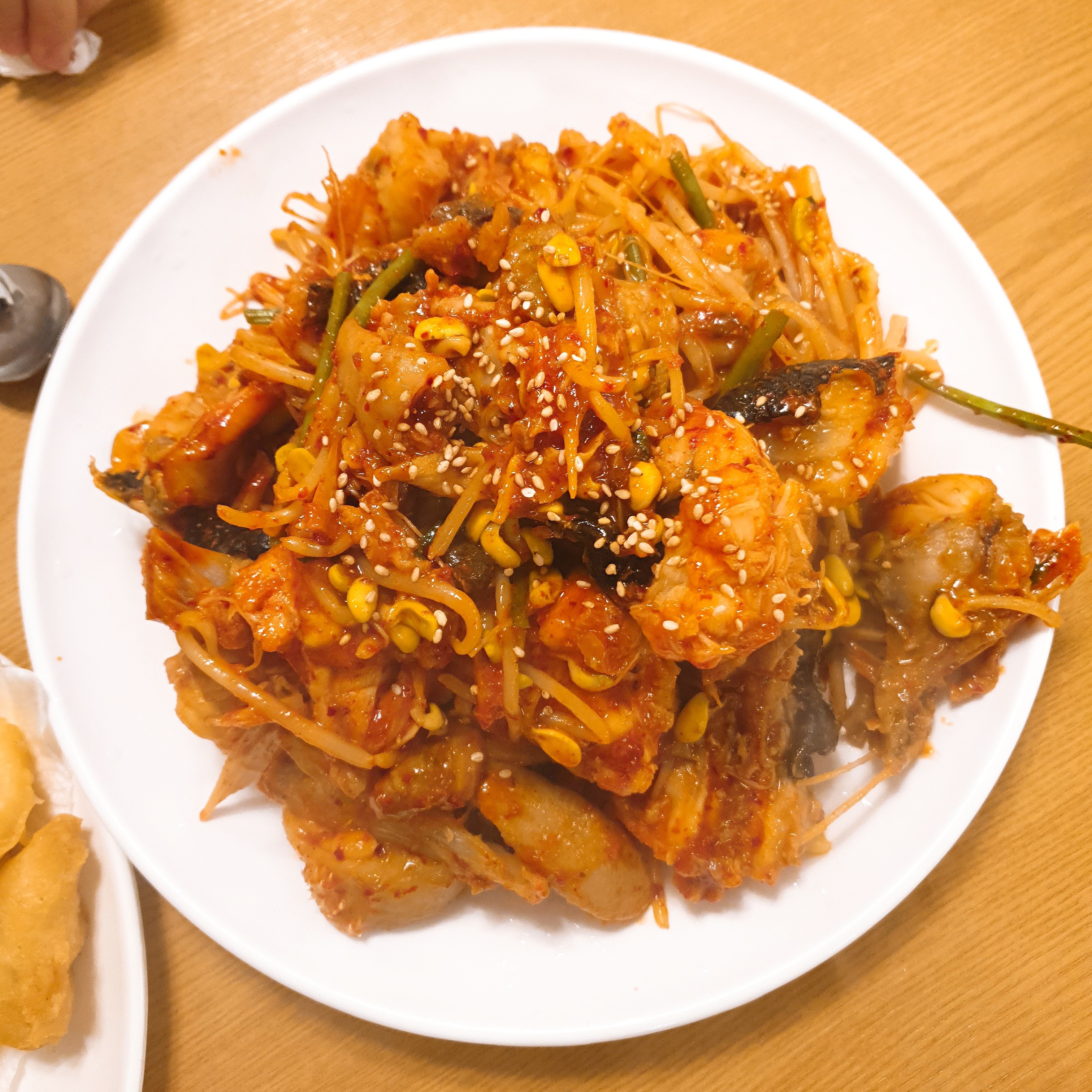 좌르르 흐르는 윤기와 함께, 한입 베어물면 오동통한 생선살, 그리고 적당히 매콤한 양념장이 콩나물의 아삭함과 어우러져서...
