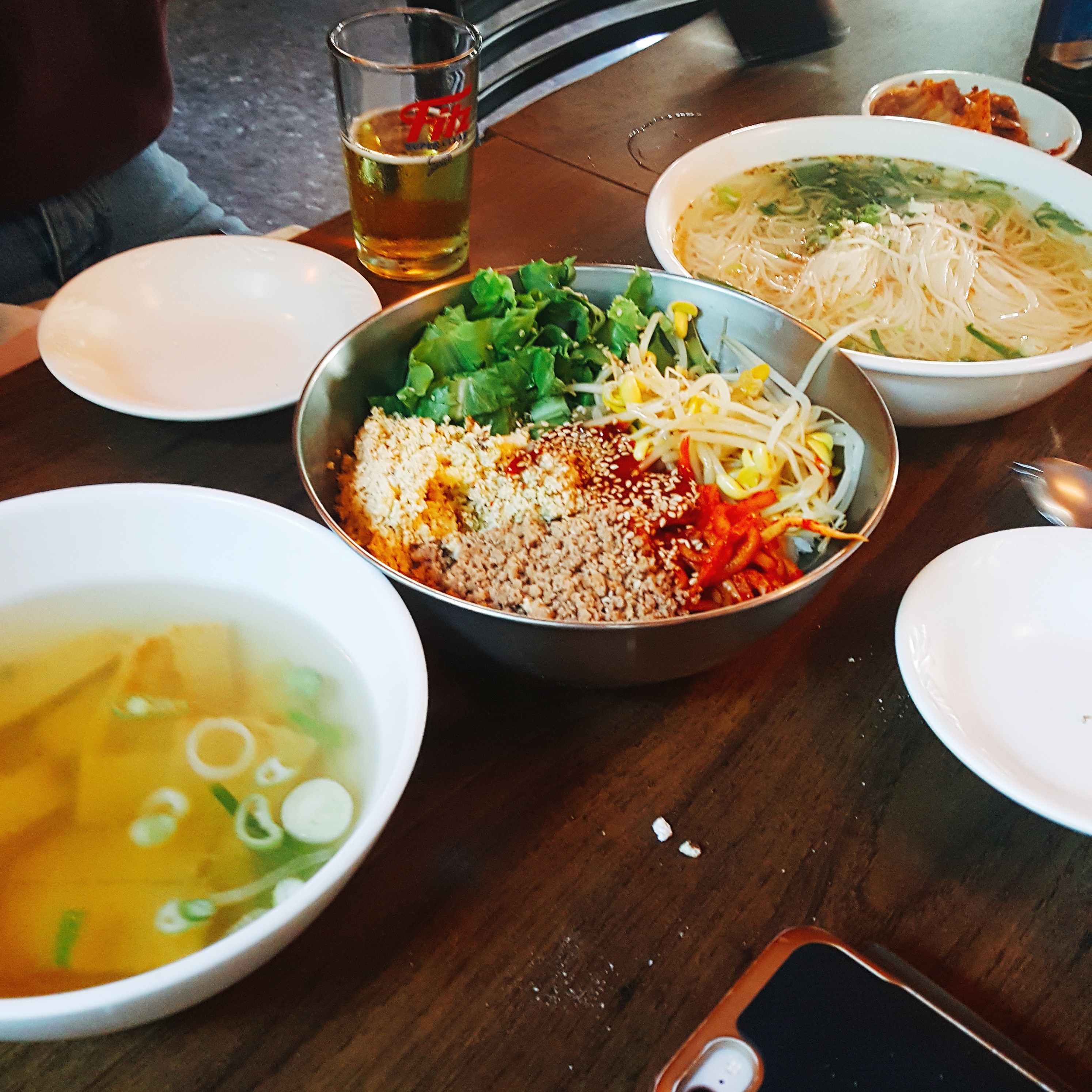 다양한 안주들이 있고, 특히 국수와 치킨이 맛있다 하여 치킨, 물국수, 비빔밥을 시켰습니다.