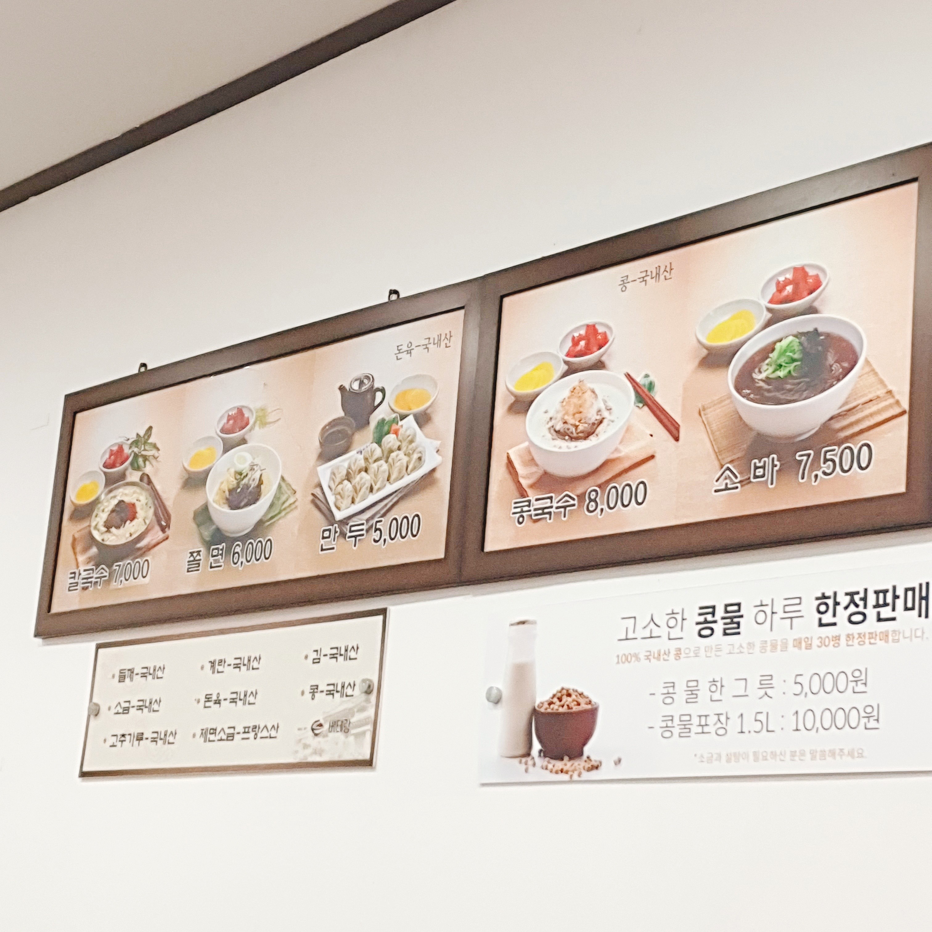 정말 간단한데요, 따뜻한 메뉴인 칼국수, 차가운 메뉴인 콩국수, 소바, 그리고 쫄면과 만두가 있었습니다.