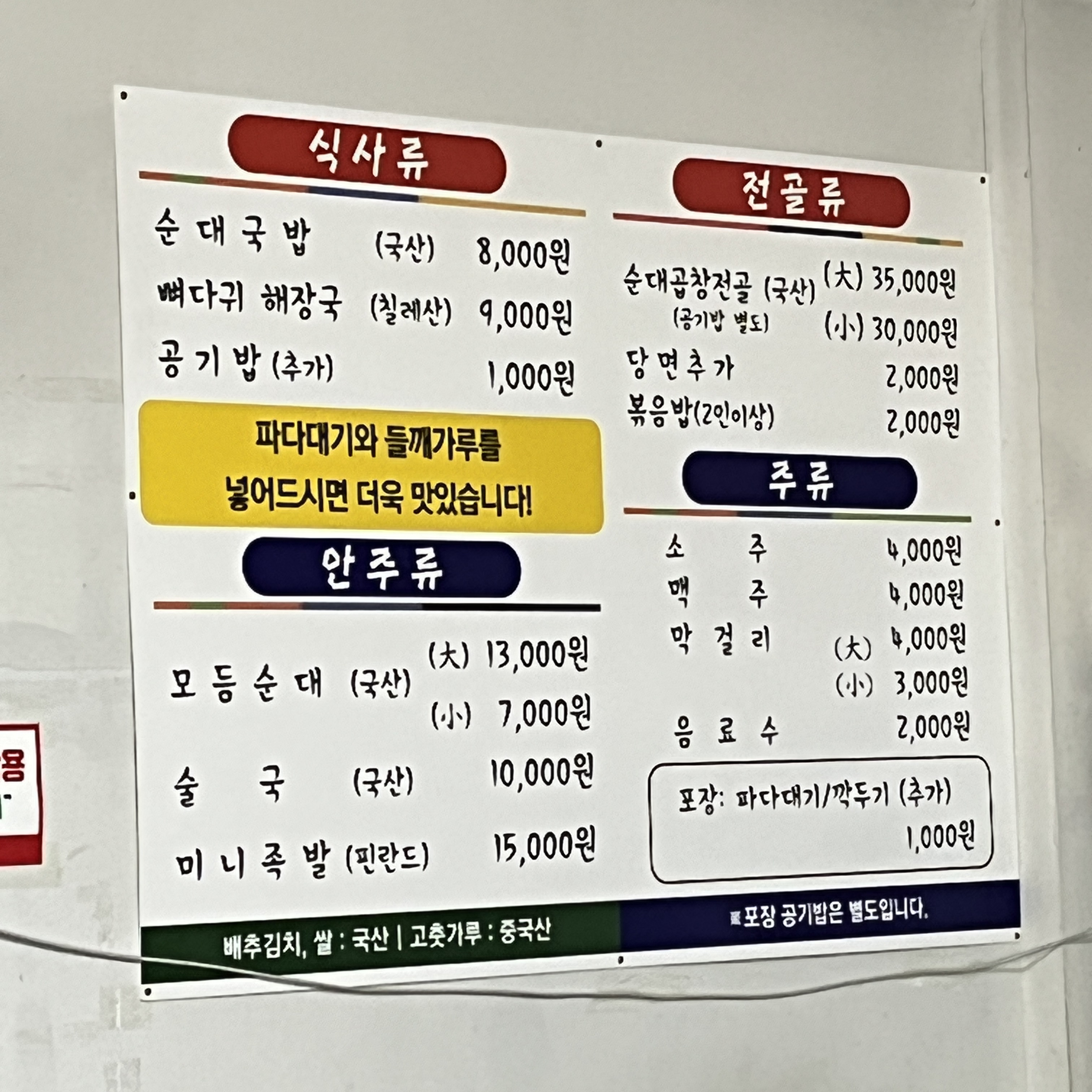 충남순대 메뉴입니다.