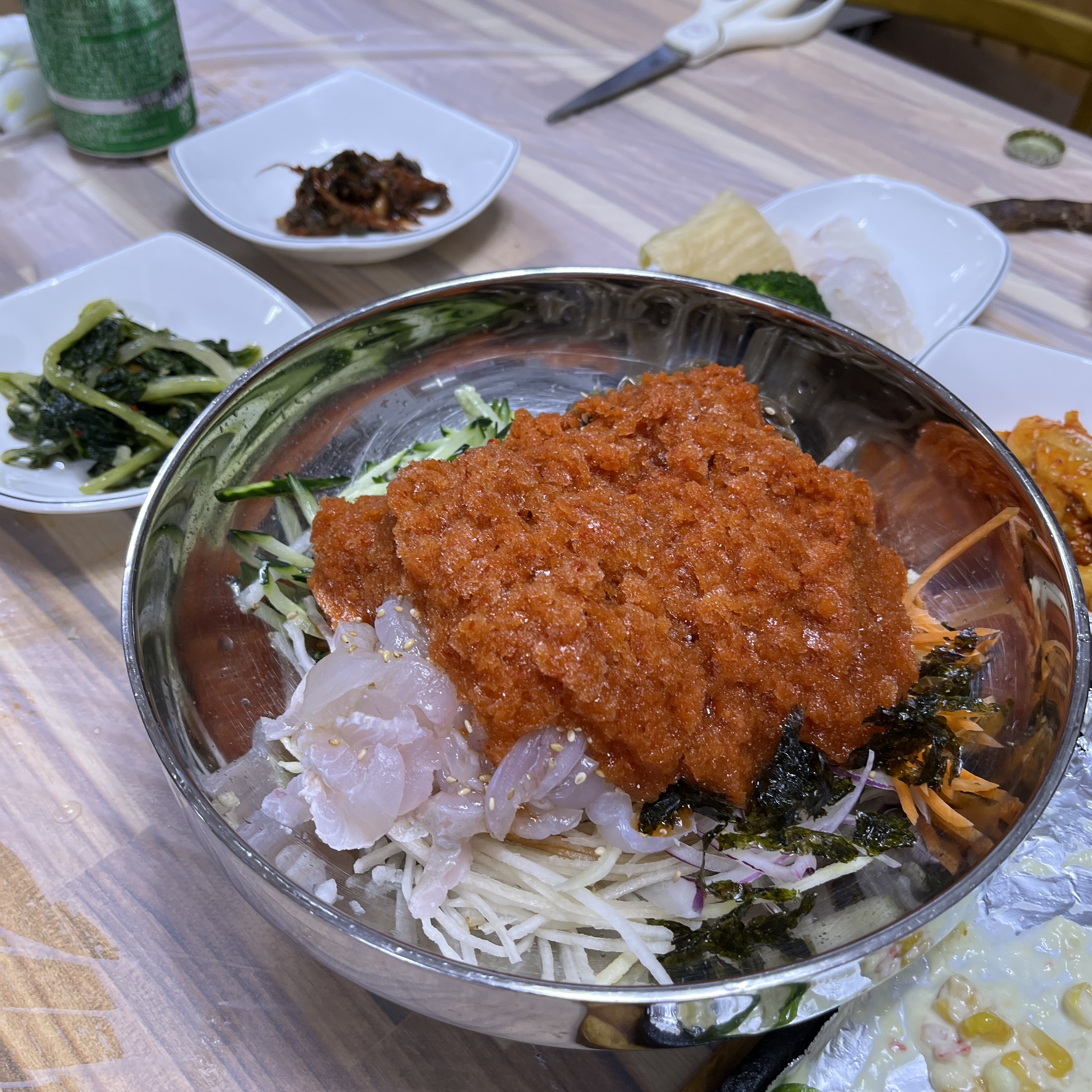 그리고 초장으로 양념된 회도 나오는데, 저거 먹으니까 물회가 너무 먹고싶어지더라구요.ㅋ