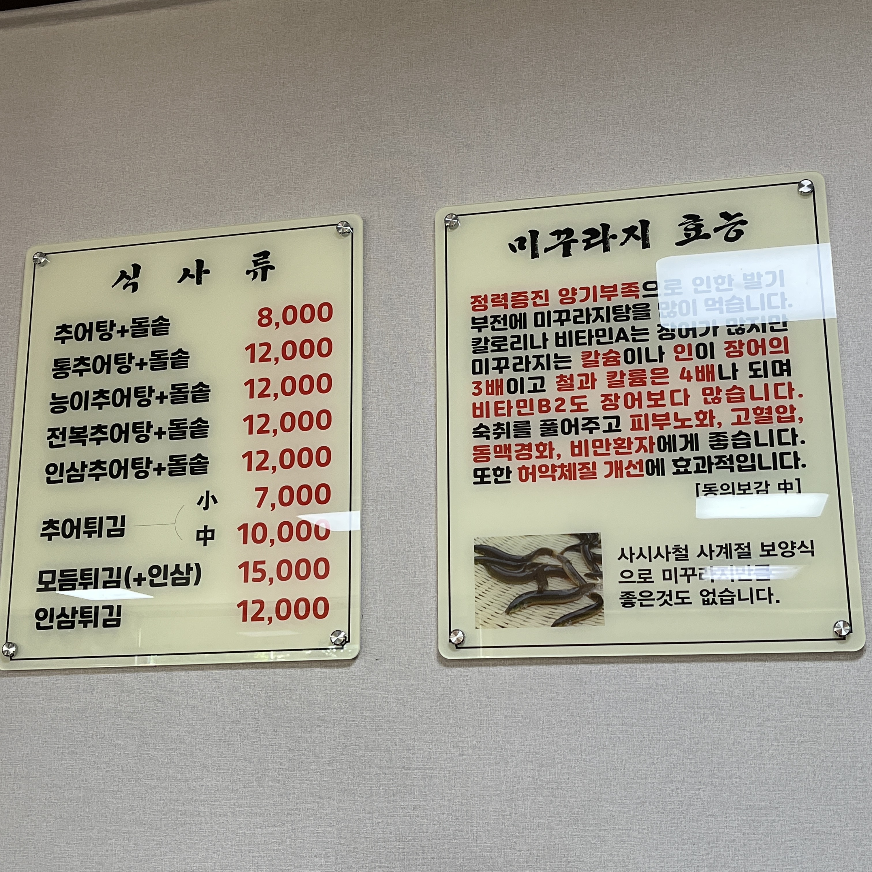 통추어탕, 능이, 전복, 인삼 등 추가재료 혹은 통으로 하면 4,000원이 추가되고, 추어튀김과 인삼튀김도 있습니다.