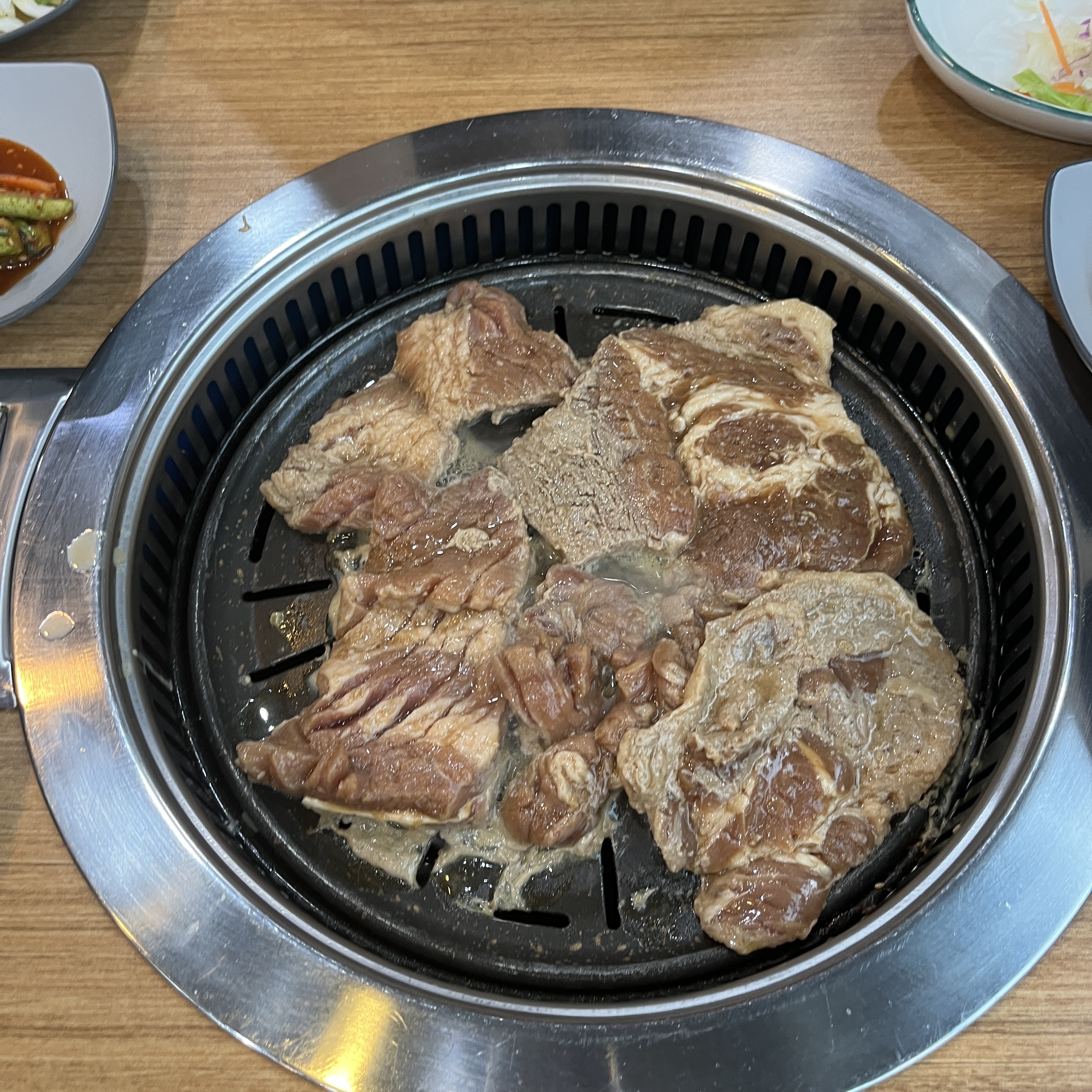 갈비가 나왔습니다. 500g 2인분이 딱 불판 하나에 가득 찼습니다.