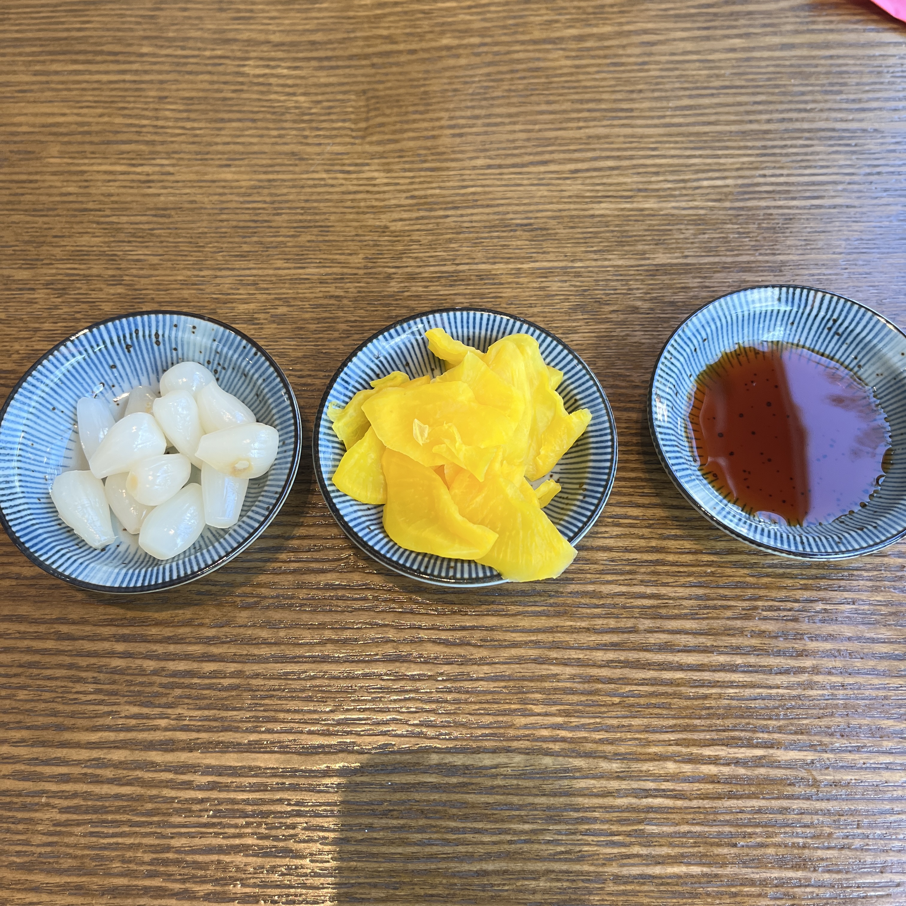 테이블엔 기본으로 물주전자, 락교, 초생강, 단무지 그리고 간장이 준비되어 있습니다.