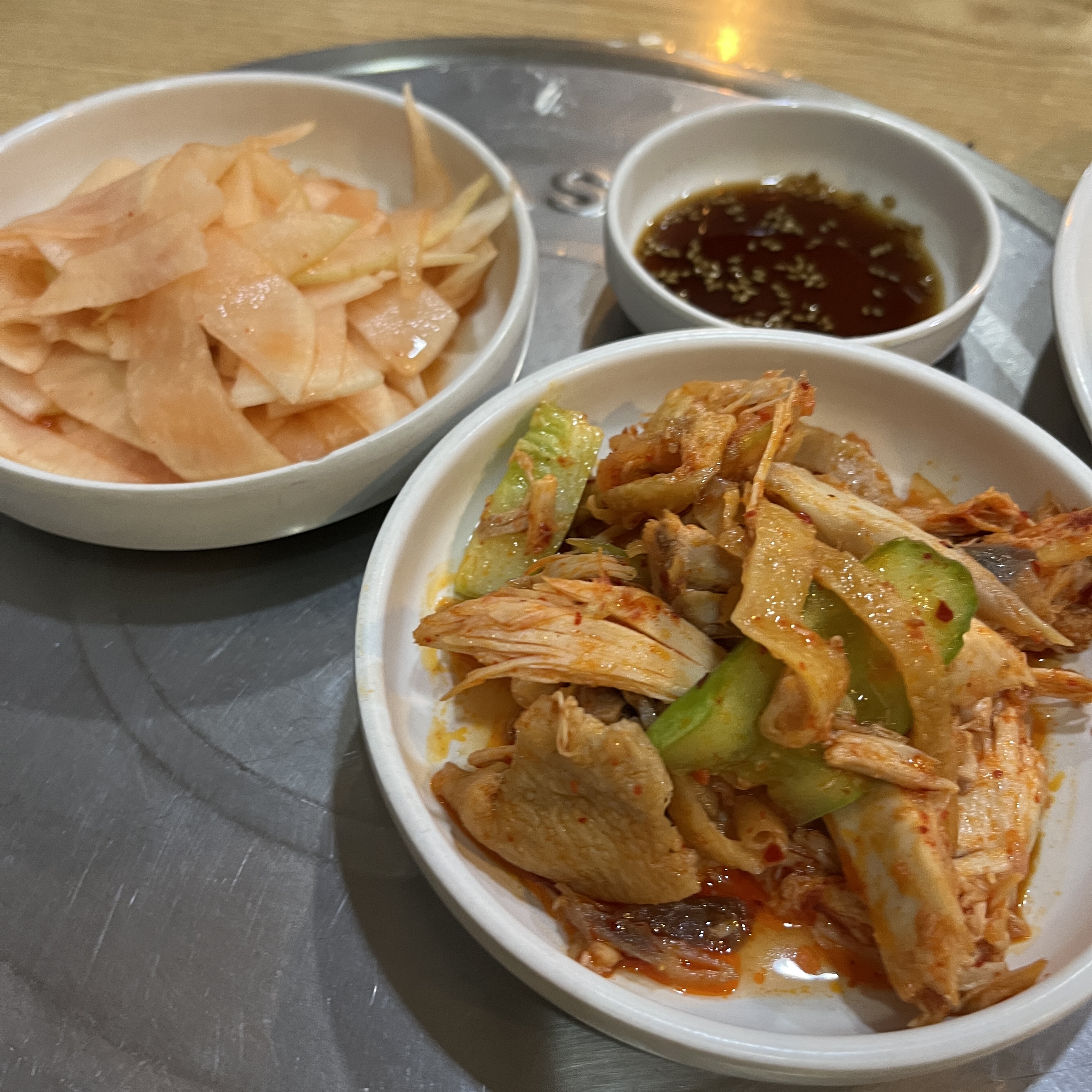 처음 반찬으로 주시는 닭무침. 이거 하나 있어도 소주 2병은 클리어할 수 있을 것 같은 맛이에요.