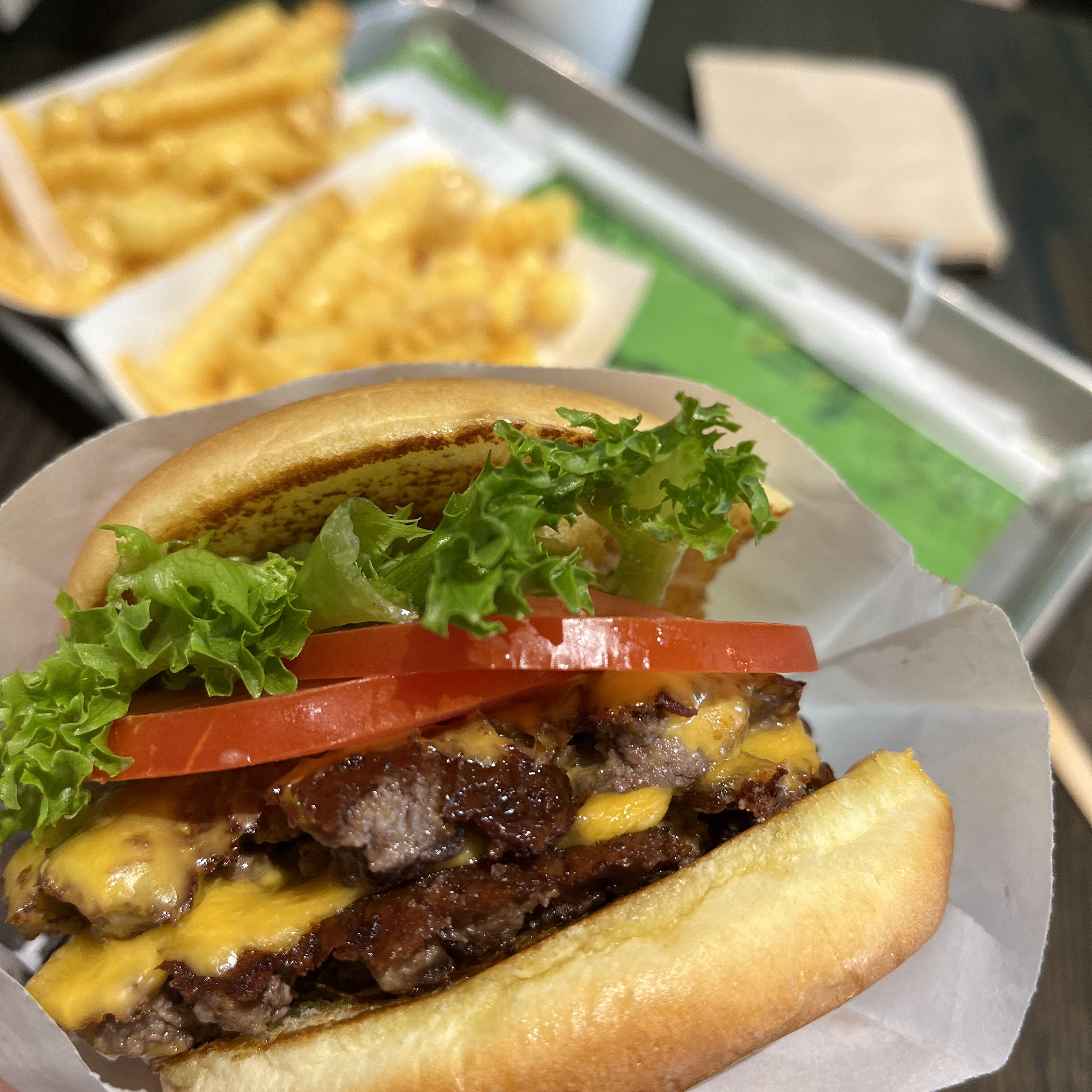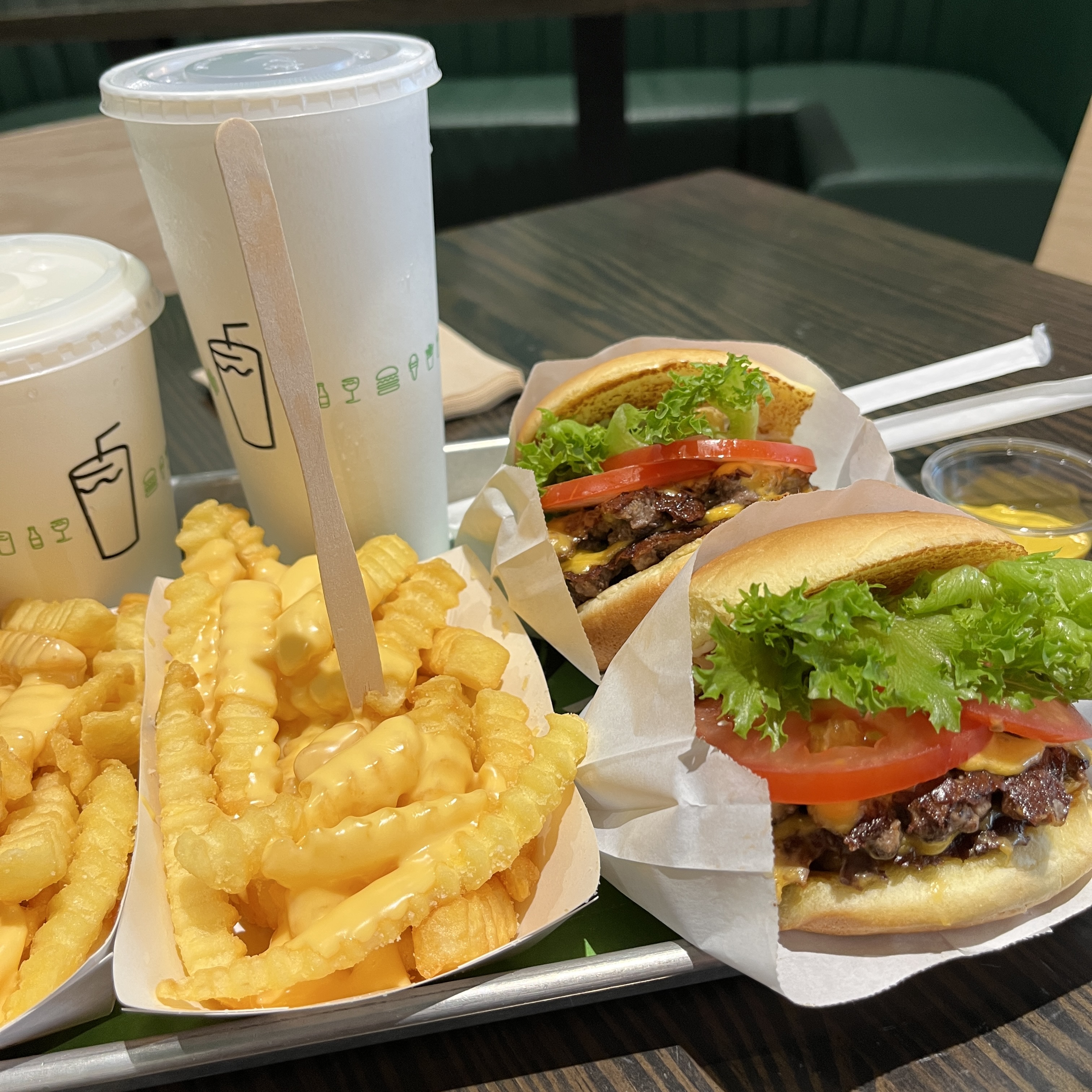 더블페티쉑버거 2개, 치즈프라이2개, 그리고 더 높이 올라와있는건 음료 라지사이즈고 작은게 밀크쉐이크입니다.