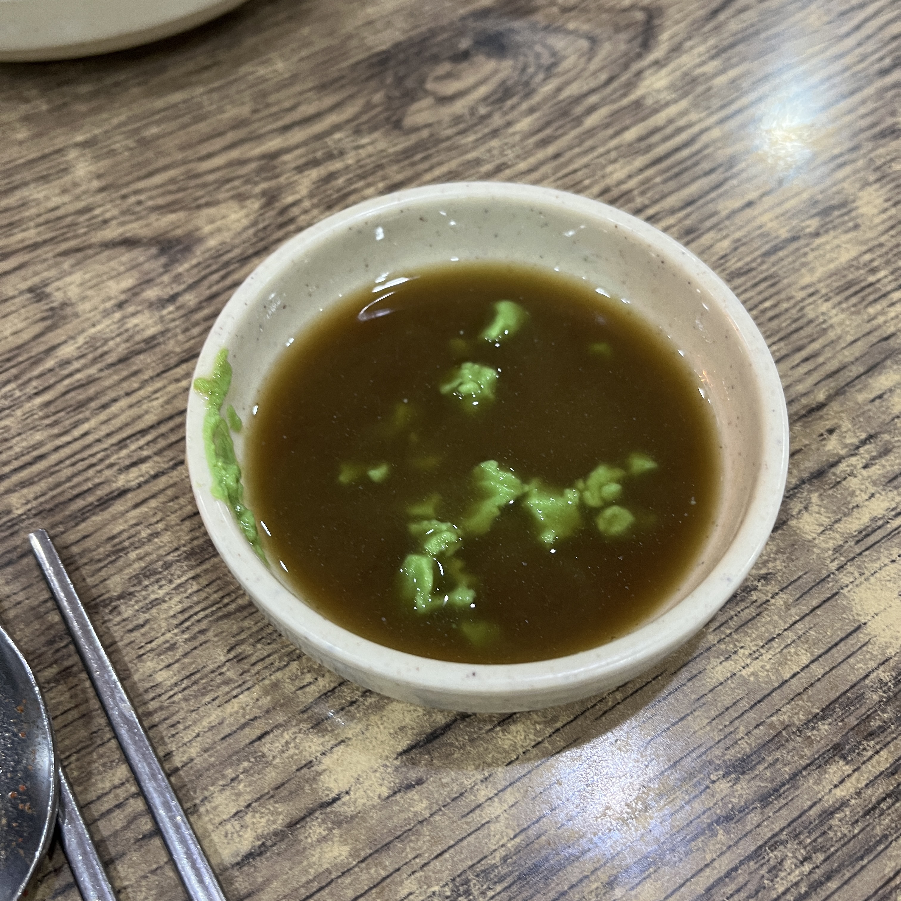 기본 간장소스에 새콤한 맛이 더해진. 보통 뼈다귀해장국 집에서 만나볼 수 있는 소스입니다.