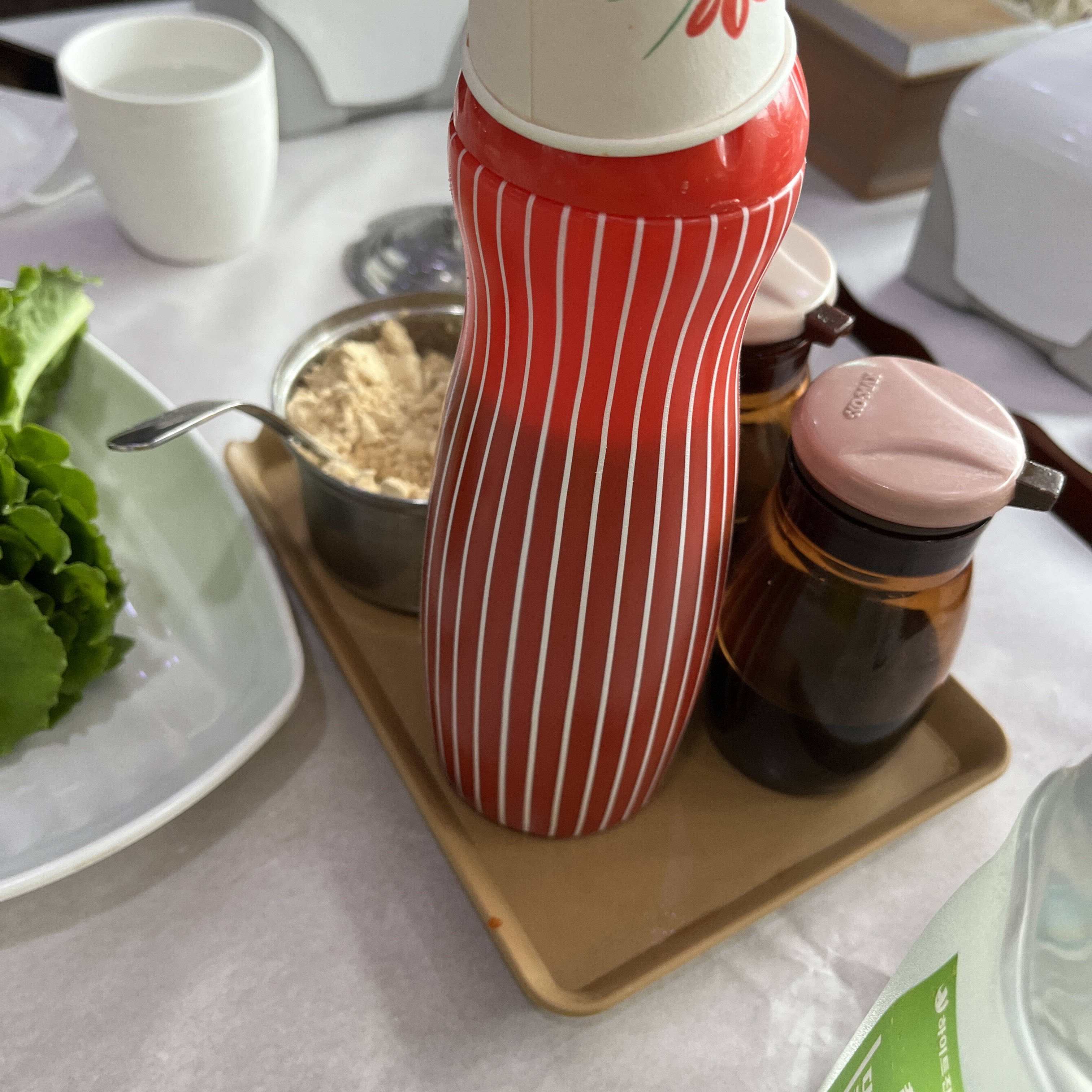 한켠에 마련된 콩가루, 초장, 간장, 그리고 참기름입니다.