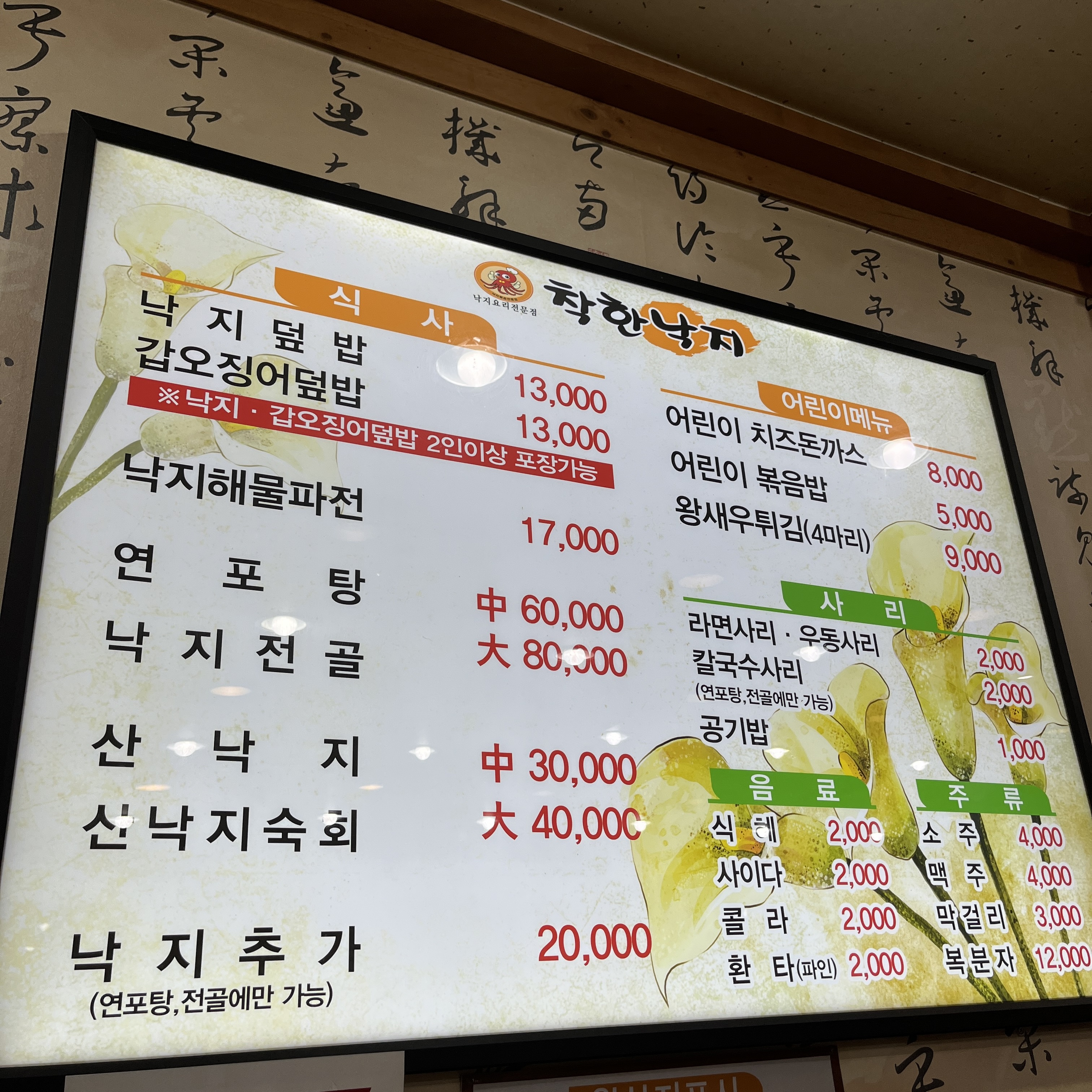 착한낙지 메뉴입니다.