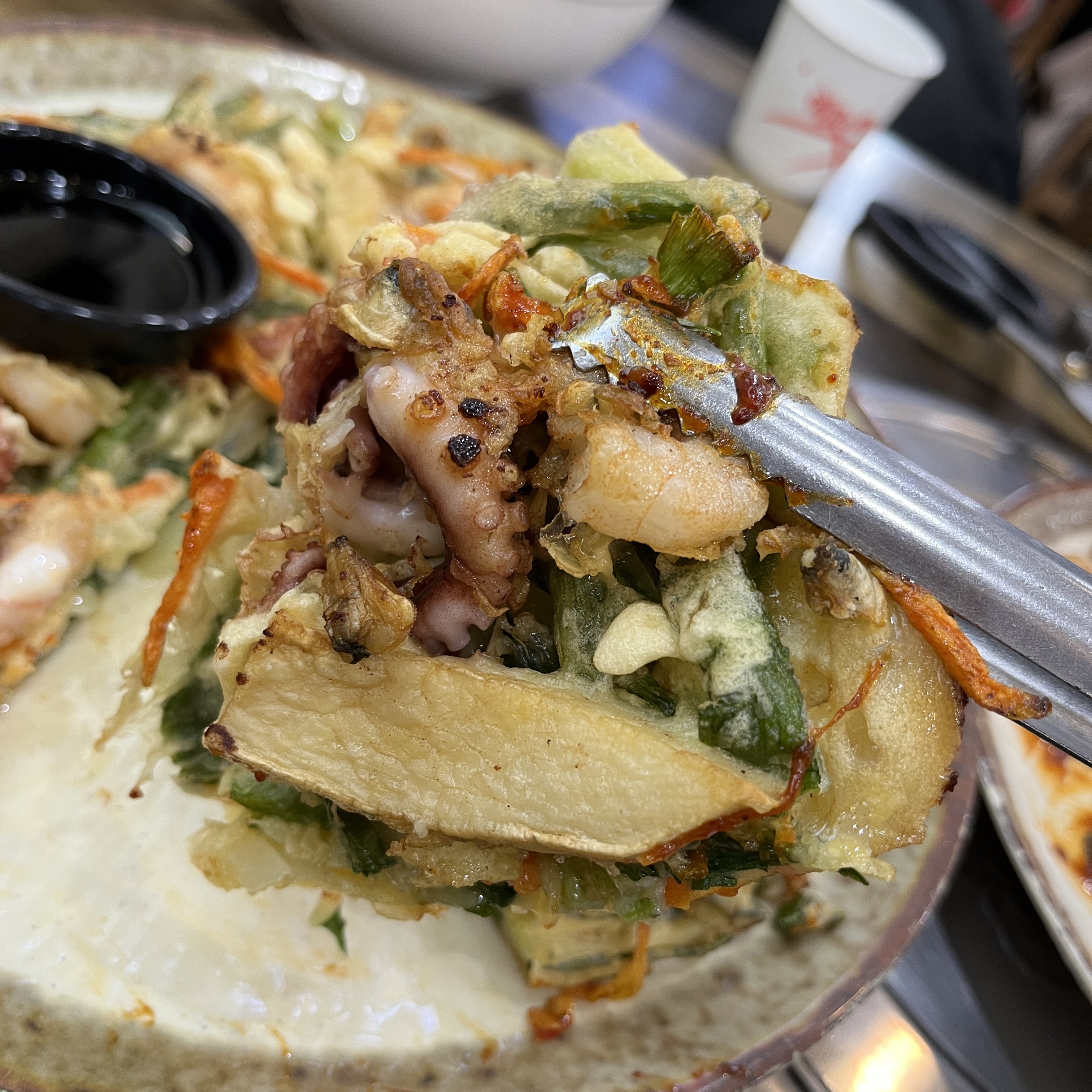 한 입 베어물면 야채튀김과 전이 혼합된 듯한 맛과 함꼐, 야채들에서 나는 달콤한 맛과 함께 해물들에서 느껴지는 해물맛까지.