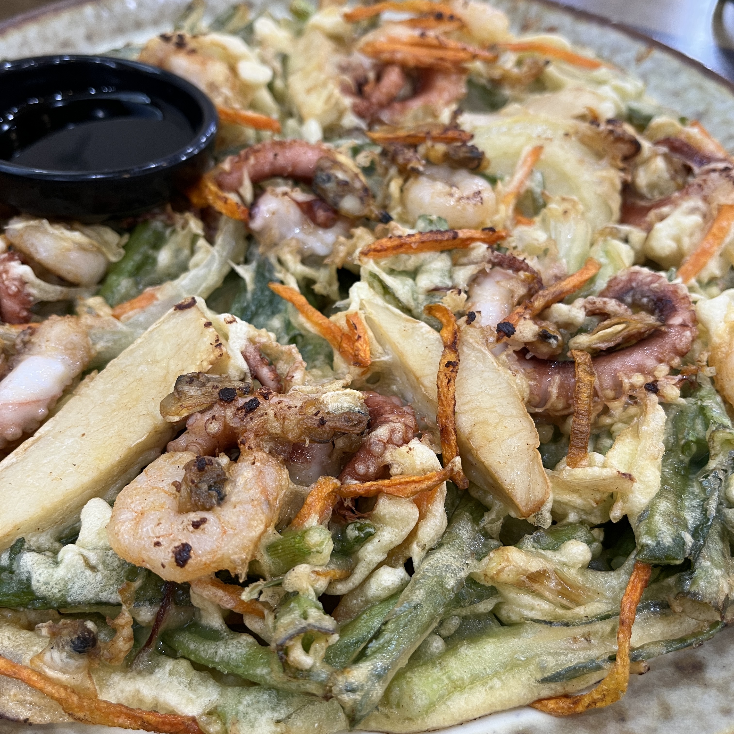 윗부분에 있는 새우, 새송이버섯, 낙지, 바지락, 파 등은 야채튀김 먹는 듯 한 느낌이고, 뒷면은 평소 먹던 '전'먹는 느낌이고.