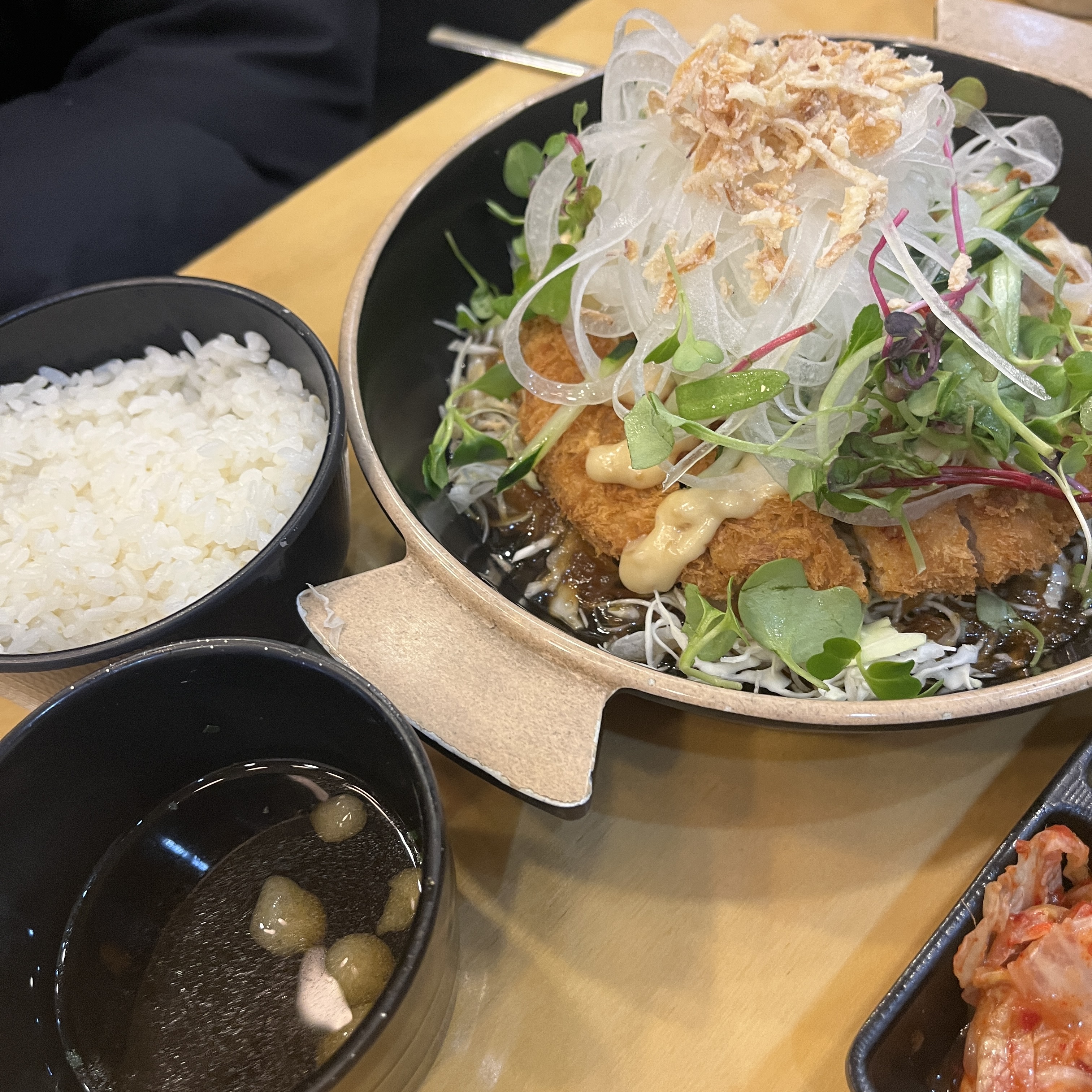 커다란 등심돈까스가 맛난 소스와 양배추 등 야채 위에 올라가있고, 그 위에 양념, 위에 새싹과 양파 그리고 마늘후레이크까지.