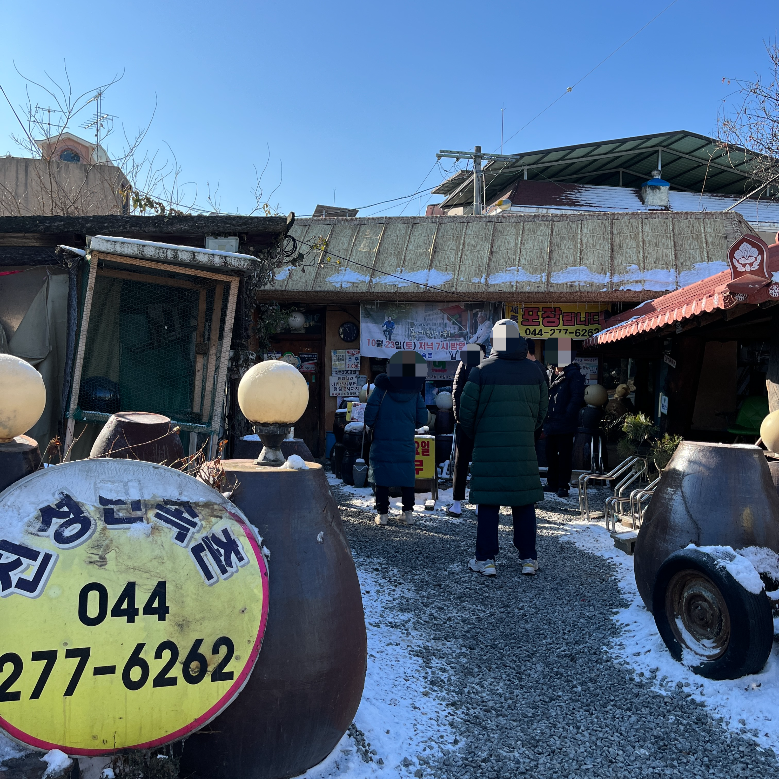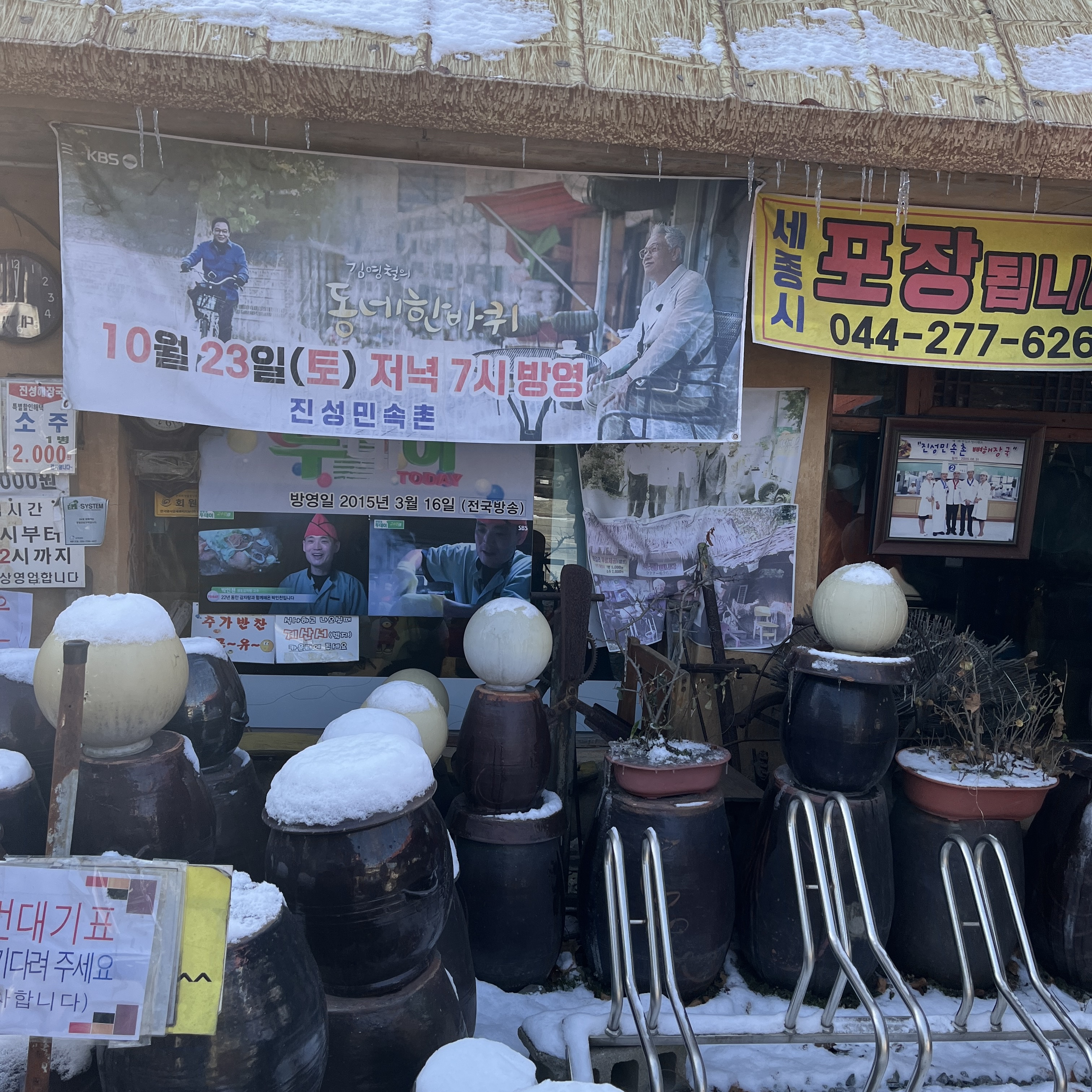 겉엔 항아리와 각종 옛날 쟁기들?이 있고, 가게도 한옥? 초가집? 같습니다.